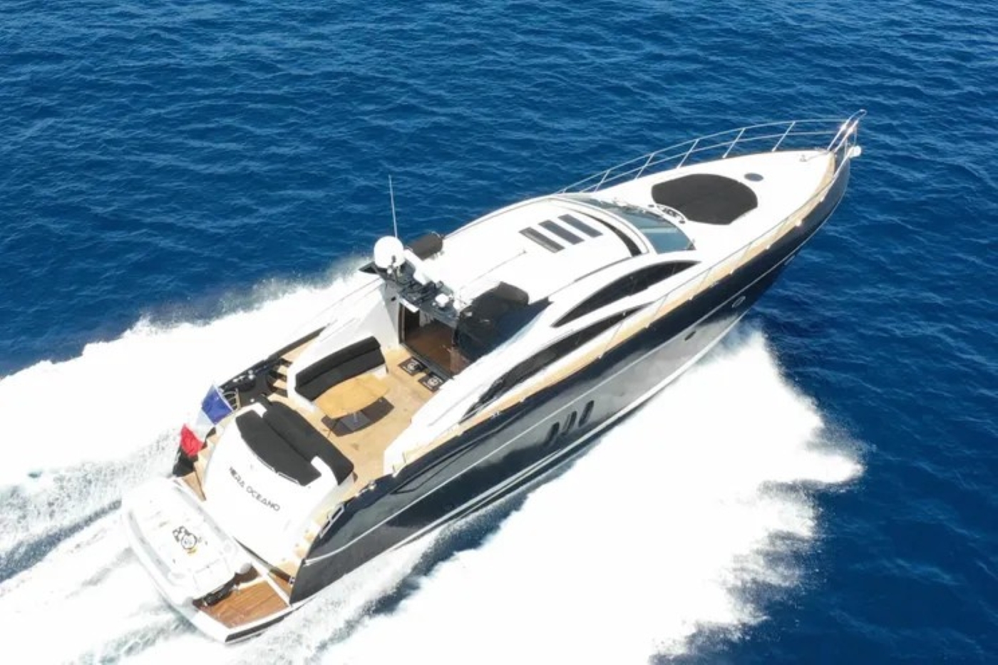 Motor yacht NERO OCEANO is a 21.90 m (71' 10") Sunseeker 72 offering the ultimate in comfort for intimate groups on board a sporty and luxurious charter yacht. She presents with striking paintwork in gleaming white with a deep blue hull stripe and offers accommodation for up to three guests in a double and twin cabin. She was refitted in 2024.