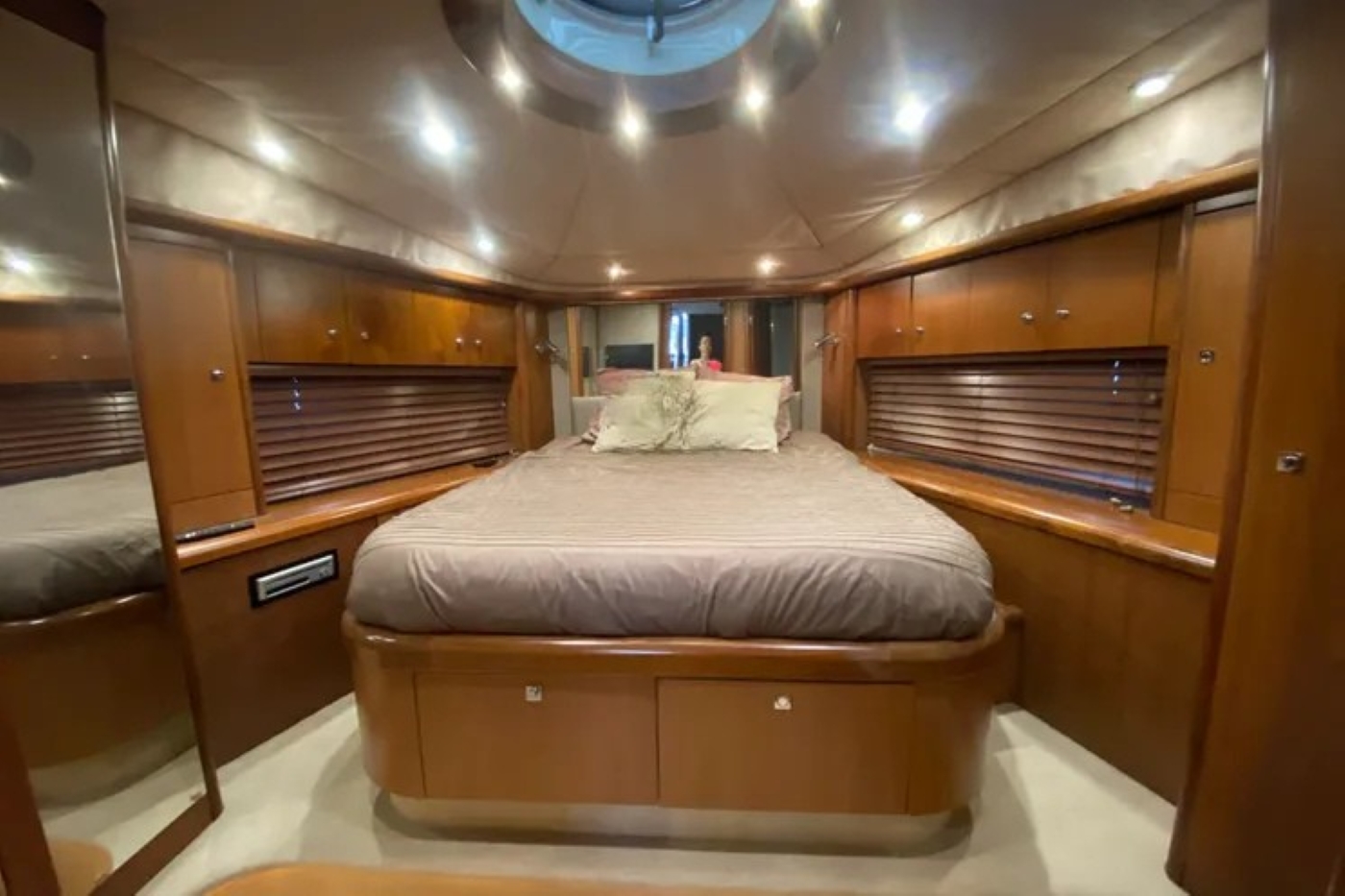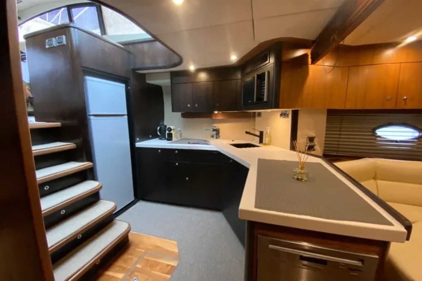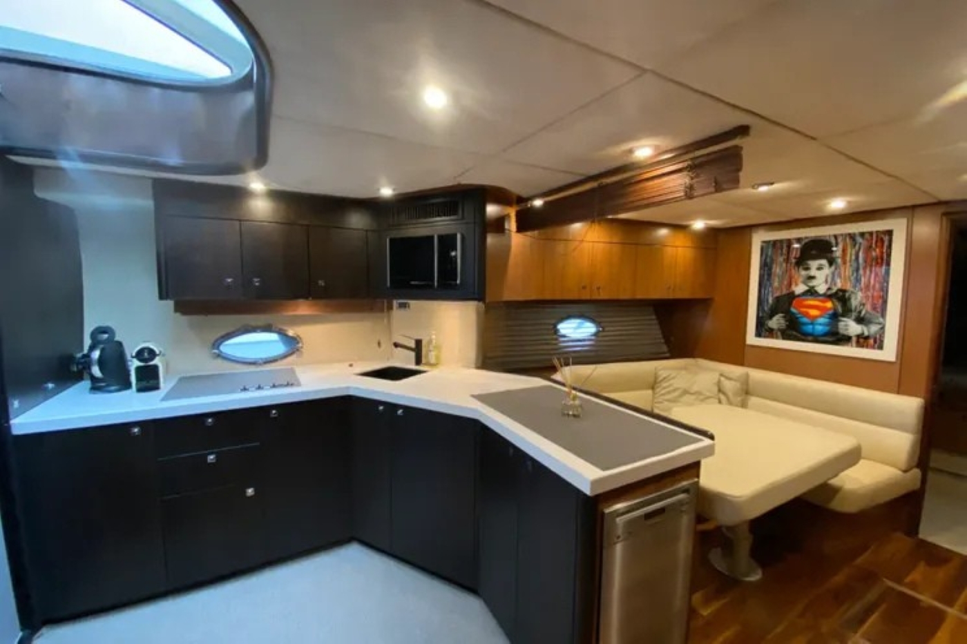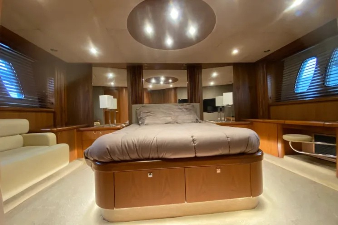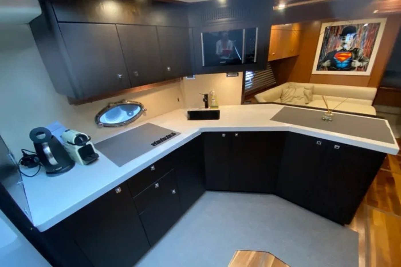 The main deck salon is open to the aft deck which creates a large entertainment area. The salon is configured with a u-shaped sofa surrounding a flexible table, plus there are two armchairs which are moveable for convenience. Forward in the salon is the helm with a captain’s seat and a companion bench with a foldable seat.