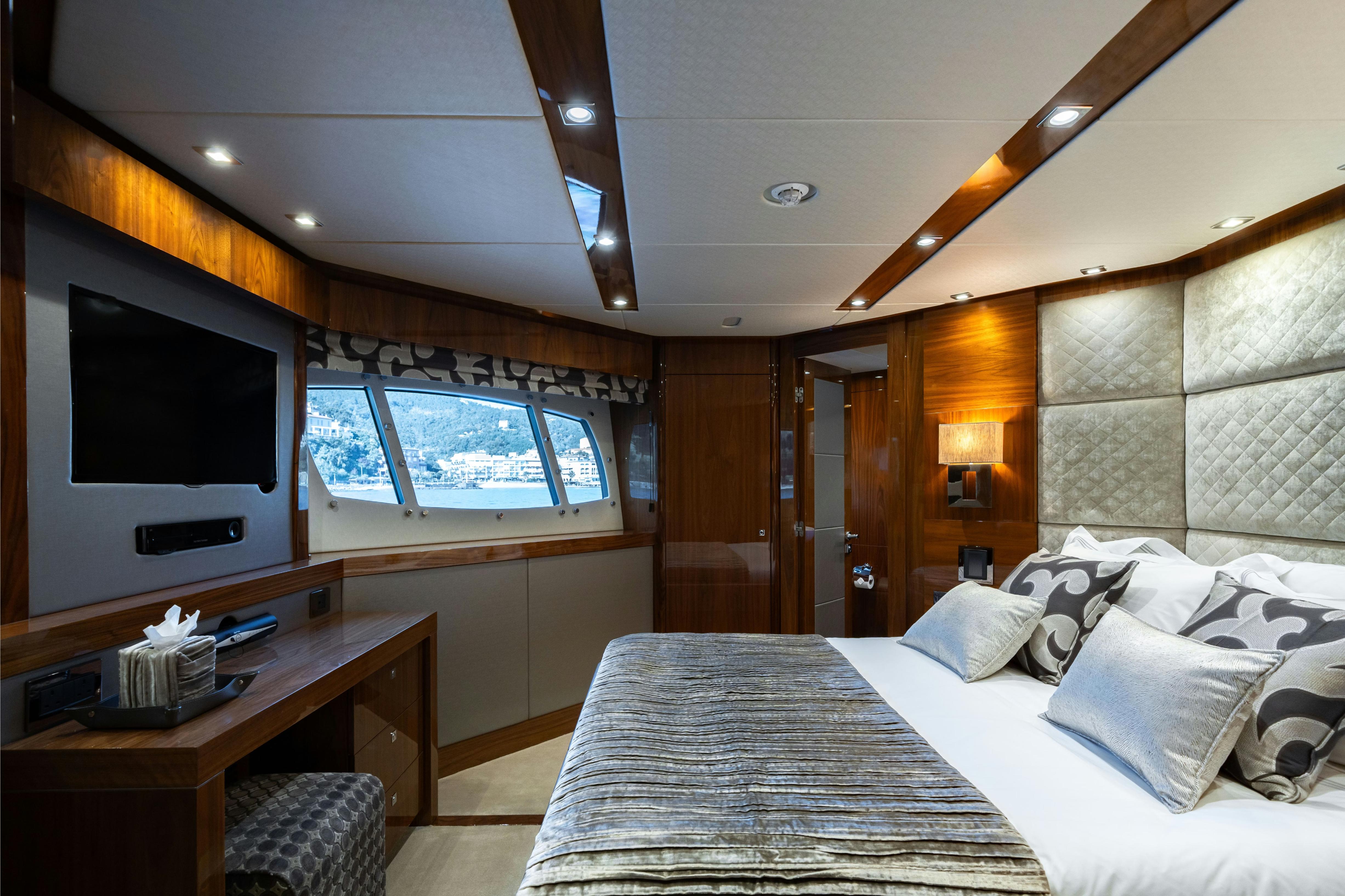 The accommodation sleeps a maximum of 10 guests over 5 en-suite cabins: 1 Master suite, 2 double cabins and 2 twin cabins convertible to doubles. The main deck Master suite is placed forward and has its own en-suite bathroom. The bedroom is furnished with a desk, a widescreen TV opposite the king-sized bed and a sofa for private relaxation at the end of a busy day. The lower deck contains the double cabins and the twin cabins, all of which have en-suite bathrooms and TV entertainment.