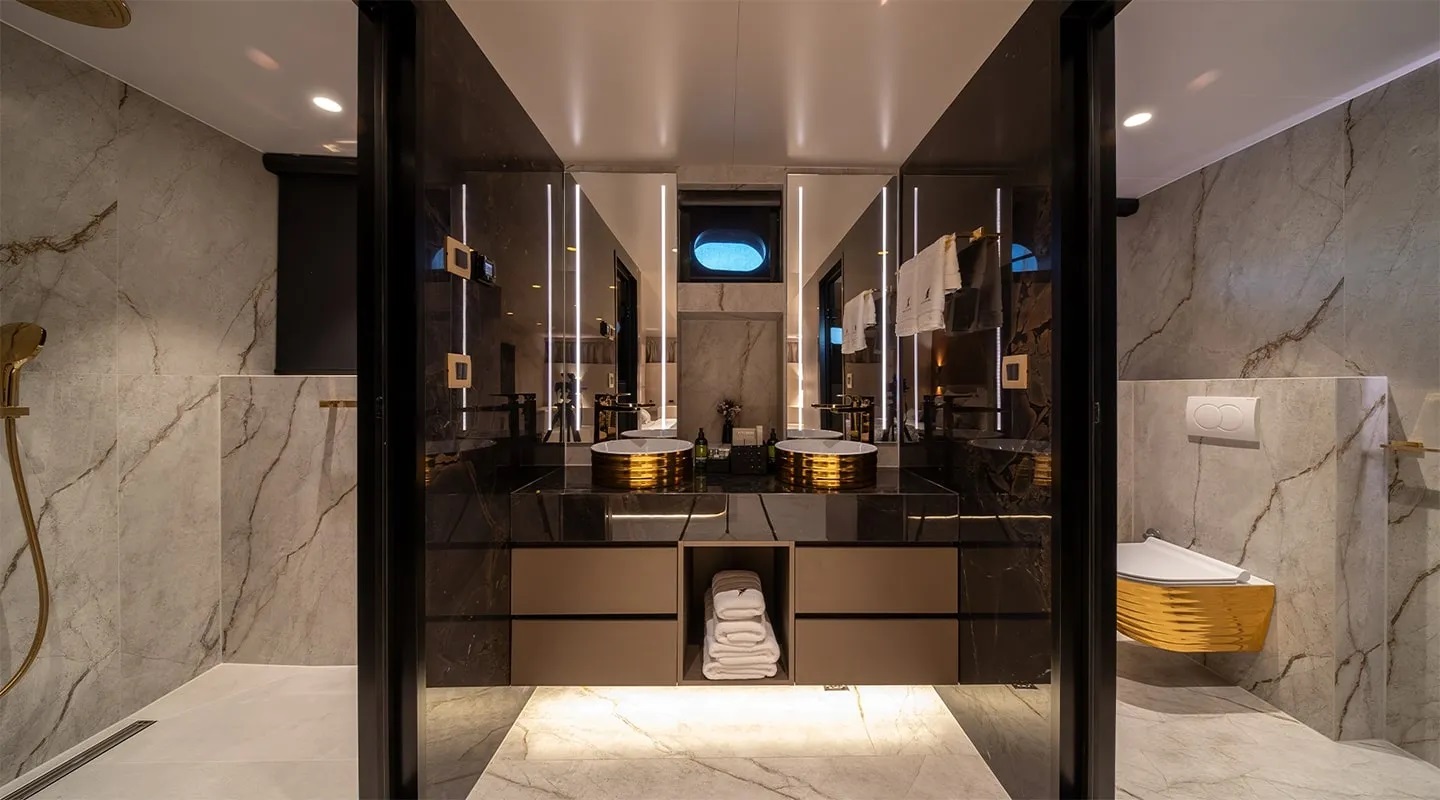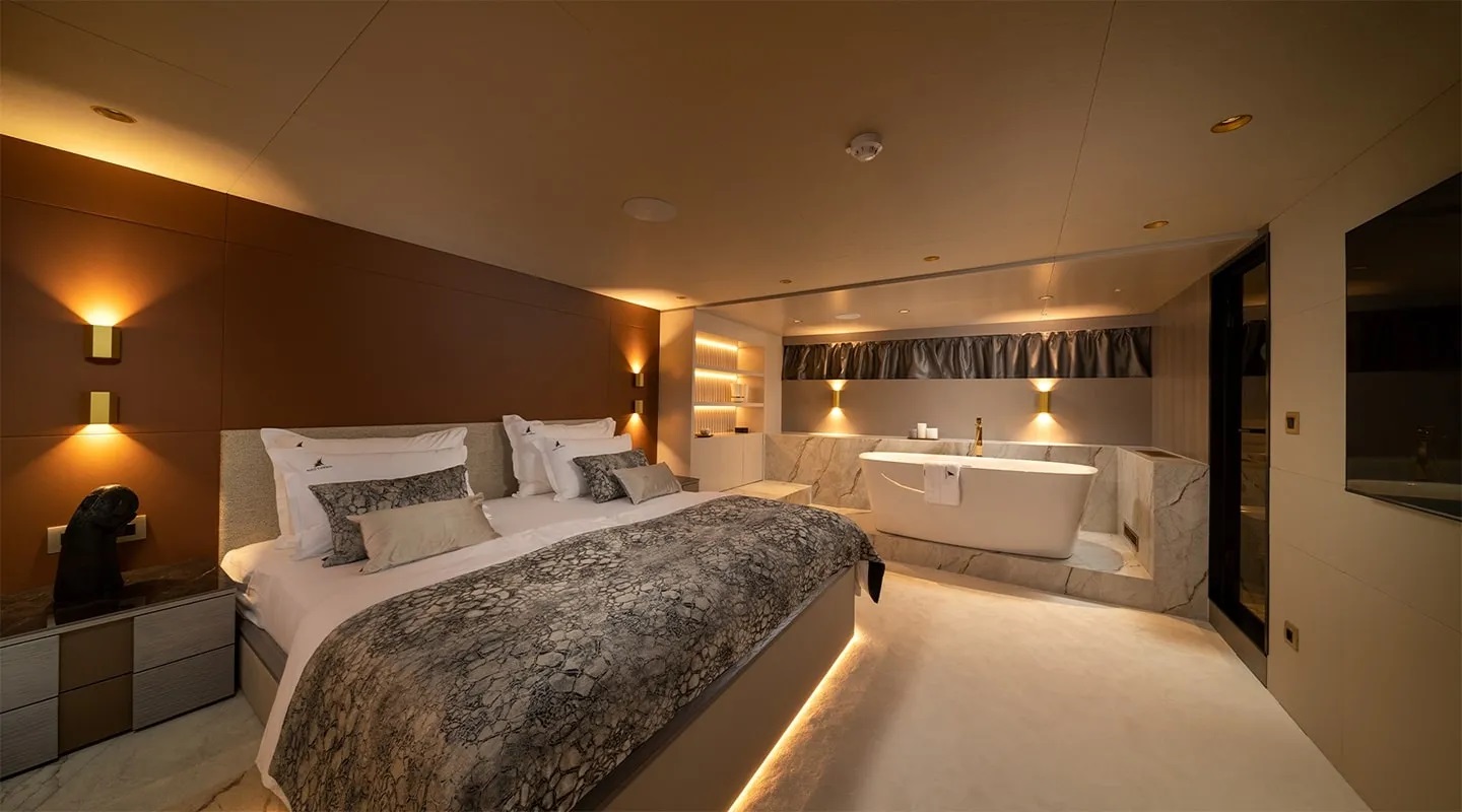 The master cabin is a haven for primary charter guests with a king-sized bed, lounge area, massage bath in the main area and a separate ensuite with shower room. The VIP cabin is another huge suite which also boasts a king-sized bed, lounge area and ensuite. There are two further double cabins with queen beds and two twin/double convertible cabins all with ensuite bathrooms. All the suites are presented with a selection of toiletries, hair dryers, TVs and individually controlled sound systems.