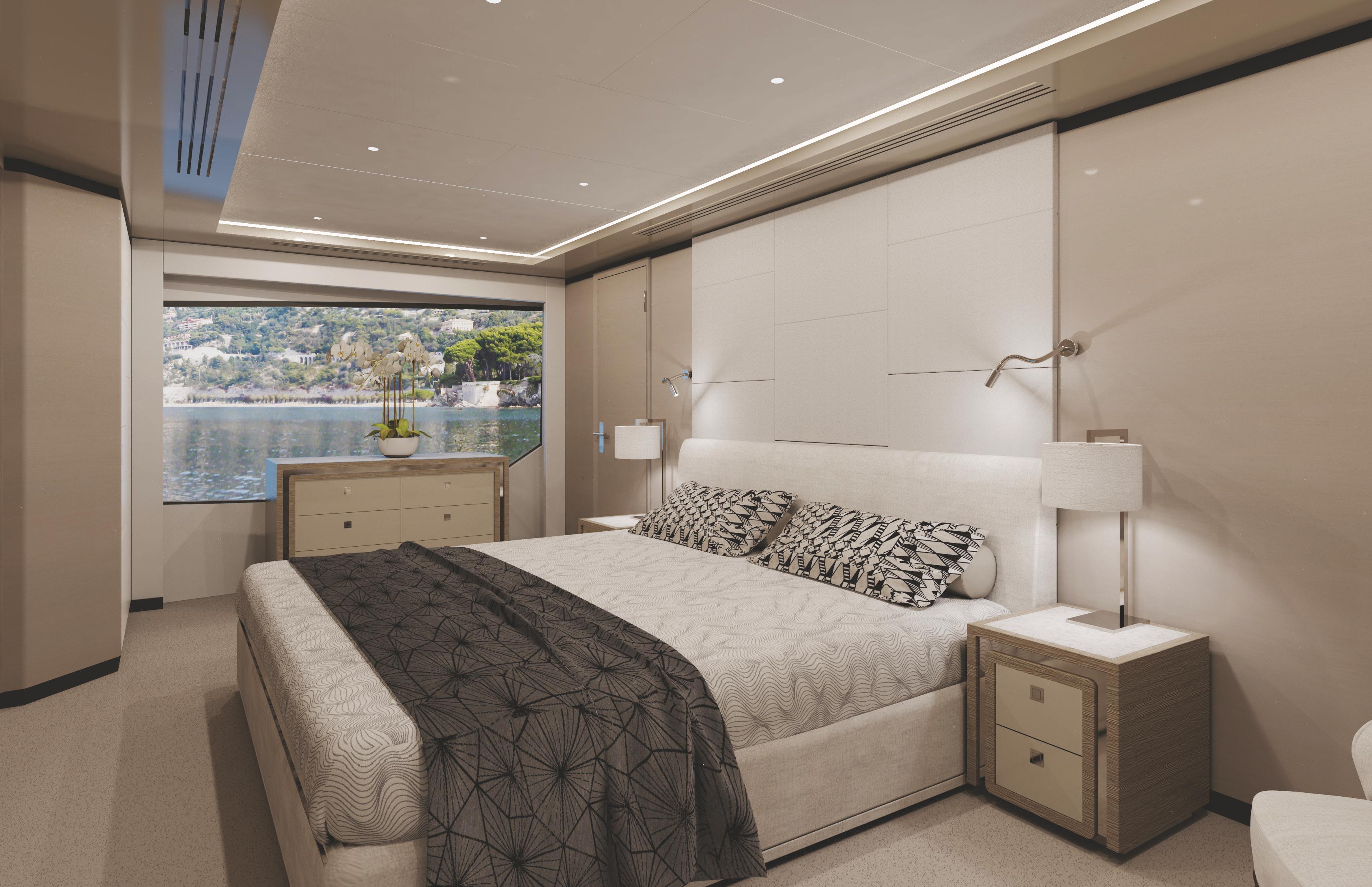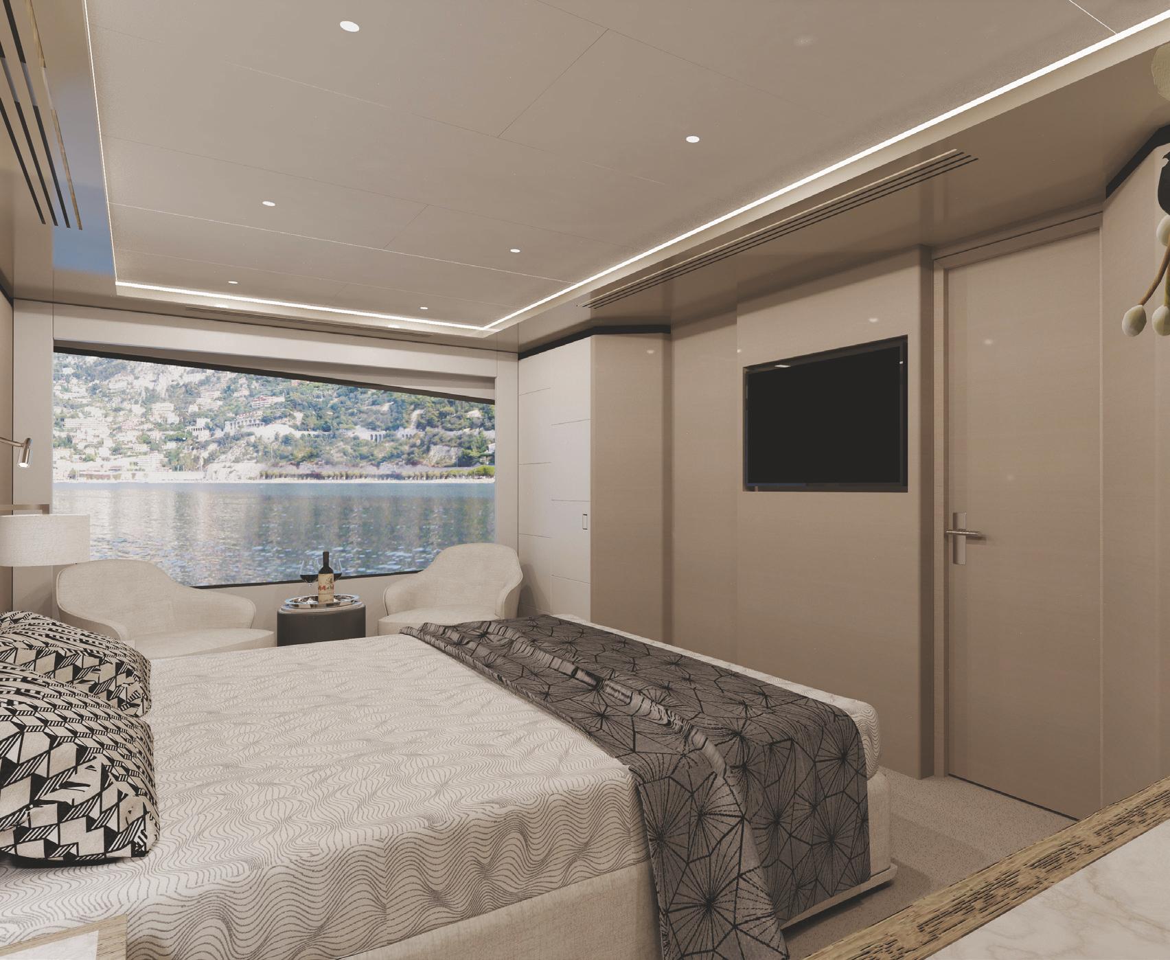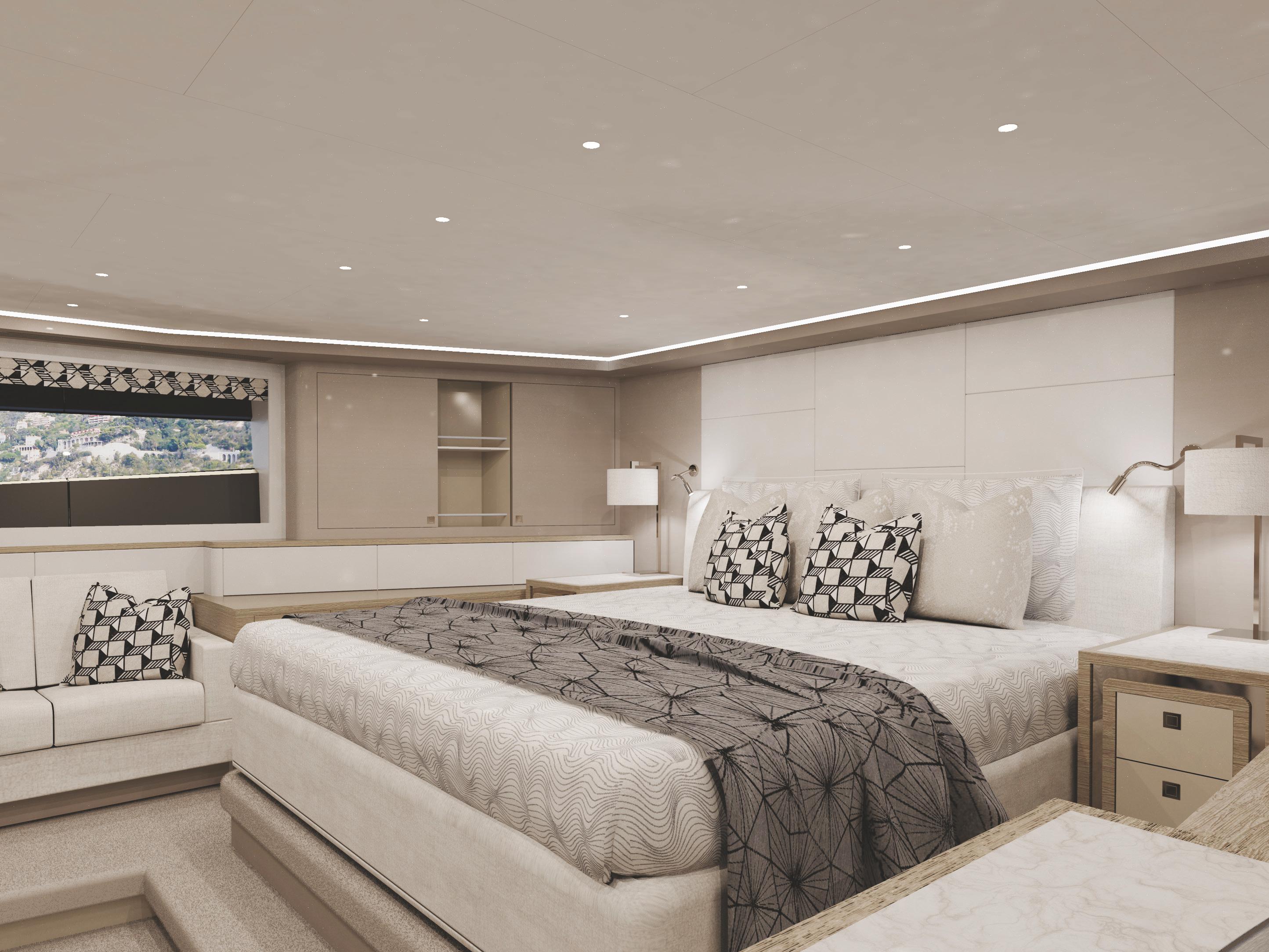 The accommodation sleeps a total of 8 guests across 5 en-suite cabins: 1 Master suite, 1 VIP stateroom, 1 double cabin and 2 twin cabins. ~ The Master suite is situated on the main deck forward and is fitted with a king-sized bed, widescreen TV, two armchairs and a side table, ample wardrobe space and an en-suite bathroom with two sinks, a toilet, bathtub and shower. ~ On the lower deck, the VIP stateroom is in the bow and is furnished with a queen-sized bed, widescreen TV, sofa, plenty of storage and an en-suite bathroom with a sink, toilet and shower. ~ The double cabin has a queen-sized bed, widescreen TV, wardrobe and an en-suite bathroom with a sink, toilet and shower. ~ The twin cabins both have two single beds, a widescreen TV, ample storage and an en-suite bathroom with a sink, toilet and shower. ~ The experienced crew of 4 will ensure that every guest is well taken care of throughout their stay.