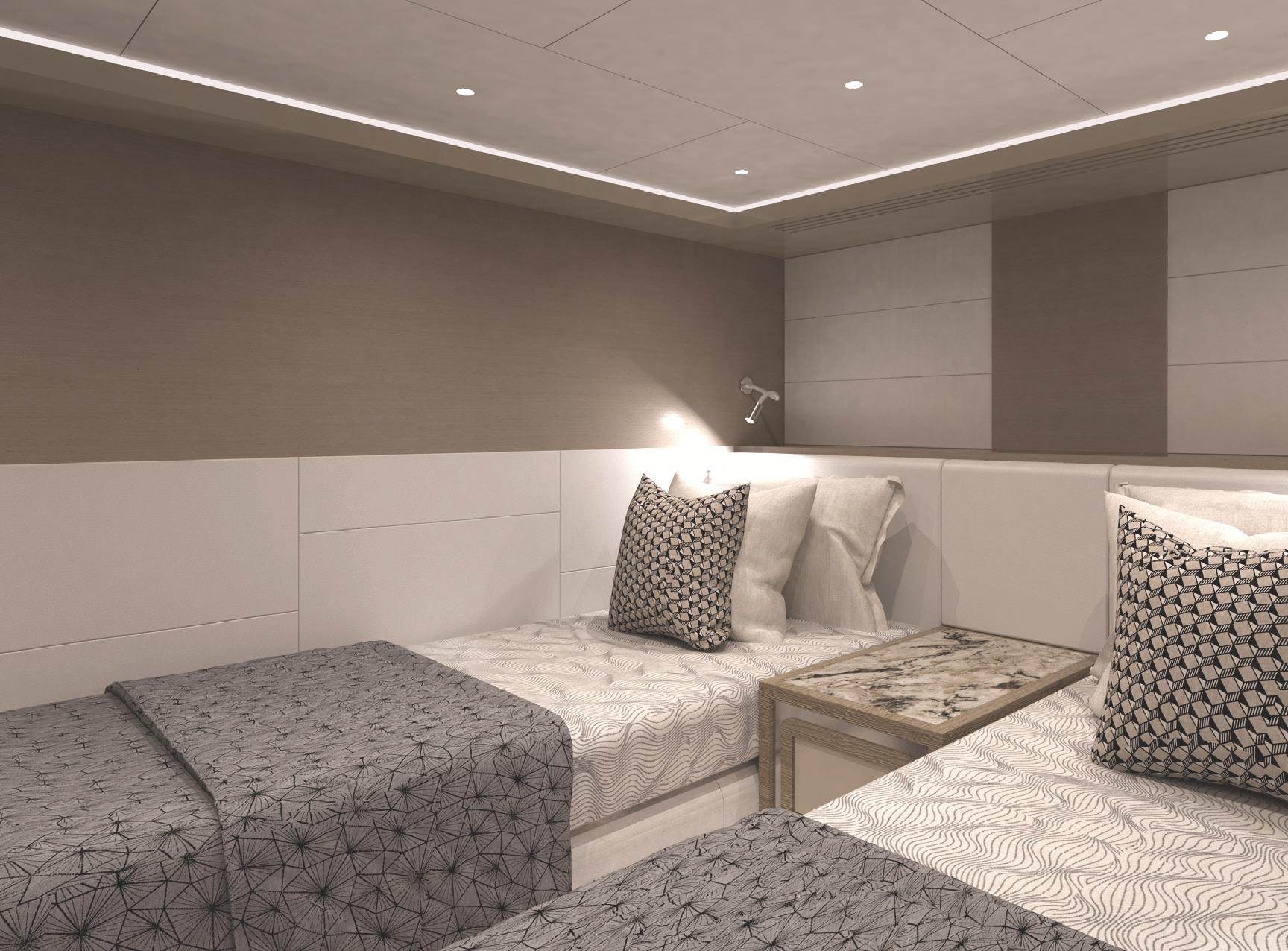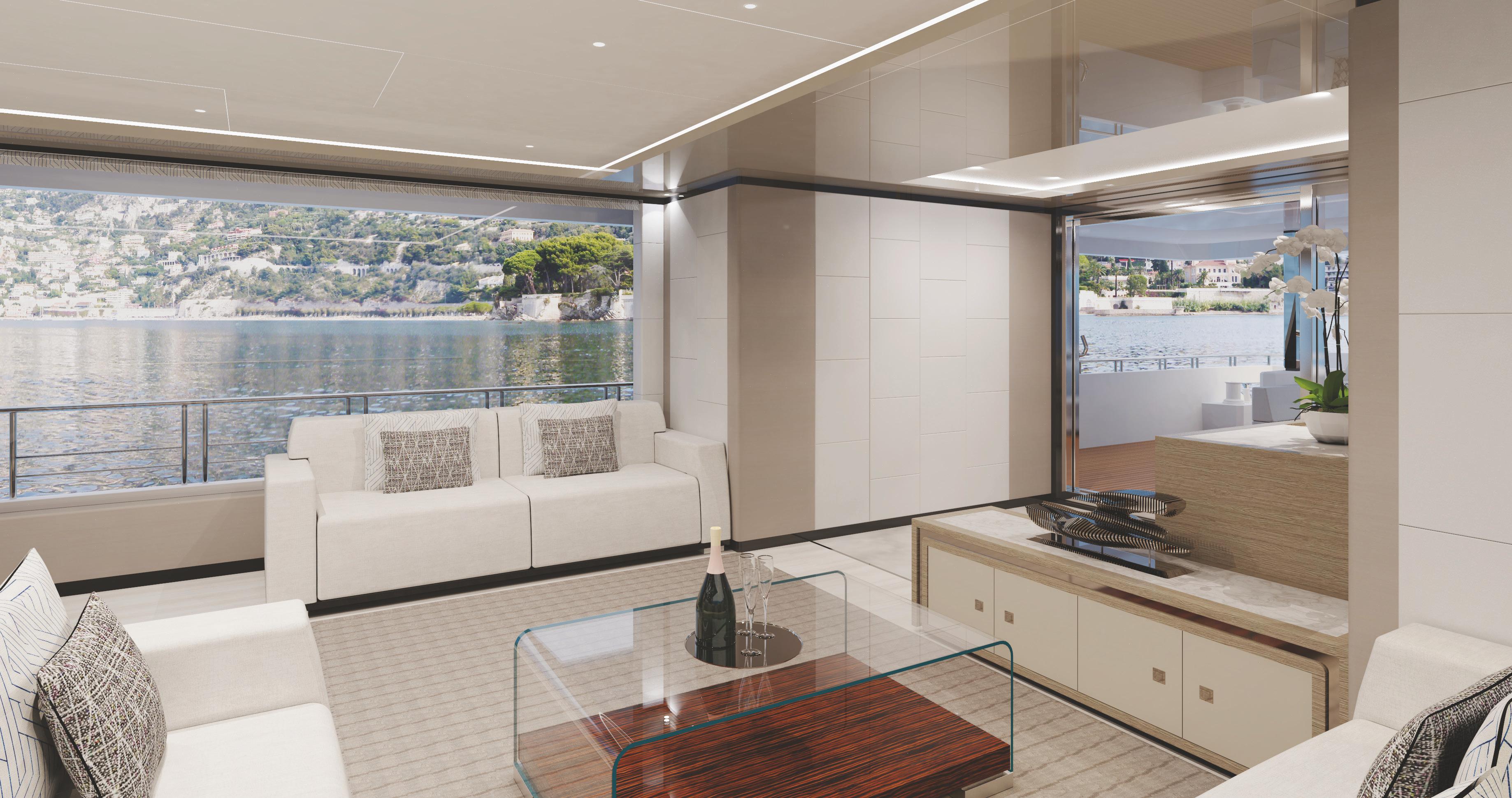 The lower deck layout places the guest accommodation forward with the engine room behind, followed by the crew accommodation, mess and laundry facilities with the beach club in the stern. The beach club has a corner sofa and coffee table to port with glass sliding doors allowing this space to be used in less clement weather.