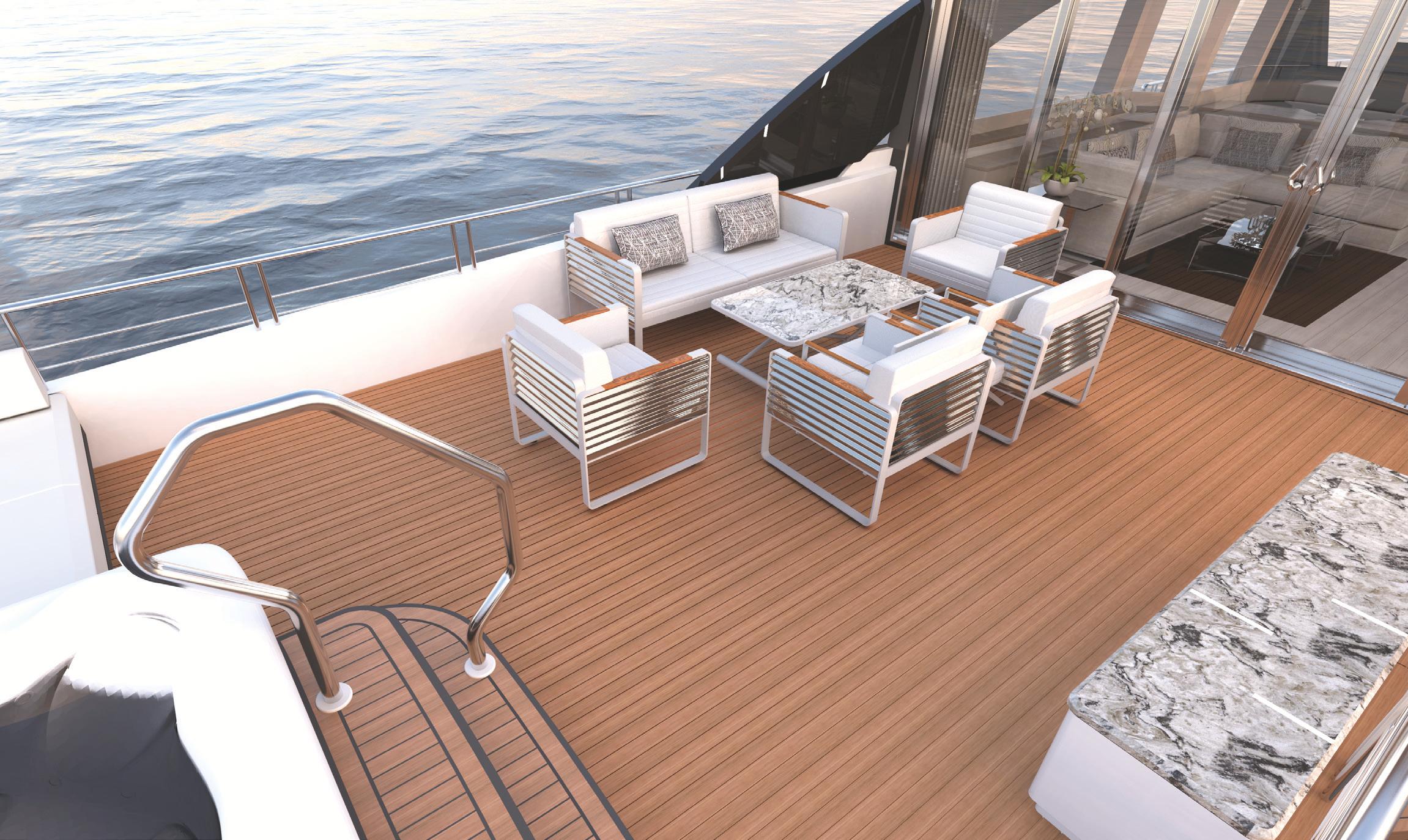 The upper deck aft is a desirable alfresco social spot, offering a Jacuzzi and sunbeds along the stern, a casual seating and dining area to port and a wet bar to starboard.