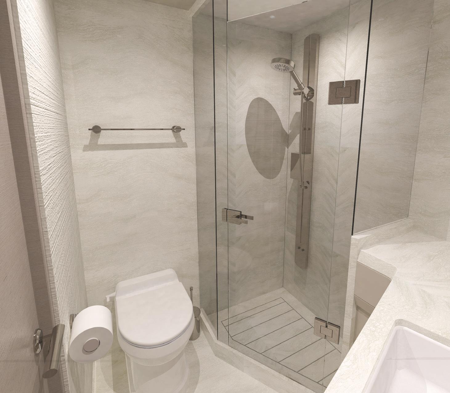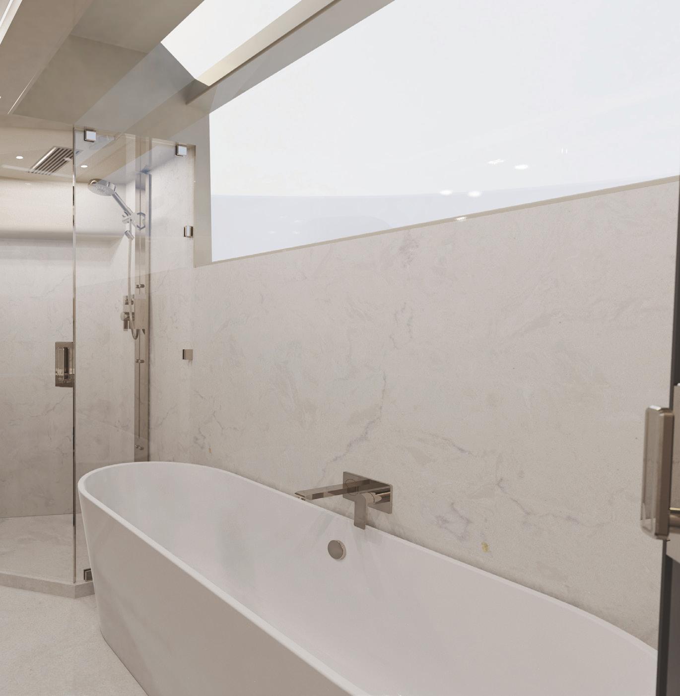 On the main deck, the Master suite is forward with the galley amidships to port with a corner sofa, table and widescreen TV for casual dining. The main foyer with day head is amidships to starboard, and both lead through into the formal dining area combined with the main salon. The formal dining area seats up to 10 guests around a grand table, and when opened the glass doors to port and starboard allow for a greater connection to the anchorage. The main salon has an aft-facing corner sofa and coffee table fitted beneath the port windows, and a loveseat to starboard along with a widescreen TV. A wet bar is placed between the main salon and the doors out onto the main deck aft.