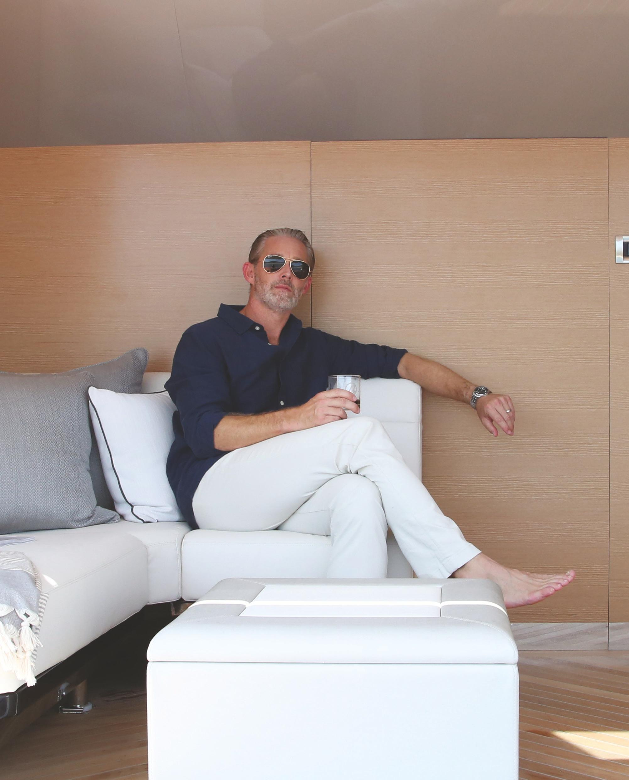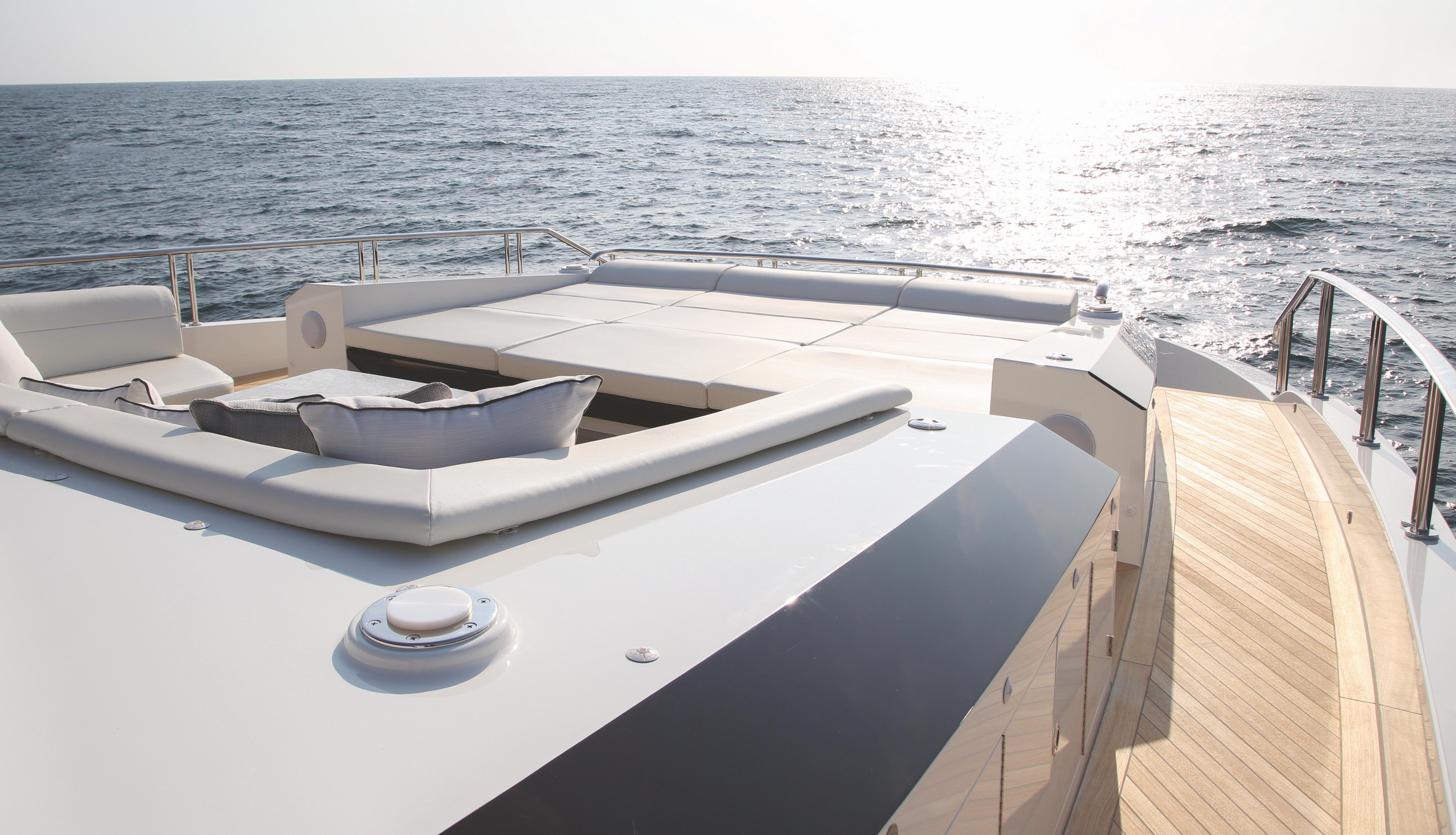 The foredeck has a C-shaped sofa and coffee table in front of the bridge controls, and a broad sunbed covers the bow section for guests to unwind under the sun or the stars.