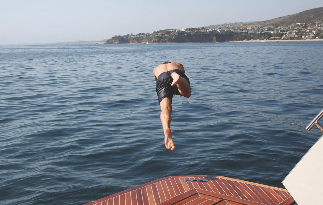 The spacious swim platform is ideal for lounging and sunbathing beside the water with direct access to the beach club. Two stairways connect up to the main deck aft, where a sofa and elevated table create a comfortable place for alfresco dining. A starboard stairway from the main deck aft connects to the upper deck aft, and along the main deck two stairways lead up to the foredeck.