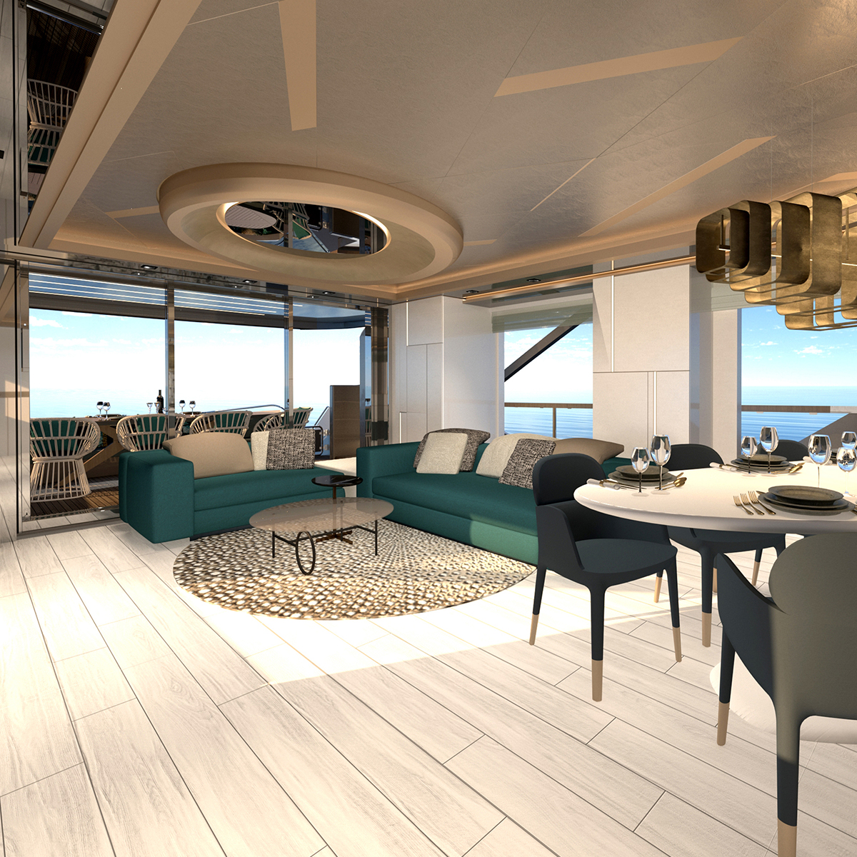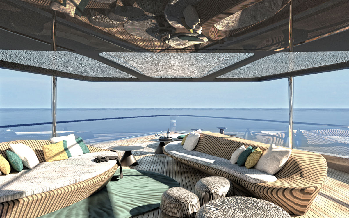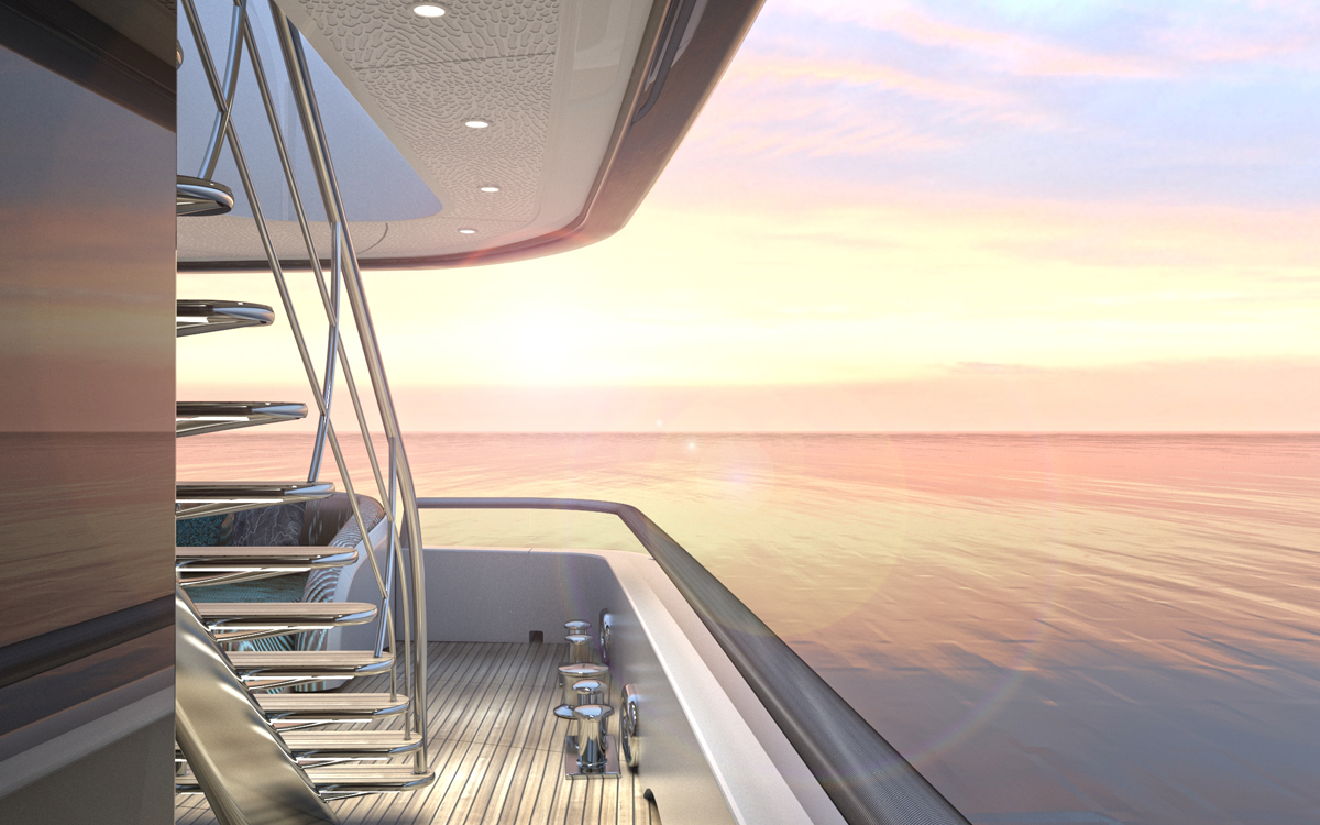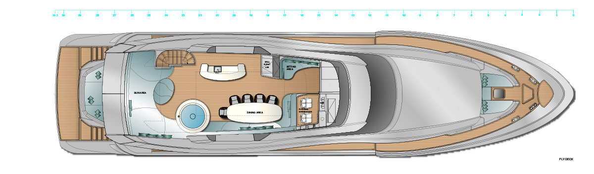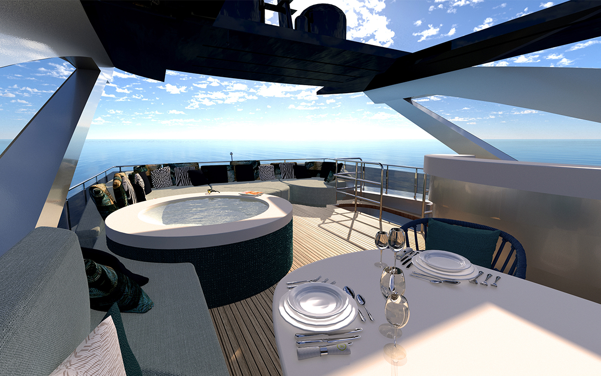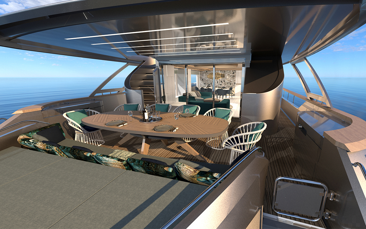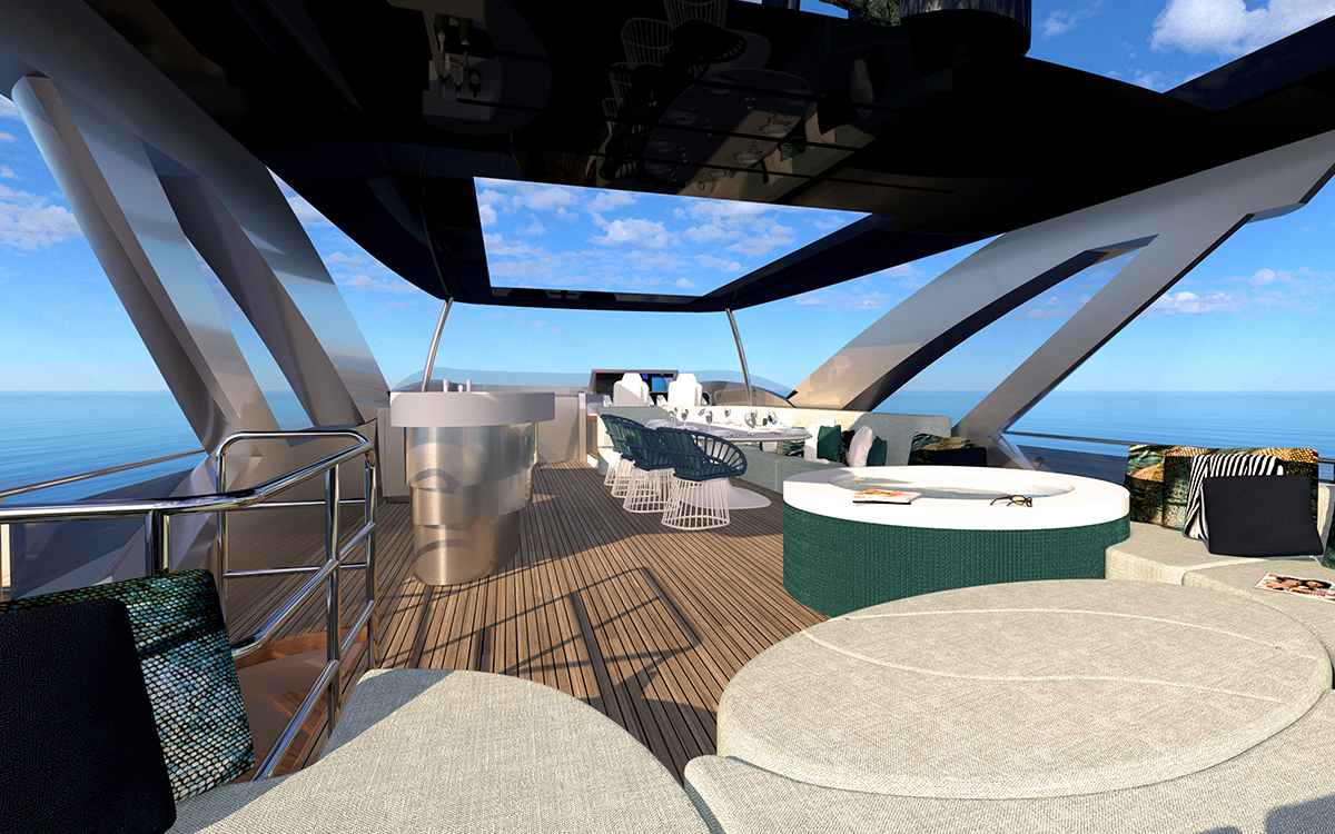 The flybridge is replete with sunbathing space along the stern, and the sunbed curves for an asymmetrical shape that lets a circular seat/covered coffee table nestle into the side. To starboard the sunbed joins into a large circular Jacuzzi and amidships there is an alfresco dining setting that makes use of seating curving along the starboard side to join the elongated oval table and additional movable chairs. A wet bar is placed opposite to conveniently serve all guests dispersed throughout this space, and forward the helm controls are to starboard, with a stairway to port down into the interior.