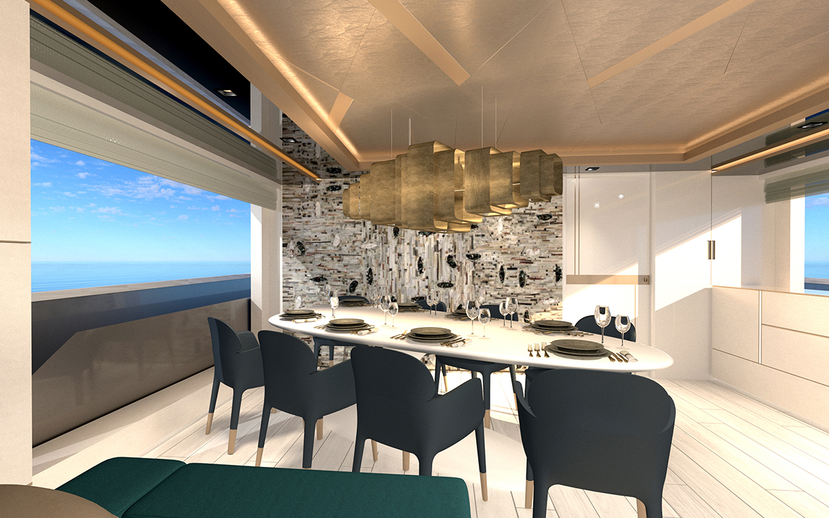 The formal dining area and salon are combined into one large open-plan social space, with the formal dining area placed forward at a 45 degree angle to seat all 10 guests and make the most of the light through the large windows running the length of the room. The tranquil lounge places two sofas around a coffee table to port, while the starboard side of the room has an armchair in the forward corner for reading in the warm sunlight, and aft a pop-up TV is concealed in the cabinetry.