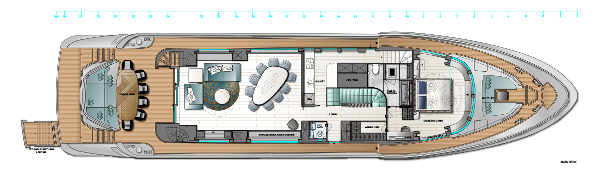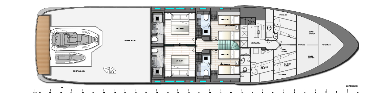 The lower deck layout place the guest accommodation amidships with the crew accommodation forward and the engine room and tender garage aft.