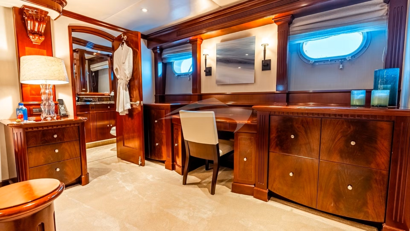 On the main deck, the formal dining area is styled in right mahogany panelling with chandeliers and wall sconces in art deco style adding ambience after dark. Up to eight guests can dine at the grand table before settling into the aft lounge for a film on the widescreen TV, which disappears into the cabinetry when not in use. An L-shaped sofa is placed near the port side windows for plenty of natural light while reading or socialising, and the drinks table to the aft also doubles as a games table.