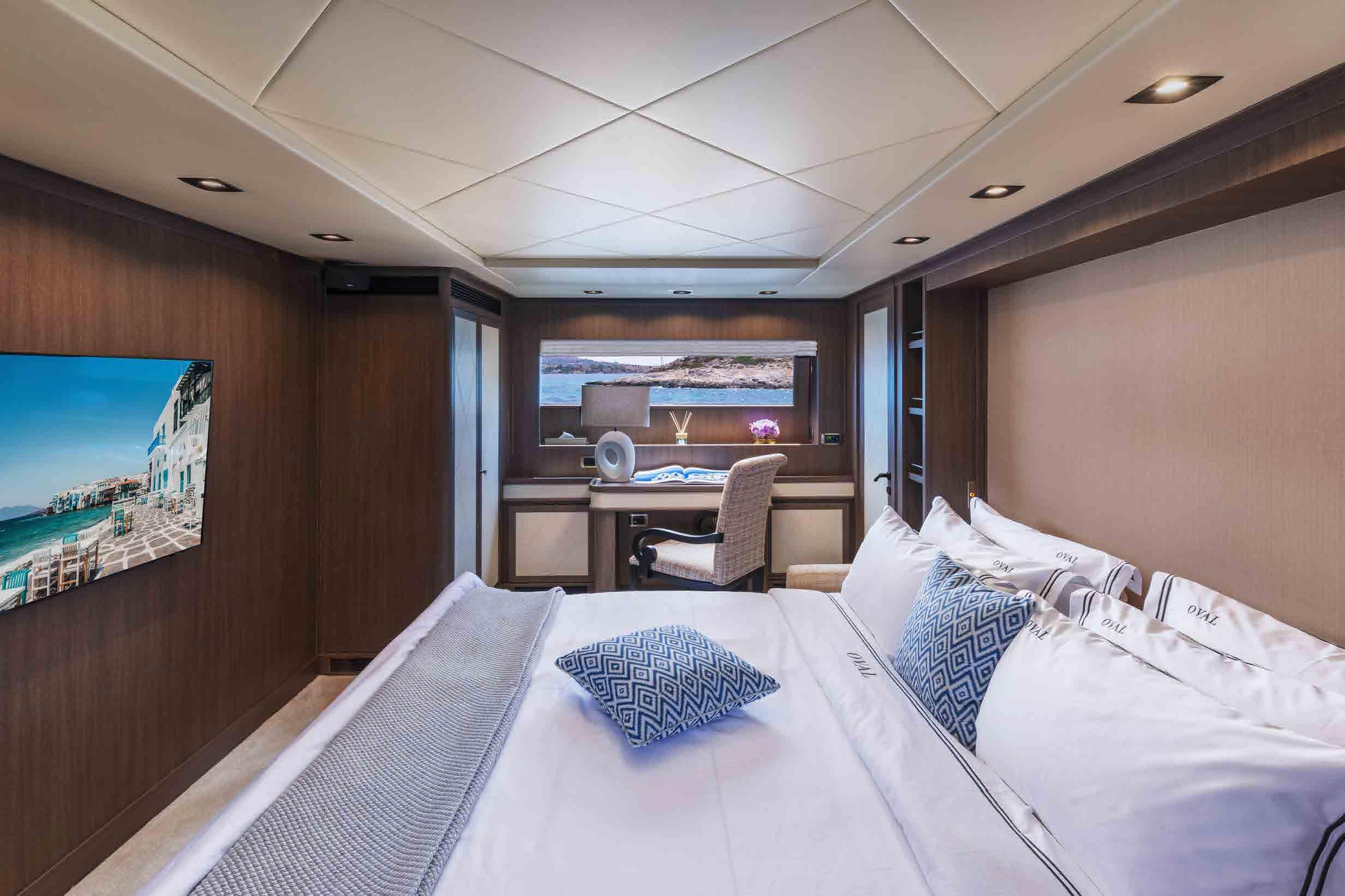 The accommodation sleeps a total of 11 guests over 5 en-suite cabins: 1 Master suite, 1 VIP stateroom, 1 convertible double cabin and 2 twin cabins. The Master suite is placed amidships on the lower deck to have the benefit of the full beam. The room contains a king-sized bed, widescreen TV, desk/vanity, sofa, large wardrobe and an en-suite bathroom with a sink, toilet, bidet and shower. The VIP stateroom is on the lower deck and is furnished with a king-sized bed, widescreen TV, desk/vanity, and an en-suite bathroom with a sink, toilet and shower. The double cabin on the main deck forward is convertible to a private office/lounge with the queen-sized bed folding to become a sofa. The room is also furnished with a widescreen TV, desk/vanity, plenty of storage and an en-suite bathroom with a sink, toilet and shower. The twin cabins both have two single beds, a widescreen TV, ample storage and an en-suite bathroom with a sink, toilet and shower. The professional crew of 6 will ensure that all guests on board receive first-class service throughout their stay.