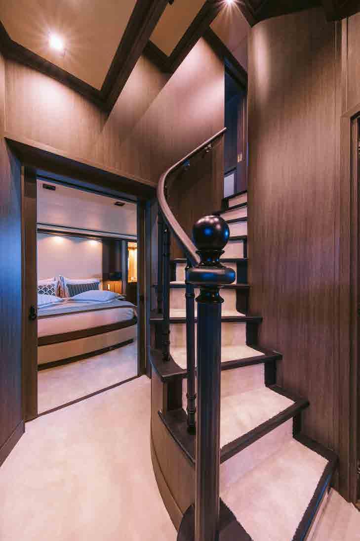 On the main deck the convertible double cabin is forward, followed by the galley and main foyer amidships, then the main salon aft which also includes the formal dining area. The salon provides a plush aft-facing corner sofa to starboard with a coffee table and additional seat for the group to unwind together while watching the latest blockbusters on the port pop-up widescreen TV.