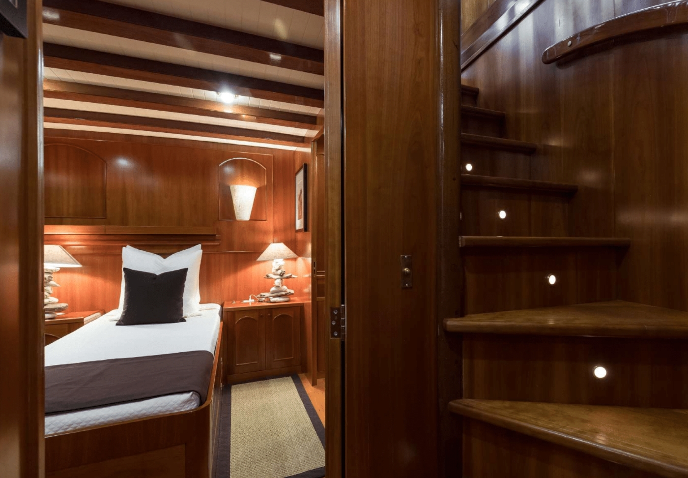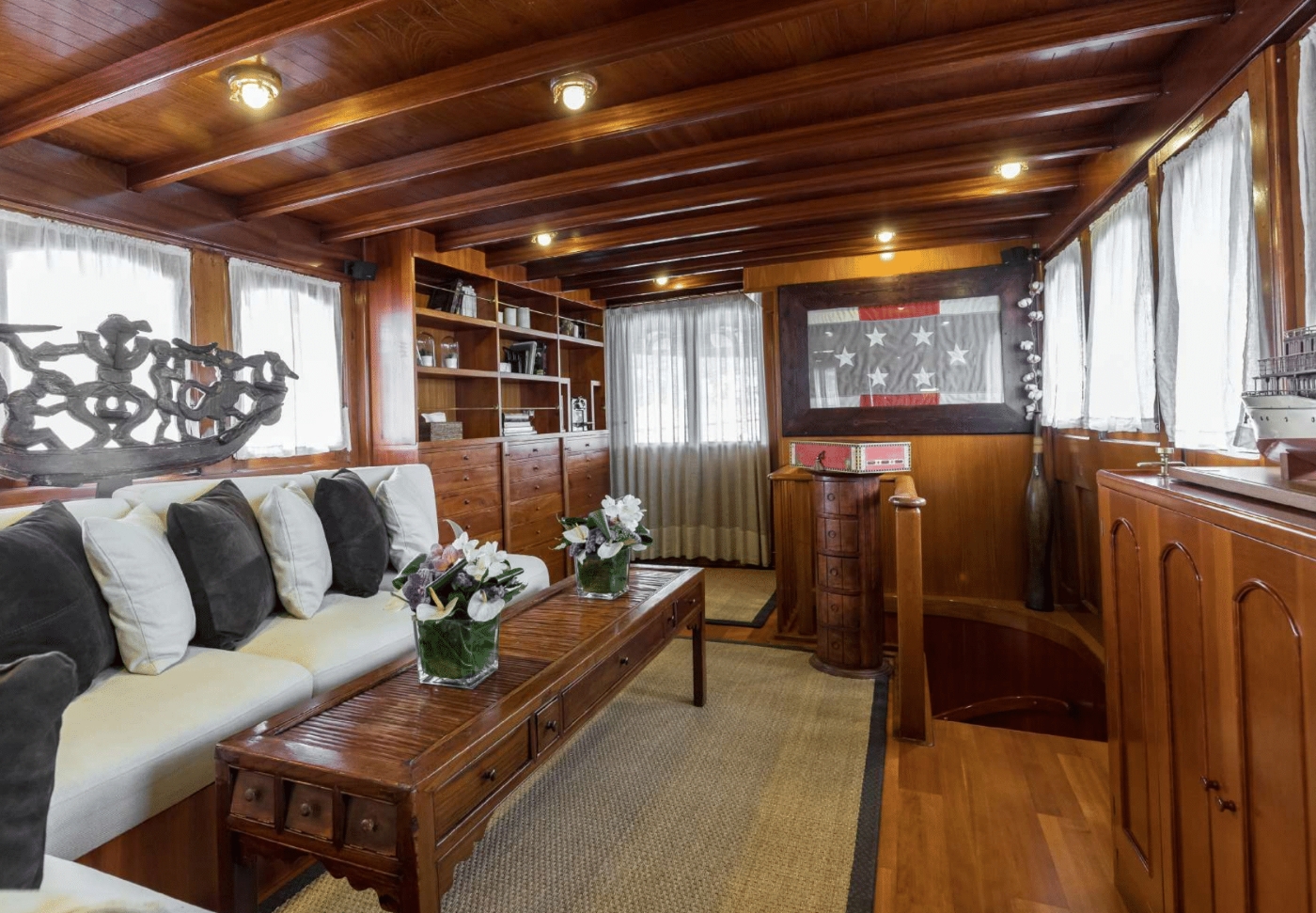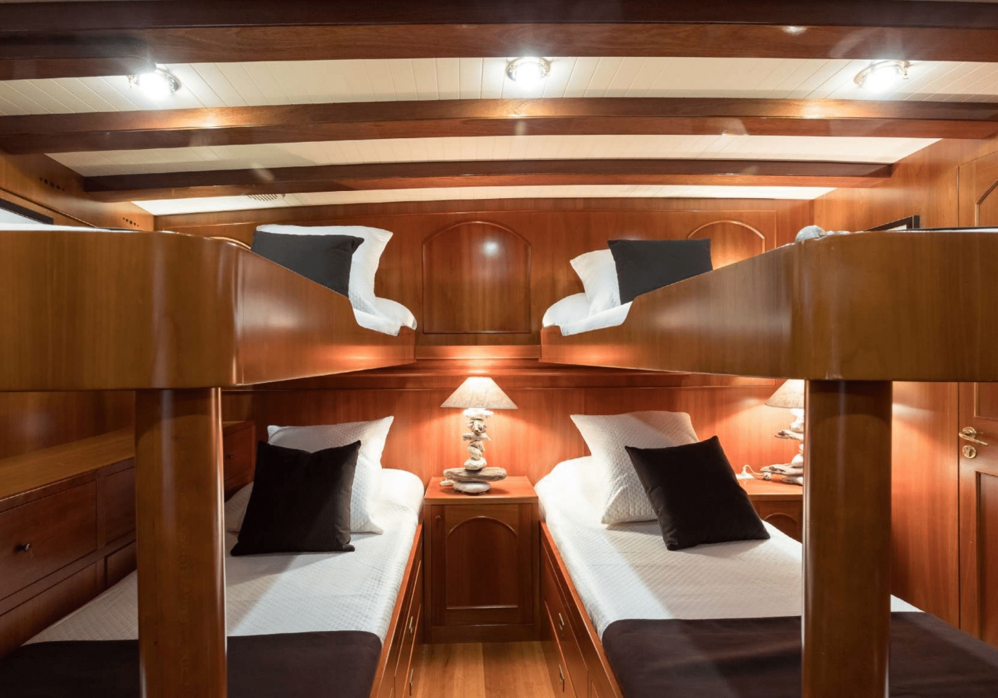 She can accommodate up to 11 guests in 4 cabins. The master suite is full beam of the yacht aft with a center lined double bed, ample storage and full beam en-suite facilities. Forward accessed from the dining room is a double guest cabin. Thre are als 2 twin cabins, both twin cabins are convertible. One is able to sleep up to 4 guests; ideal for children or young teenagers. Each cabin offers en-suite facilities, beautifully finished wood panels and a charmingly elegant atmosphere.
