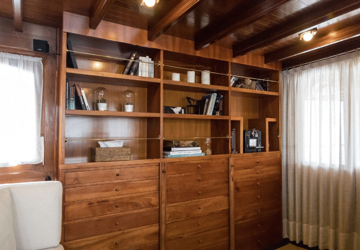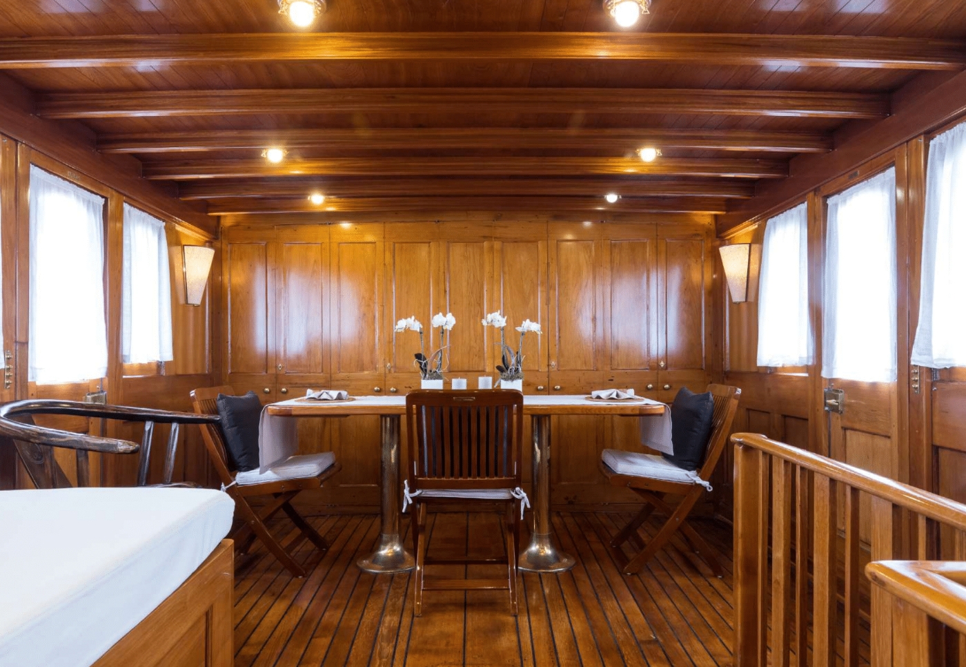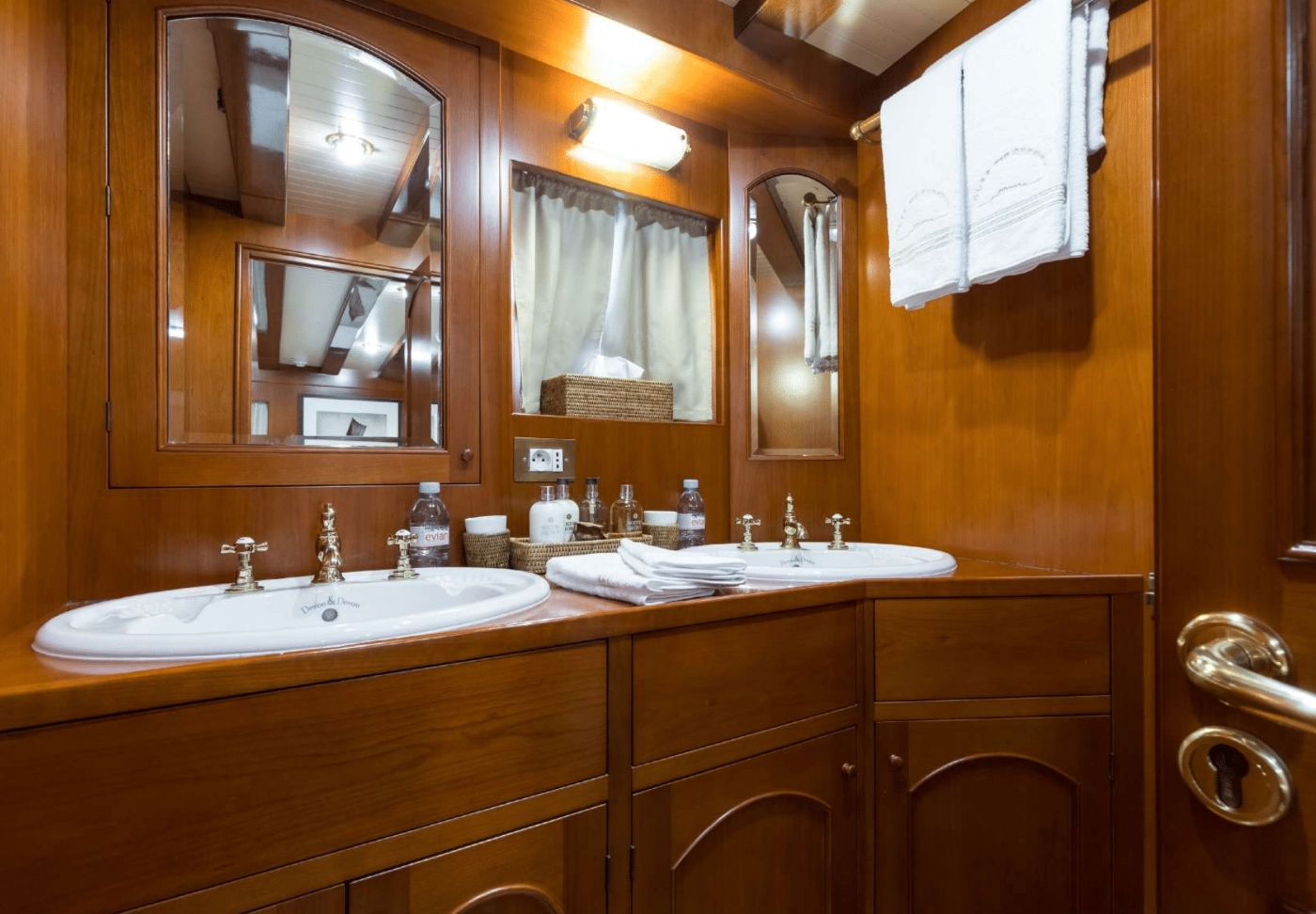 She can accommodate up to 11 guests in 4 cabins. The master suite is full beam of the yacht aft with a center lined double bed, ample storage and full beam en-suite facilities. Forward accessed from the dining room is a double guest cabin. Thre are als 2 twin cabins, both twin cabins are convertible. One is able to sleep up to 4 guests; ideal for children or young teenagers. Each cabin offers en-suite facilities, beautifully finished wood panels and a charmingly elegant atmosphere.