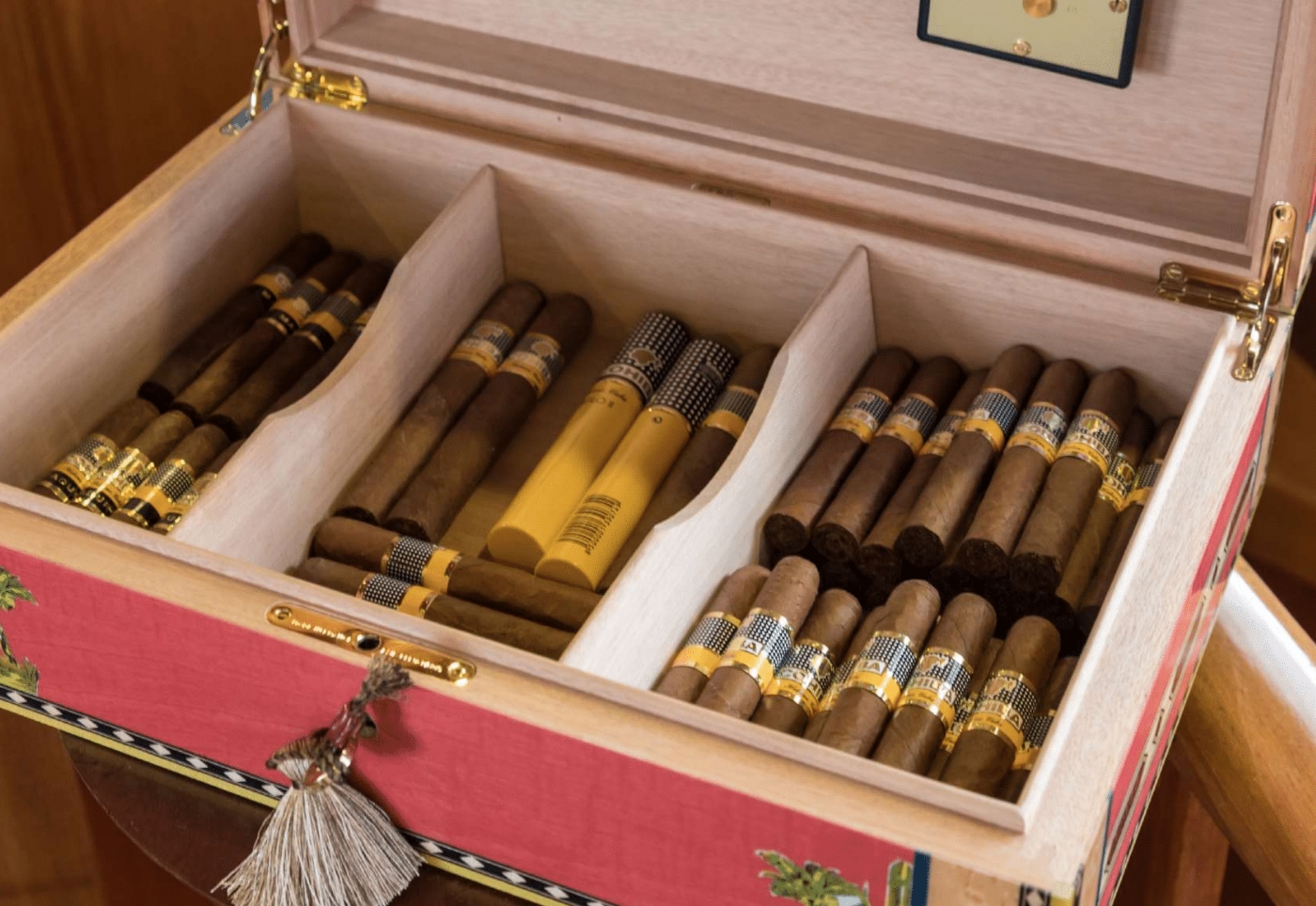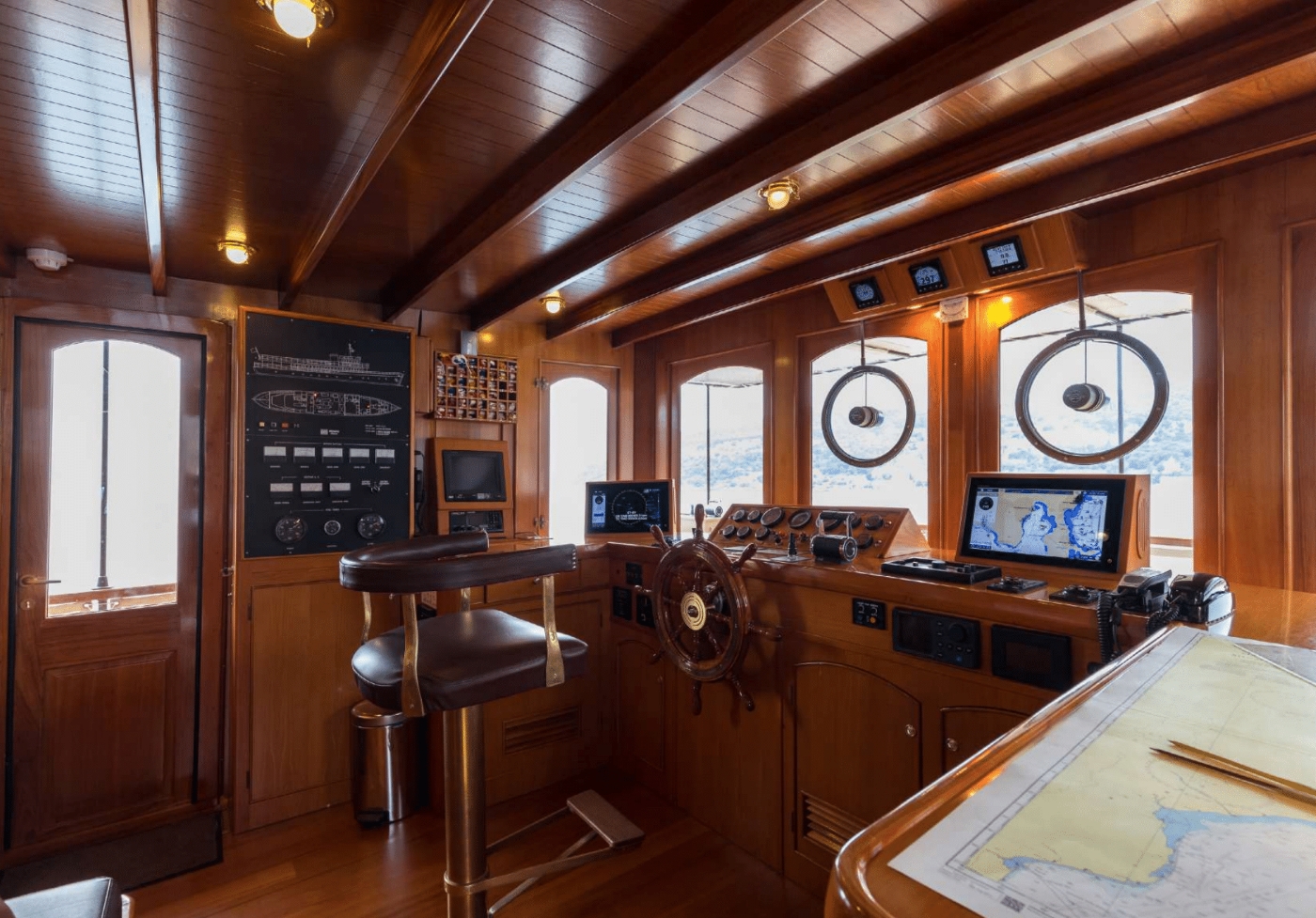 Classic yacht OVER THE RAINBOW OF LONDON has a warm elegant interior of light cherry woods, fine art and a fittingly nautical theme, the newly designed interior was undertaken by the Geneva based SYDAC. The main salon is aft on the main deck featuring a plush L shaped sofa, coffee table and library. Forward of the salon, a large galley includes a country style table with a casual dining space. Further forward the formal dining area seats all guests in true elegance. The salon through to the formal dining space is on the main deck and surrounded by large windows and idyllic views.