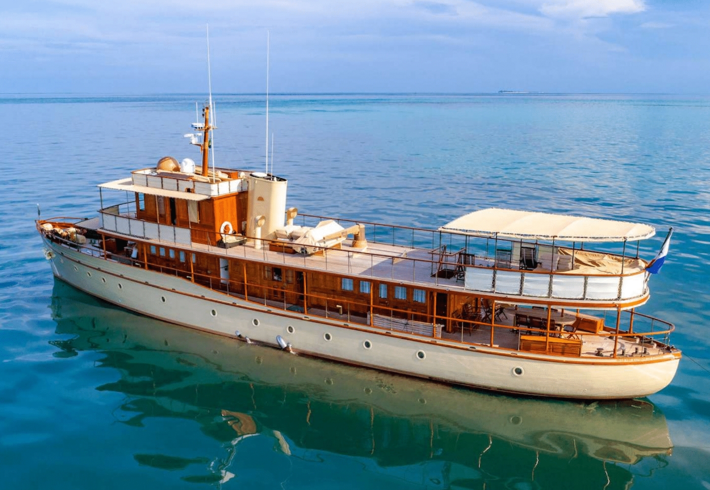 Classic motor yacht OVER THE RAINBOW OF LONDON defines tradition and grace of another era, with today’s amenities. She was built by Welsh shipyard Dickie & Sons in 1930, and underwent a complete refit in 2002 – 2004 which was meticulously undertaken by Mondomarine, and last refitted in 2019. She measures 35m (114.1ft) and can accommodate up to 11 guests in 4 deluxe en-suite cabins.