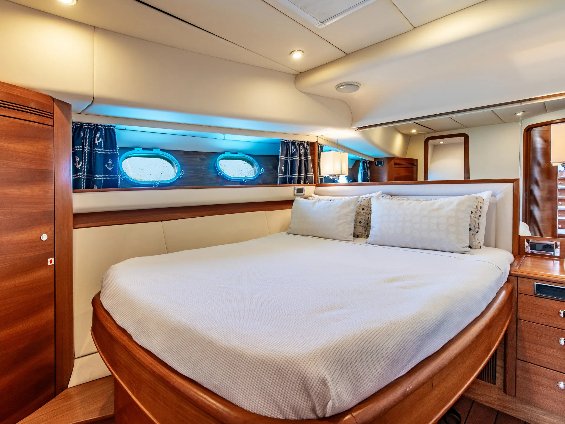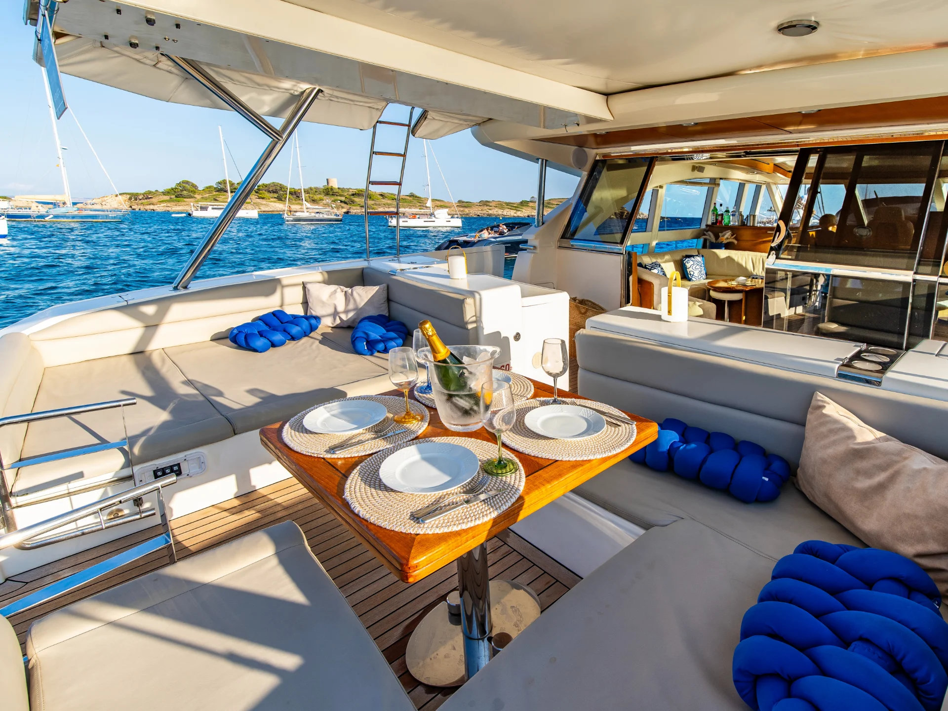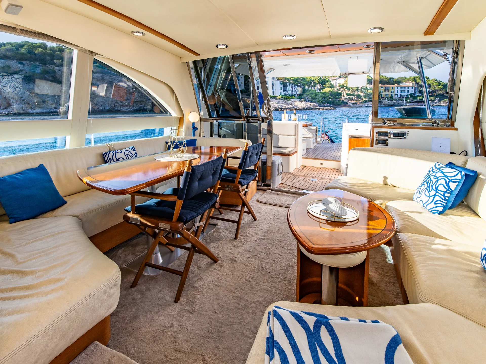 The salon is designed around ease and sociability, with generous sofas and twin dining tables positioned amid large windows for abundant light. The convertible roof enhances the indoor experience with fresh air and sea breezes. Rich timber and soft upholstery create a warm and inviting ambiance throughout. A well appointed galley discreetly supports onboard service while maintaining a comfortable environment.