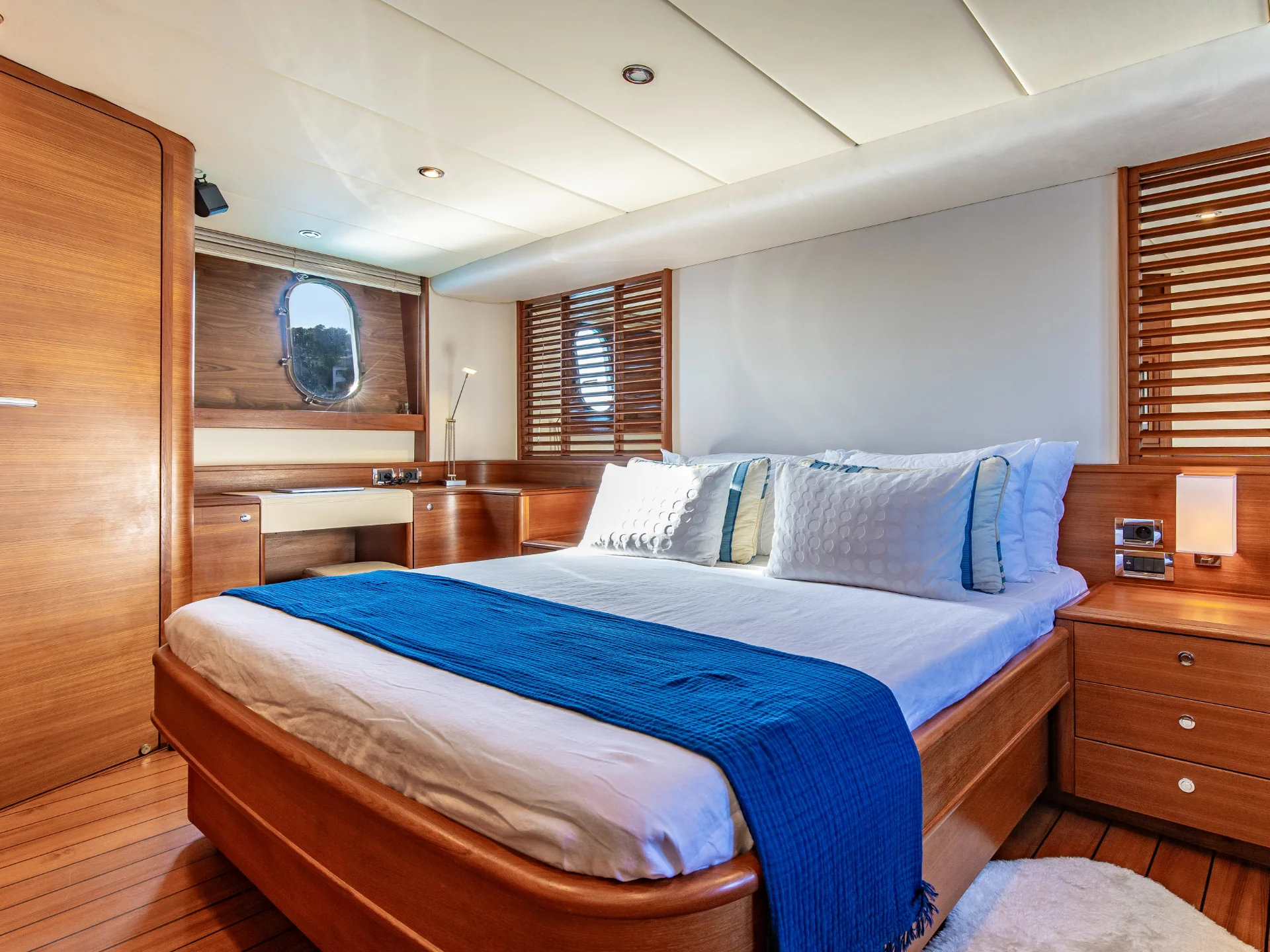YACHT CHARTER ACCOMMODATION Guest accommodation aboard PARODIA comprises: ~ Master cabin with king-sized bed and ensuite bathroom ~ Two guest cabins with queen-sized beds, each with ensuite ~ Twin cabin with two single beds and ensuite bathroom Each stateroom is elegantly appointed with fine linens, generous storage and private facilities, offering tranquillity and comfort.