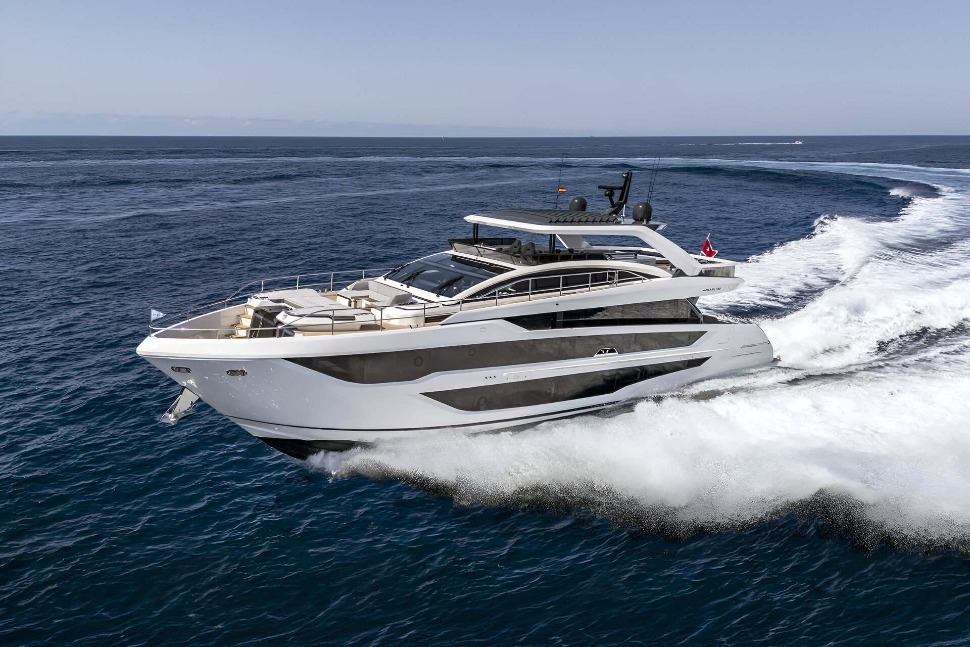 Motor yacht PEARLY SPENCER is a 25.30 m (83') Pearl 82 flybridge yacht – the first hull in the series. The innovative layout offers unparalleled performance and elegance with naval architecture from Dixon Yacht Design and interiors from renowned designer Kelly Hoppen. Her deck jacuzzi and riviera stern terrace are outstanding features and she can accommodate up to ten guests in five staterooms.