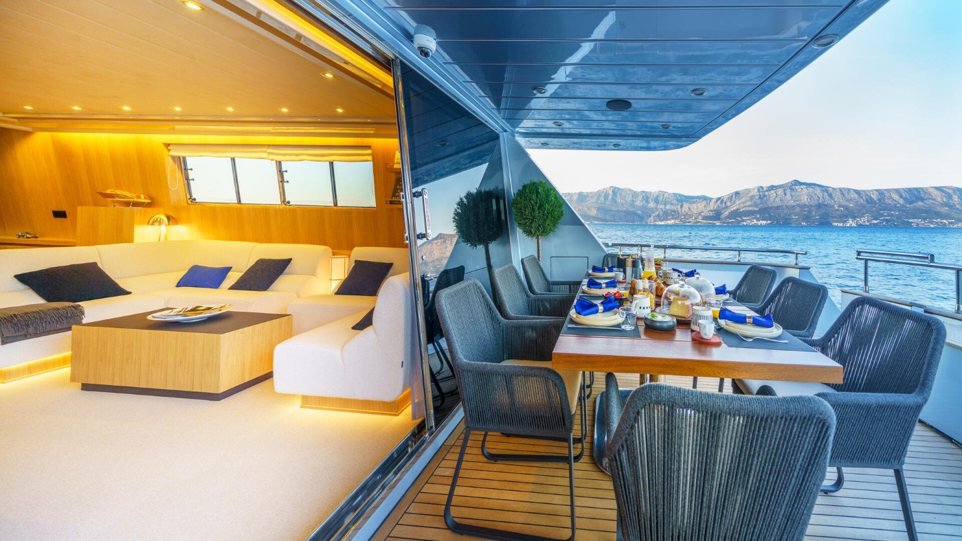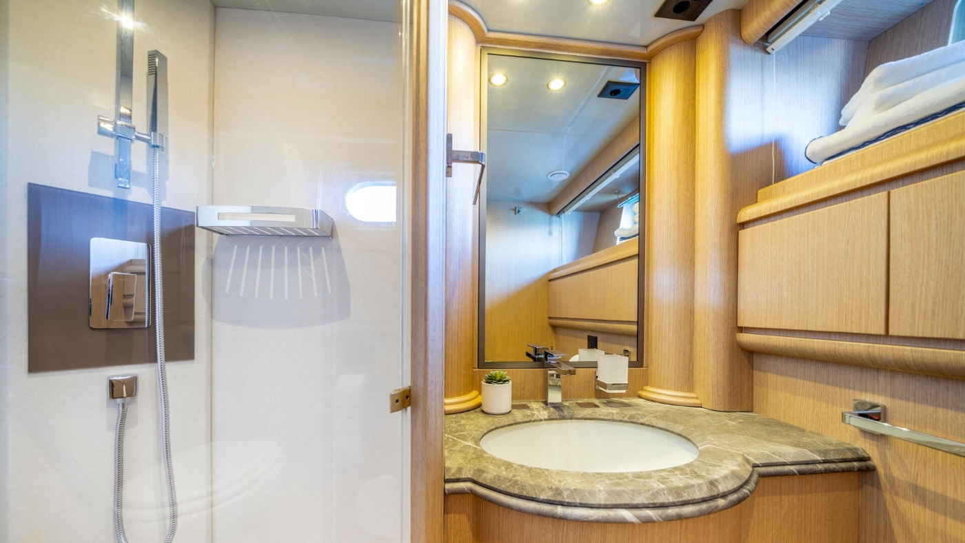 The main salon has been completely transformed with natural oak finishes and new furnishings, creating a warm and sophisticated atmosphere. The salon features a SONY flat-screen TV and premium Bowers & Wilkins speakers as part of the HEOS multiroom system. All navigation equipment has been updated, while new lighting creates the perfect ambiance throughout. A conveniently located guest day head on the same level as the salon adds to the practical luxury of the interior spaces.