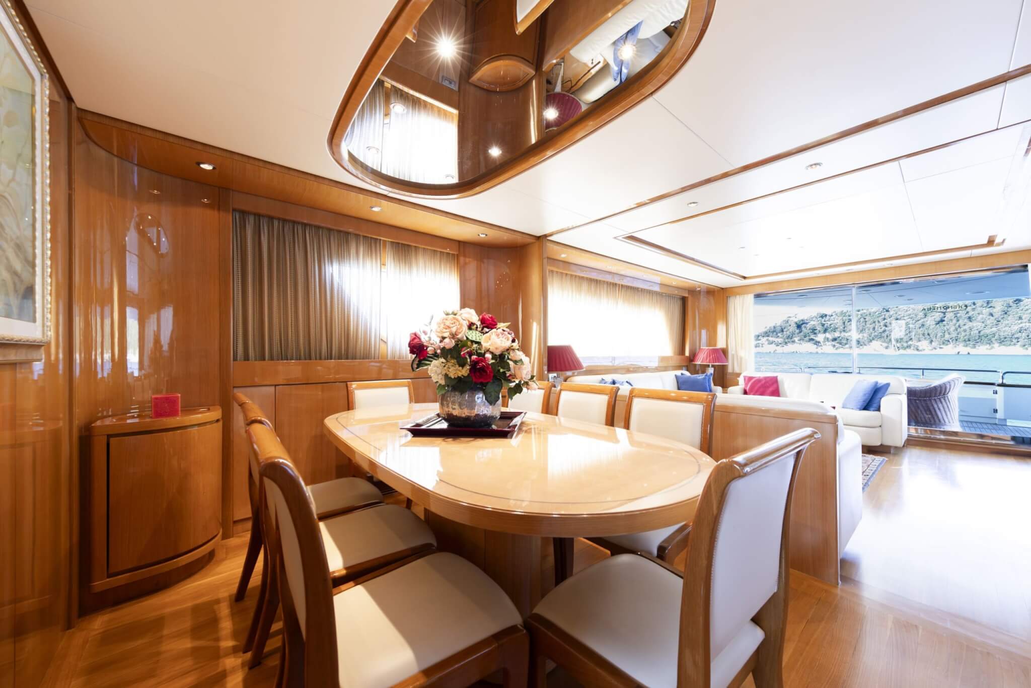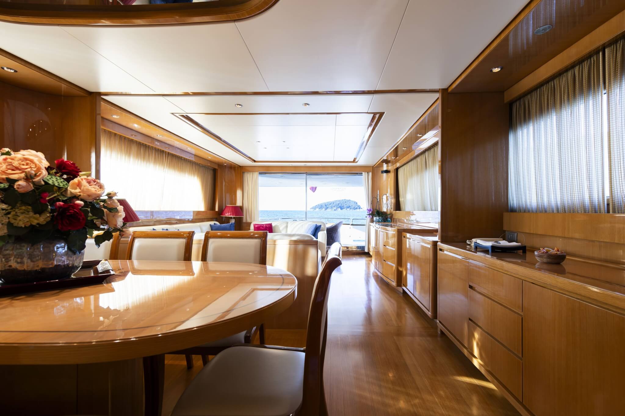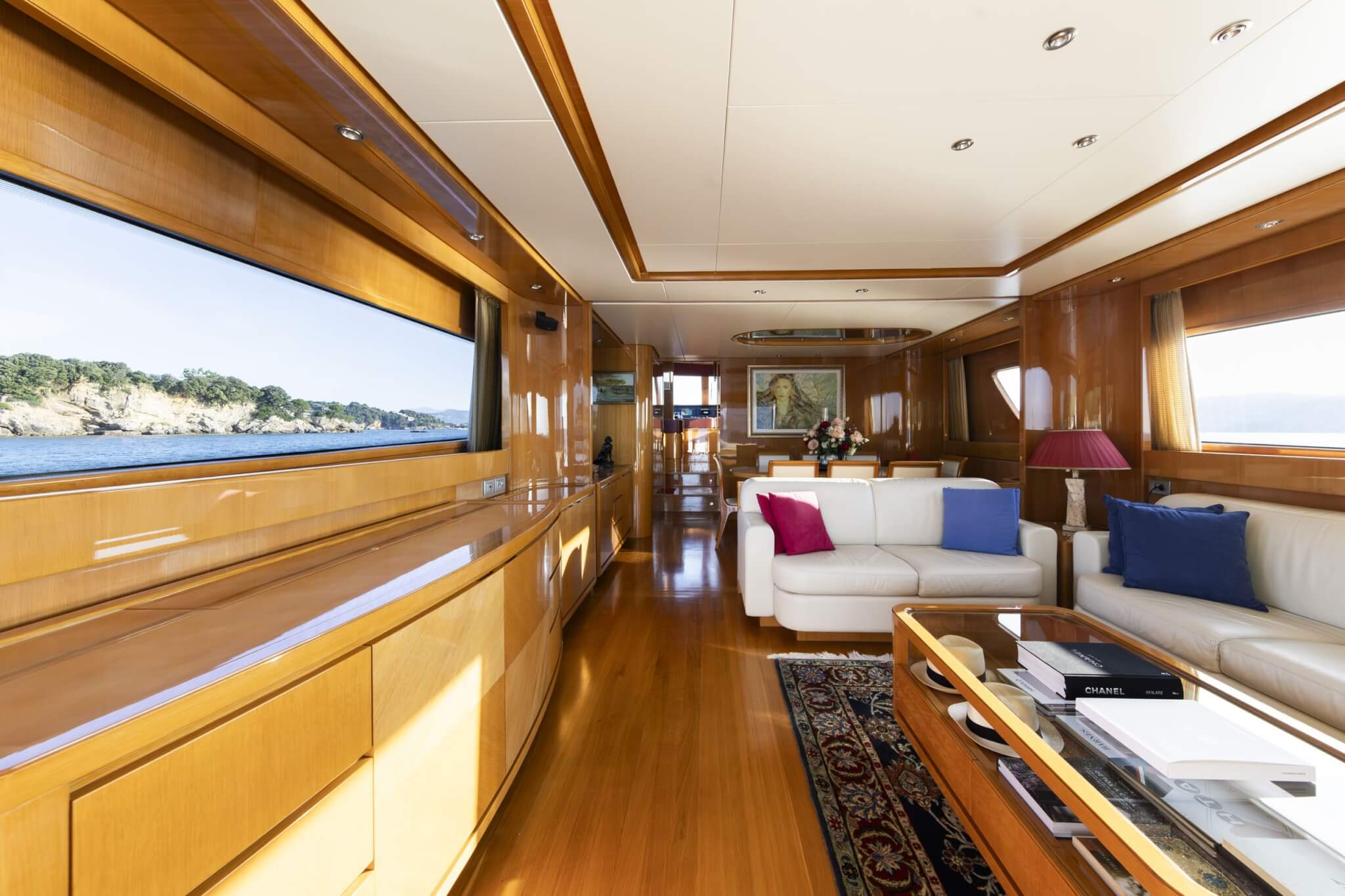 The interior has a classic look and feel with warm gloss wood flooring and panelling blending beautifully with the neutral soft furnishings. The main salon is filled with light thanks to the panoramic windows which also frame the wonderful views of the surroundings. The salon is configured with a lounge aft and dining setting forward and offers direct access to the aft cockpit through large glass doors.