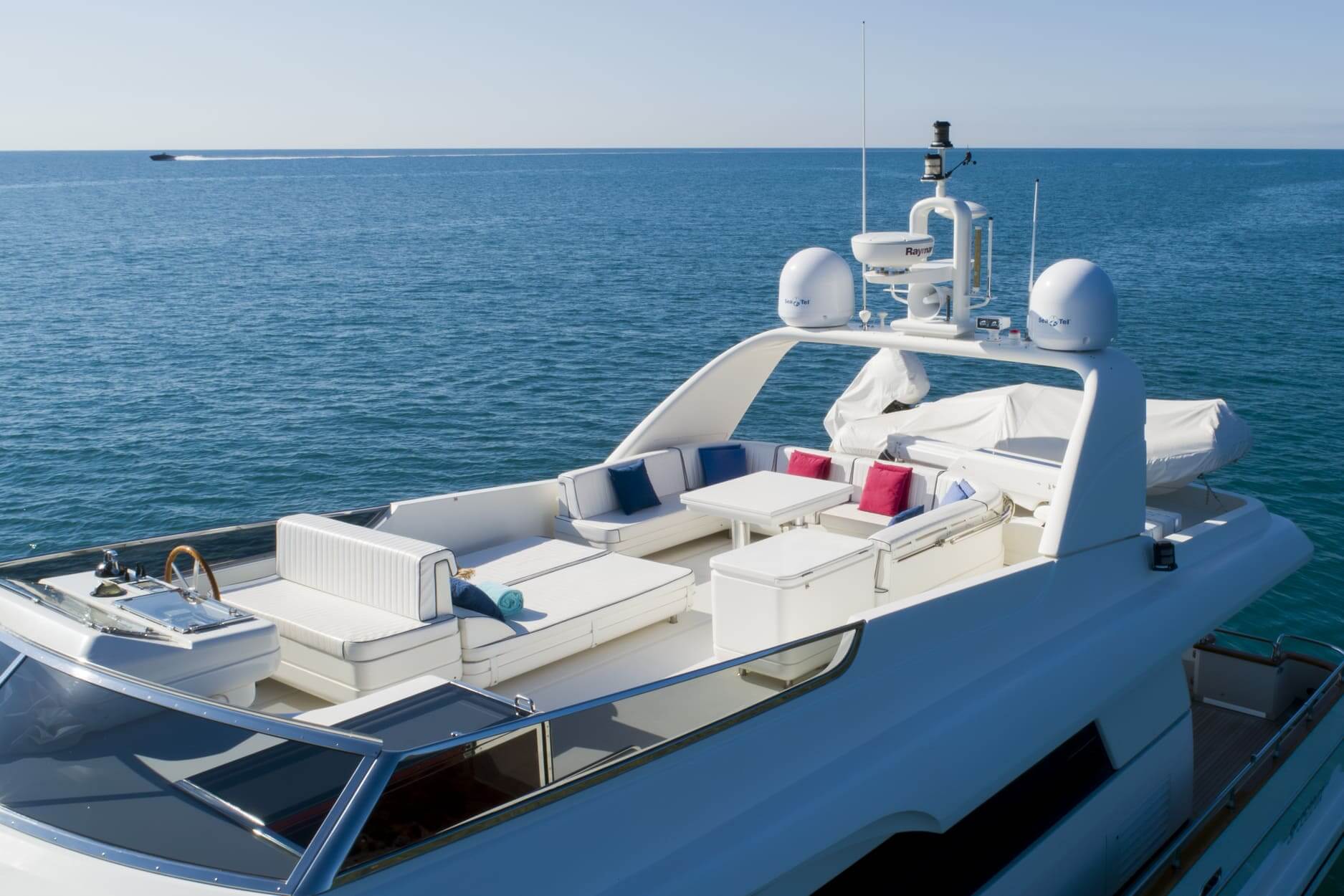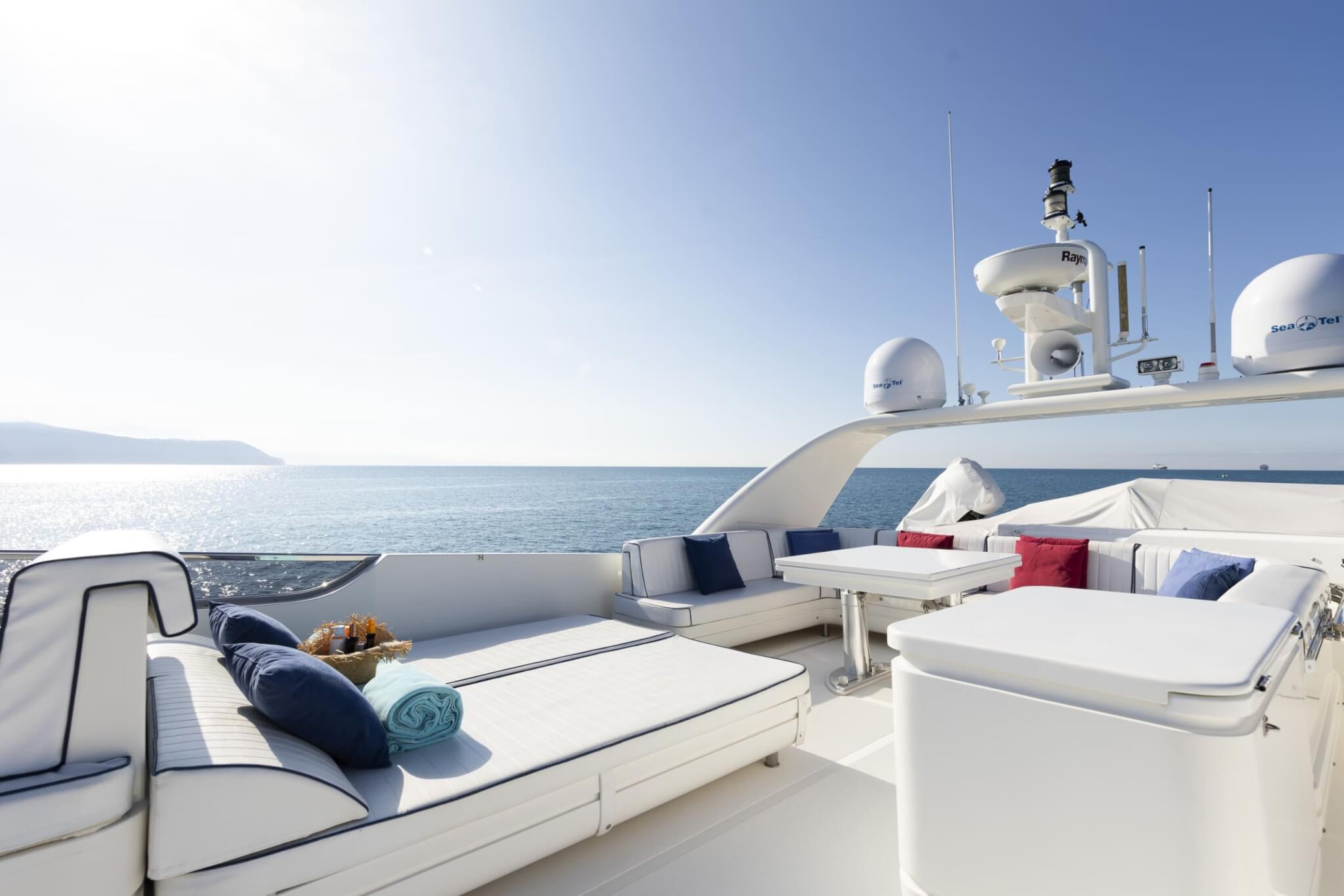 The open sun deck offers a u-shaped dining setting with a flexible table, a double sun pad and seating at the forward helm station. There is an additional built-in sun pad on the foredeck and another dining setting on the main deck aft. From the main deck aft there are steps on either side leading down to the swim platform. The tender and toys are stored aft on the upper deck.
