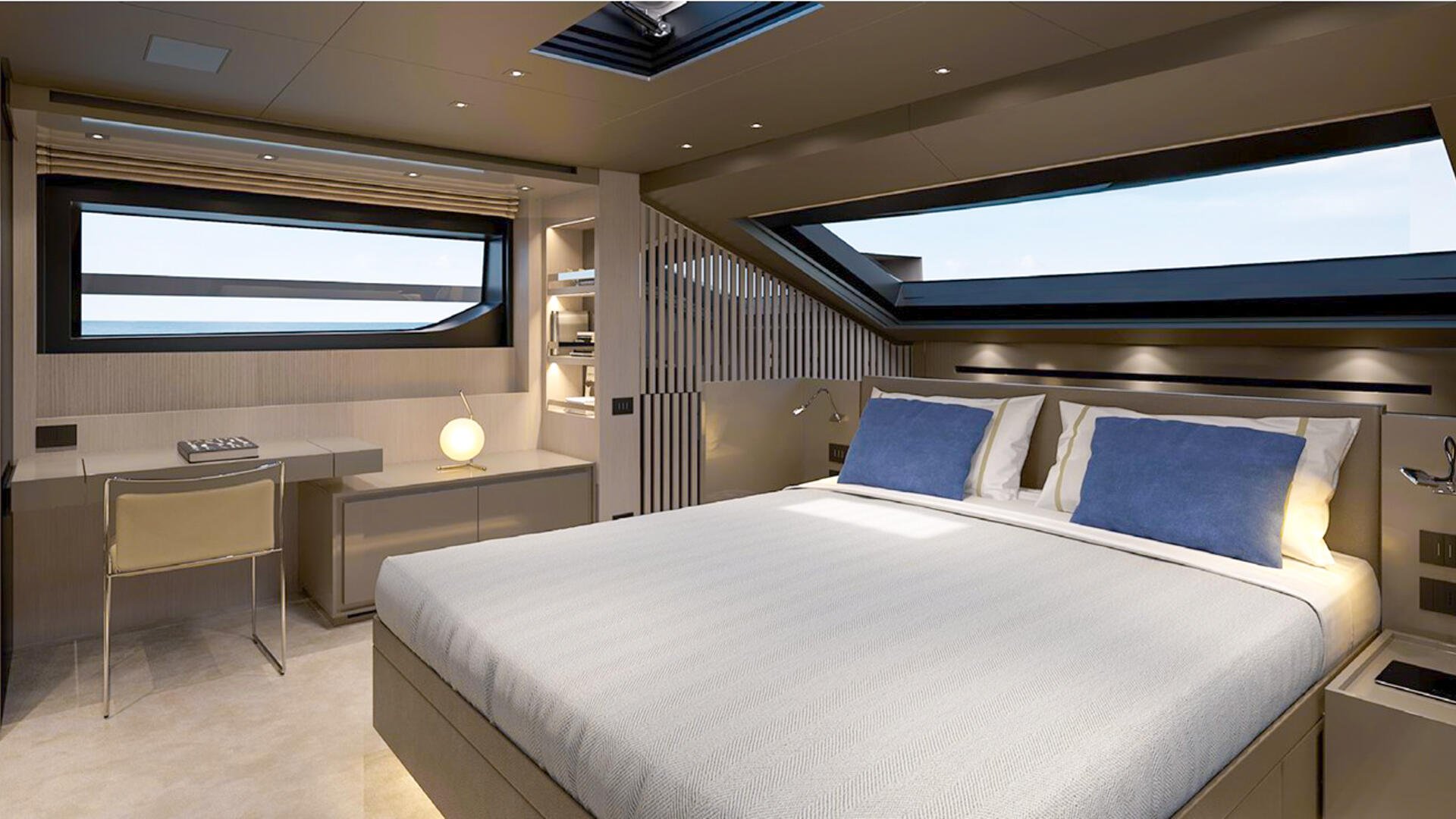 The asymmetric layout creates wider guest spaces on the main deck including the main salon and master suite. The main salon is configured with a lounge to starboard and dining setting to port with views either side from the panoramic glazing. Contemporary furnishings, elegant lighting and reflective surfaces create stunning guest spaces.