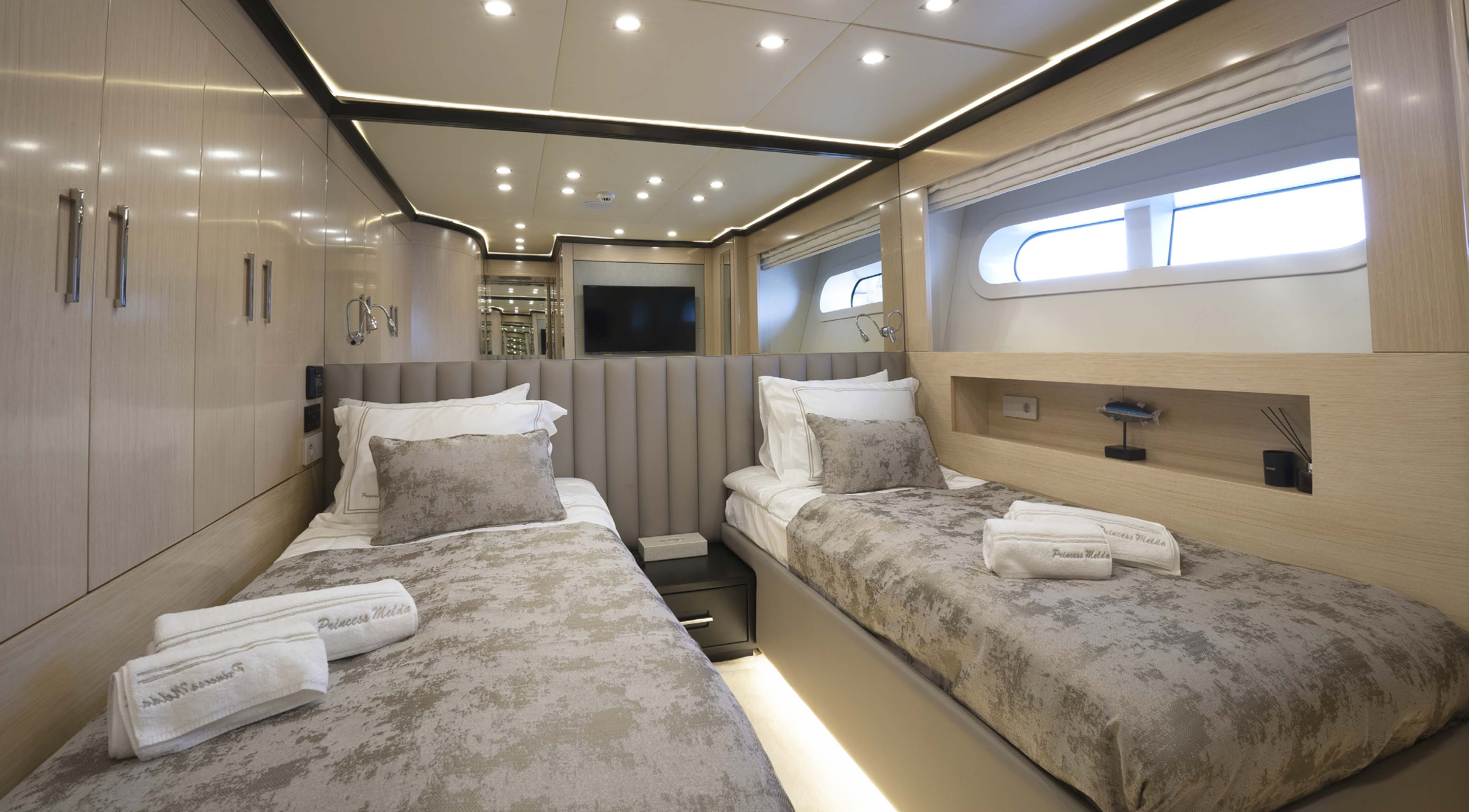 The wonderful owner’s suite on the upper deck offers complete privacy for primary charter guests with a huge bed, walk in wardrobe and ensuite bathroom and enjoys a private aft terrace with jacuzzi. There is an additional master suite placed forward on the main deck which is spacious and includes a king-sized bed, premium finishes and a luxury ensuite with full bath tub. The additional four suites - configured as two doubles and two twins - are on the lower deck and all benefit from the luxury and privacy of deluxe ensuite bathroom facilities.