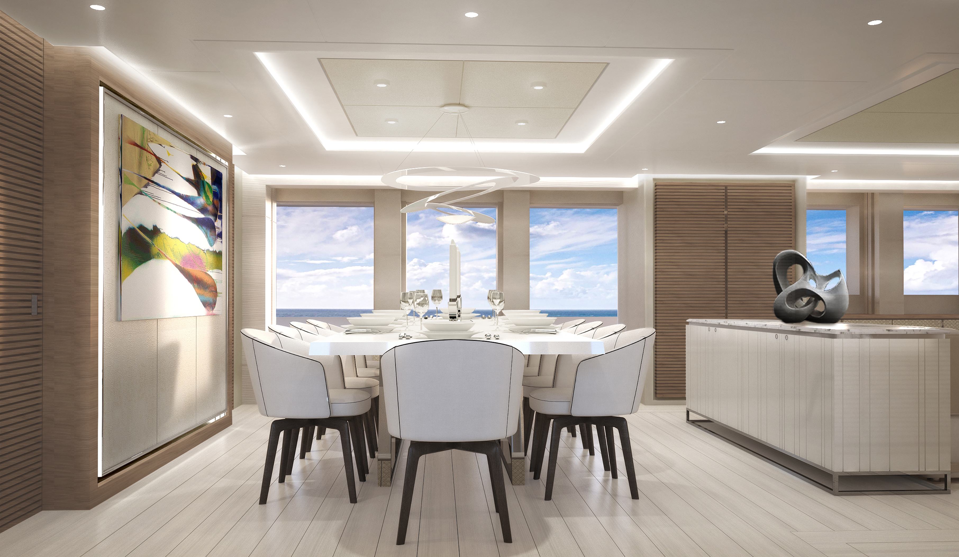 In the main salon, the formal dining area consists of 10 plush chairs in white and cream detailing, surrounding a large table. The main salon aft features an aft-facing chaise-lounger and a sofa to port, with additional armchairs to create a cosy conversation area.