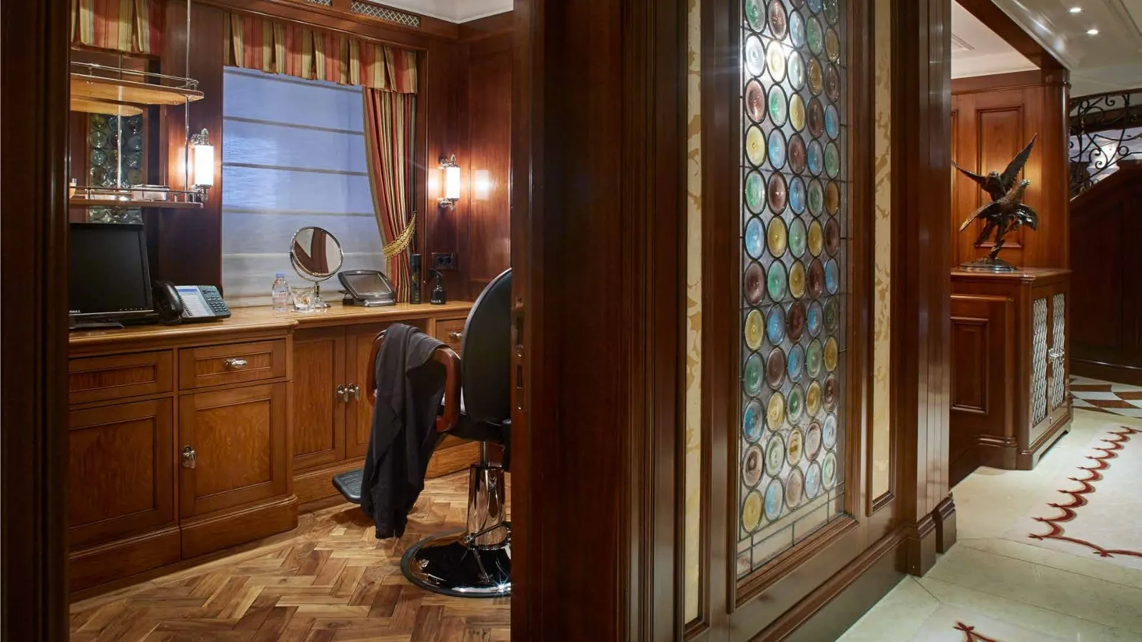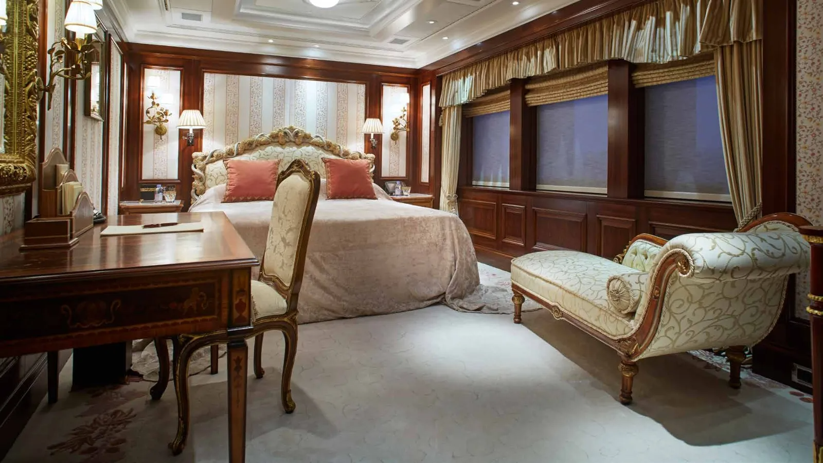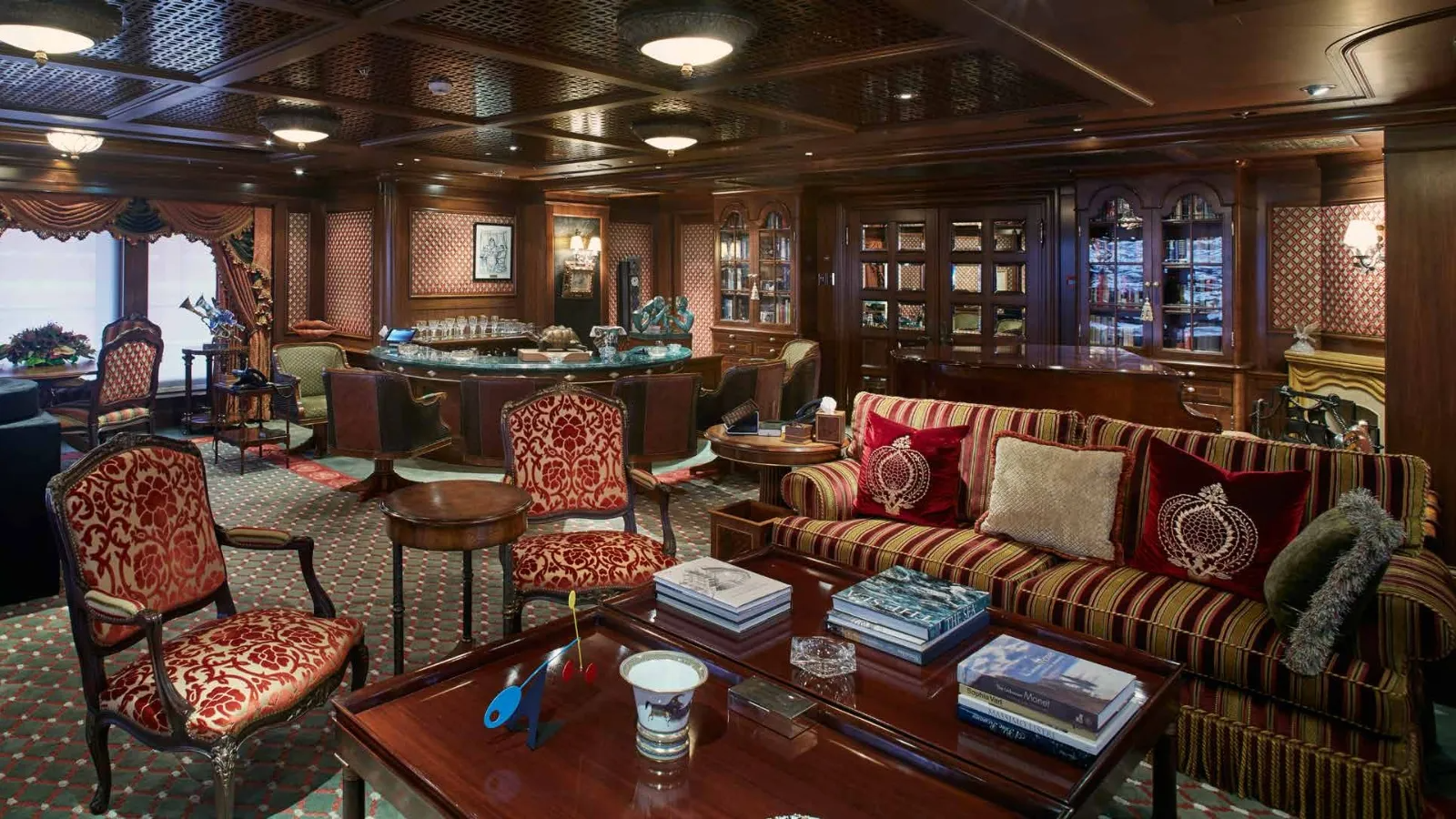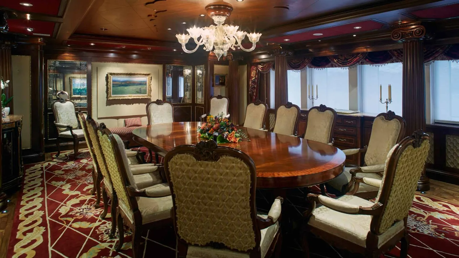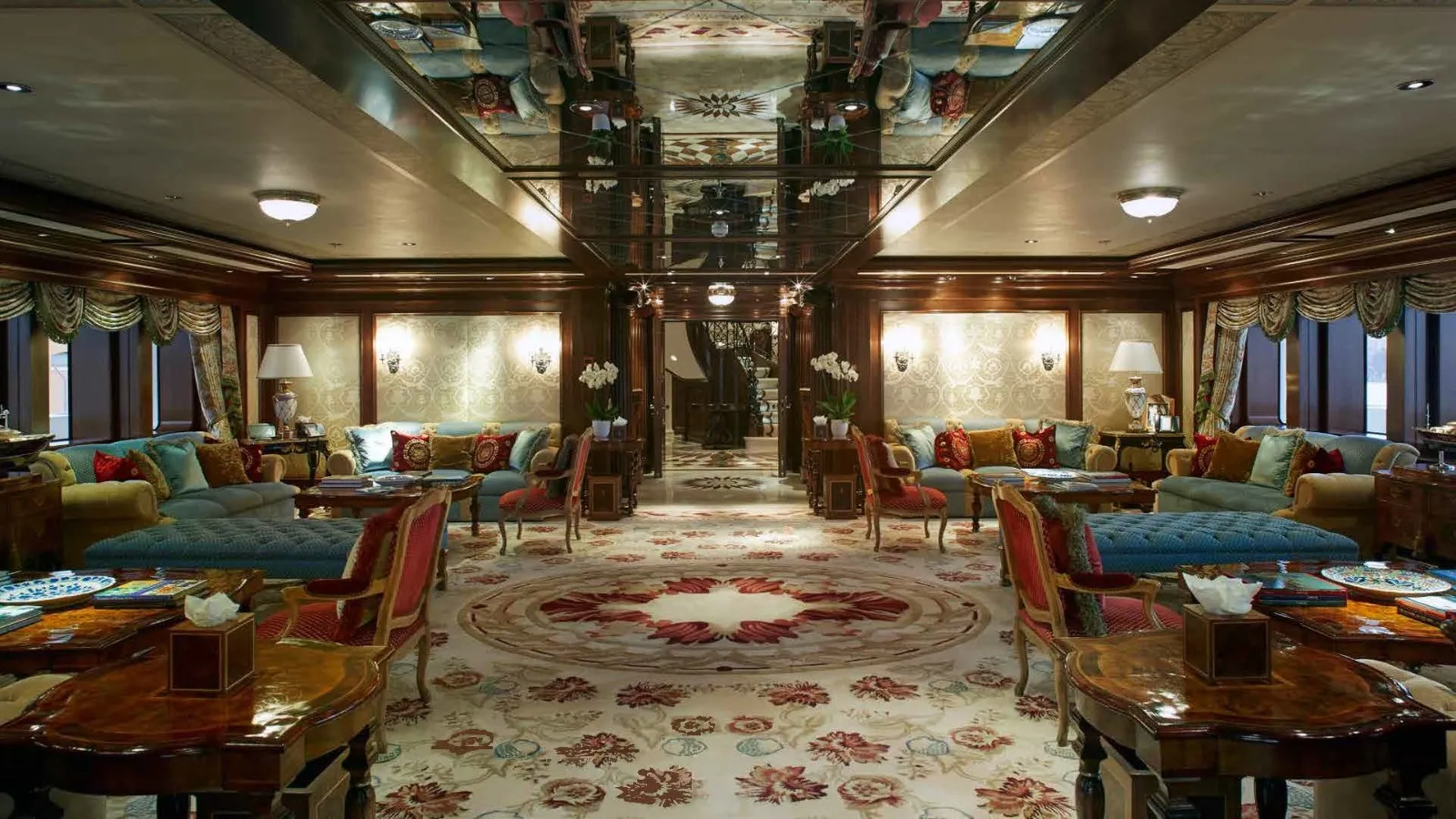 The interiors feature rich furnishings with deep reds, dark woods and brocades. Highlights include a glass-topped atrium covering the main spiral staircase ascending through all six decks, a comfortable cinema and a winter garden dining area that can be opened or enclosed by glass sliding doors.