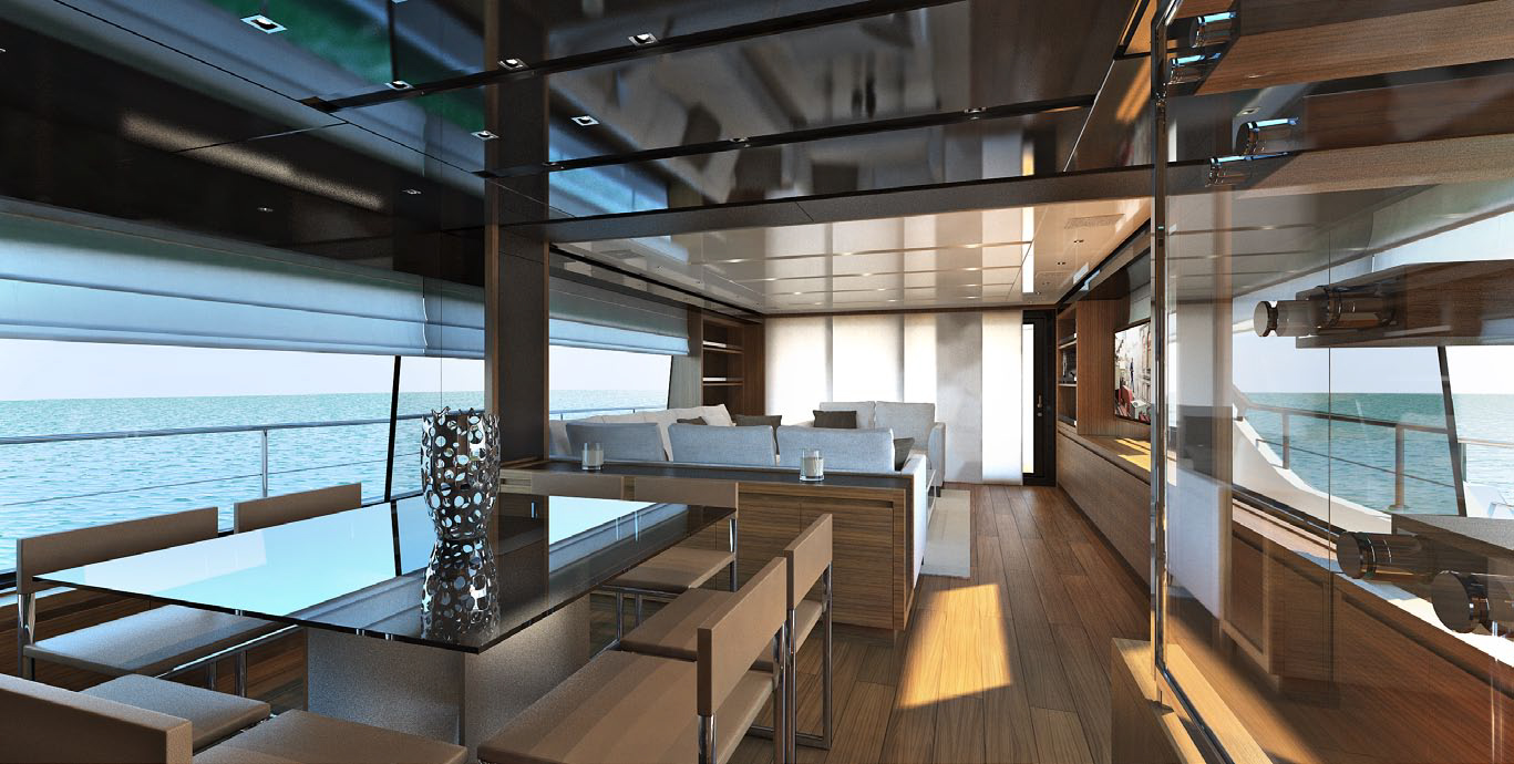 The main salon is configured with a lounge aft and dining area forward and is filled with light thanks to the panoramic windows which also offer expansive views of the surrounding – guests won’t miss a thing even if they wish to spend time inside.