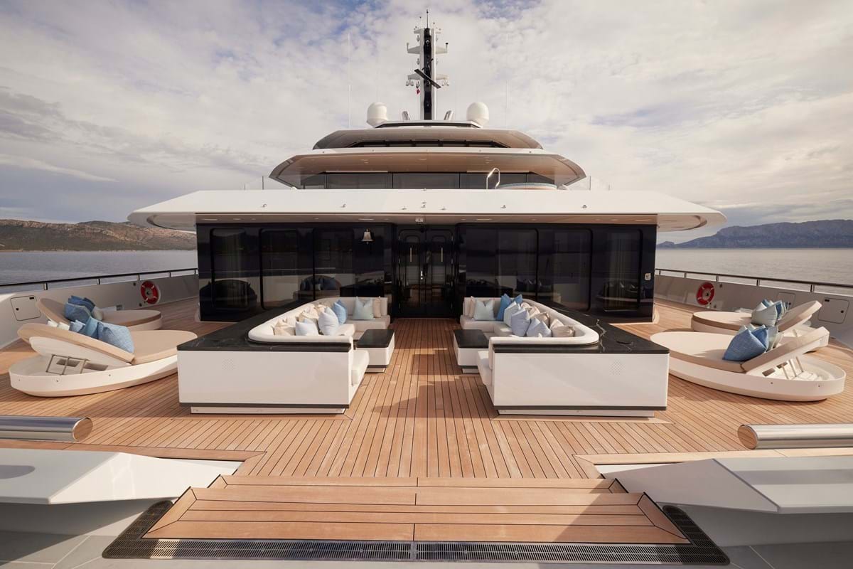 There a four aft deck levels starting with another private owner’s terrace on the upper deck and multiple entertainment areas with include a sushi bar, BBQ and DJ zones plus al fresco dining on five decks. Chic furnishings including lounge sofas, day beds, sun beds are arranged across the decks giving guests plenty of choice – a different deck for every day of the week. There is a huge circular jacuzzi surrounded by sun pads on the upper deck and a 10m x 5m swimming pool on the main deck. A swim platform leads into the fabulous beach club which also has two fold-out terraces and a waters edge dining area.