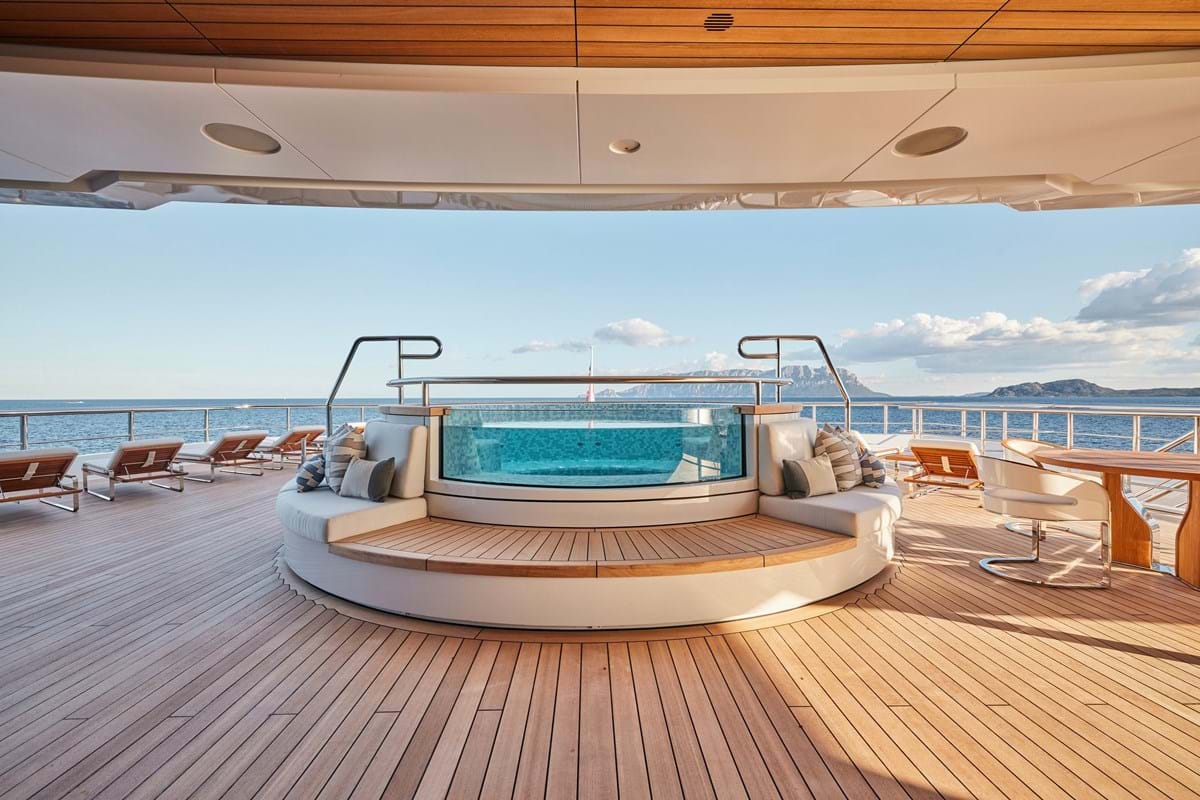 There is so much to explore across the six decks on board RENAISSANCE, so let’s start with the foredeck helipad which can welcome guests arriving on commercial helicopters flights. From here steps lead down to a welcoming lounge area furnished with two opposing u-shaped sofas and an arrangement of day beds. The upper foredeck is a private terrace with circular jacuzzi for the exclusive use of guests in the owner’s apartment.