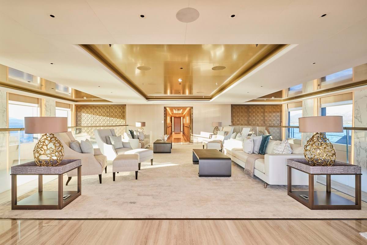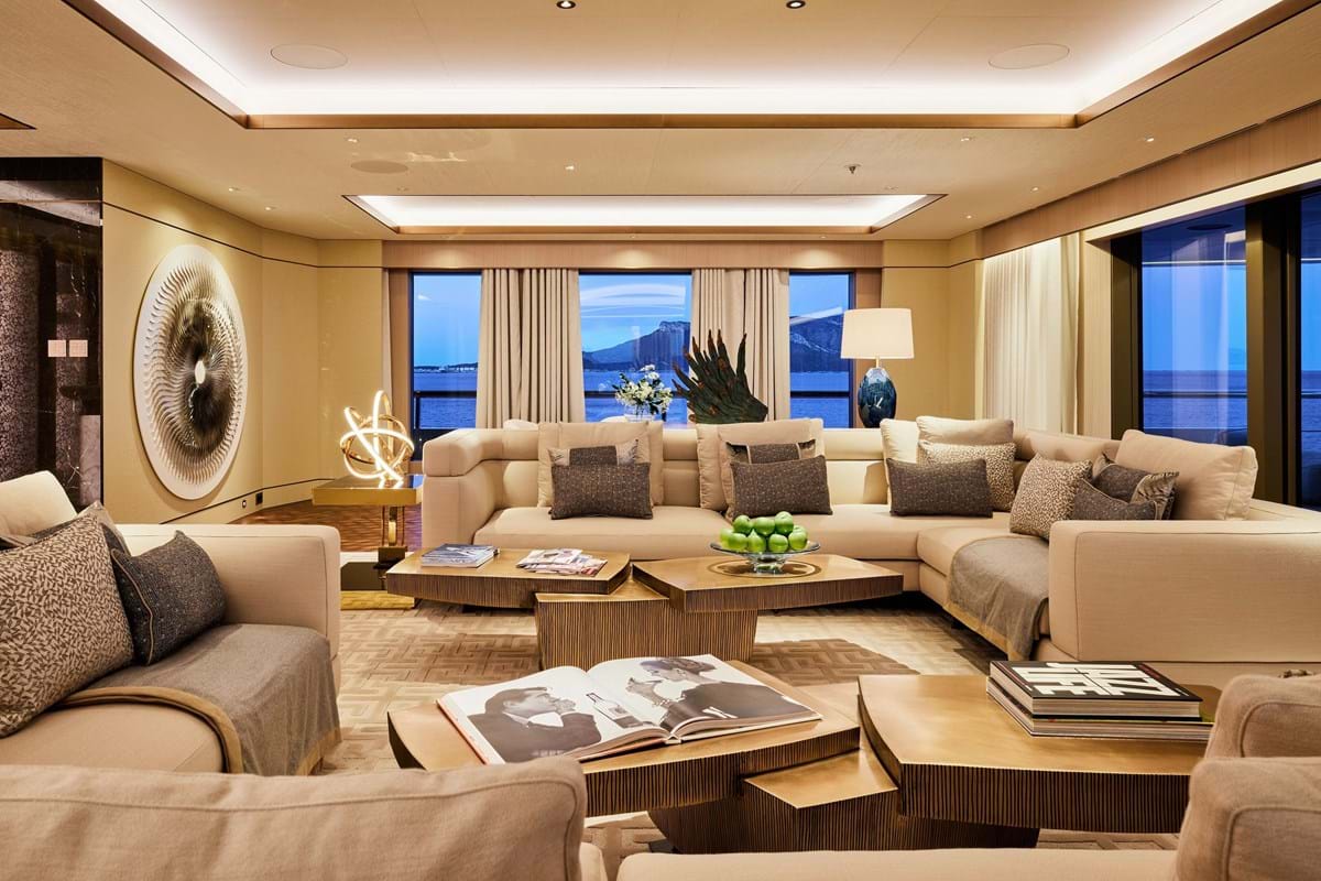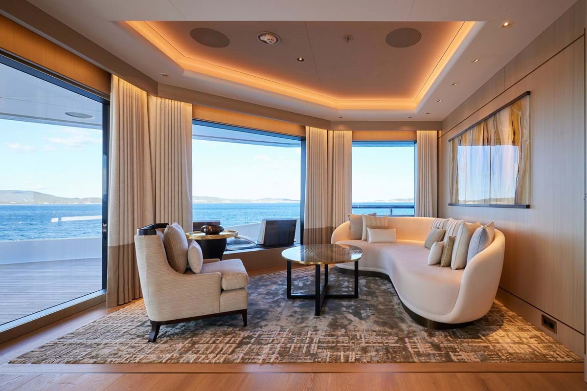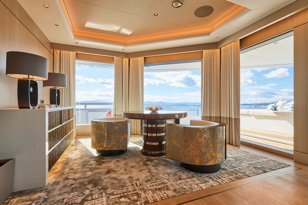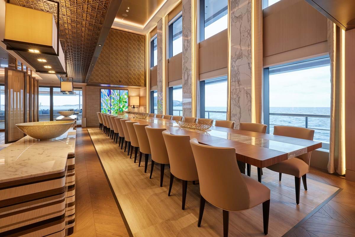 Designed by award-winning British studio Bannenberg and Rowell, the yacht’s interior is a sophisticated collage of neutral colours and rich textures across well-considered deck layouts ideal for a multi-generational charter or work conference – a dedicate business centre can support delegates with office facilities. The main deck dining salon can seat up to 19 guests with outstanding sea views, perfect for dinners or meetings. The adjacent salon is configured with intimate lounge settings and a double height ceiling. Another salon on the upper deck is light and airy with amazing views and a collection of elegant seating areas.