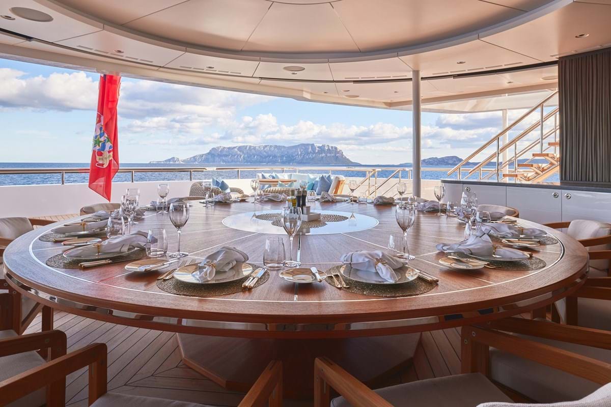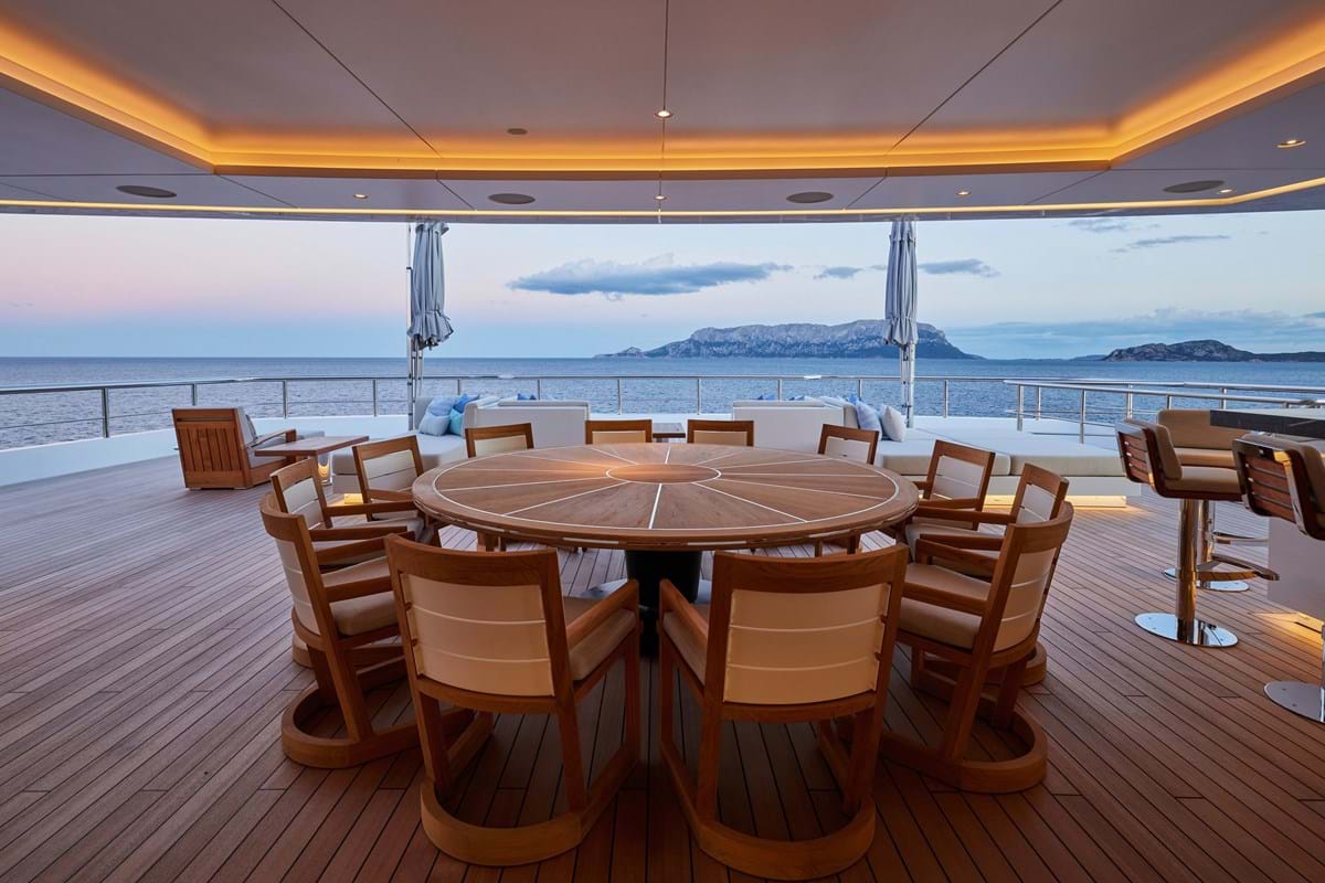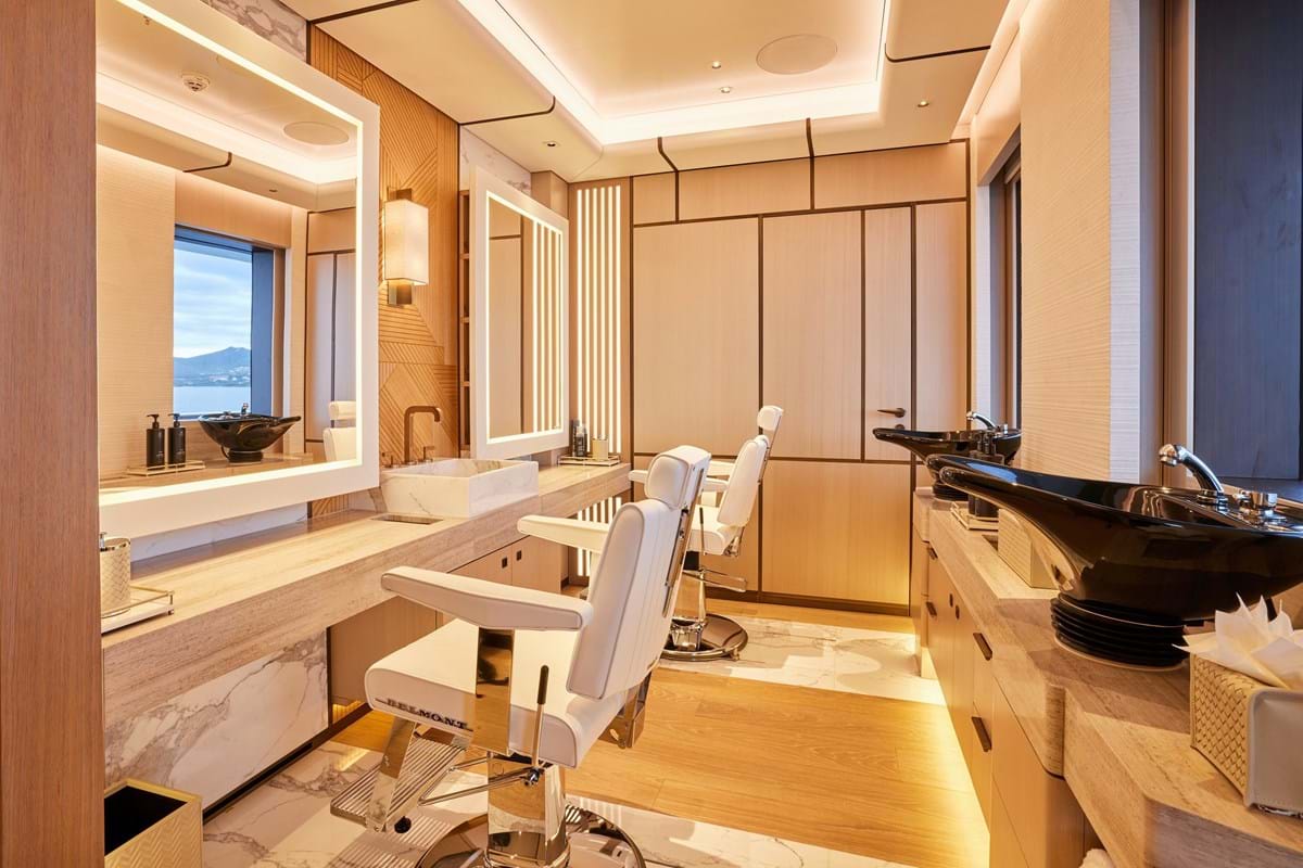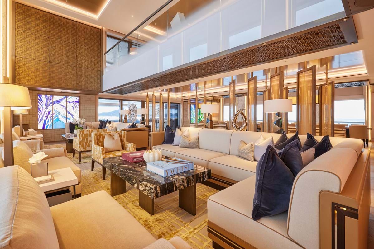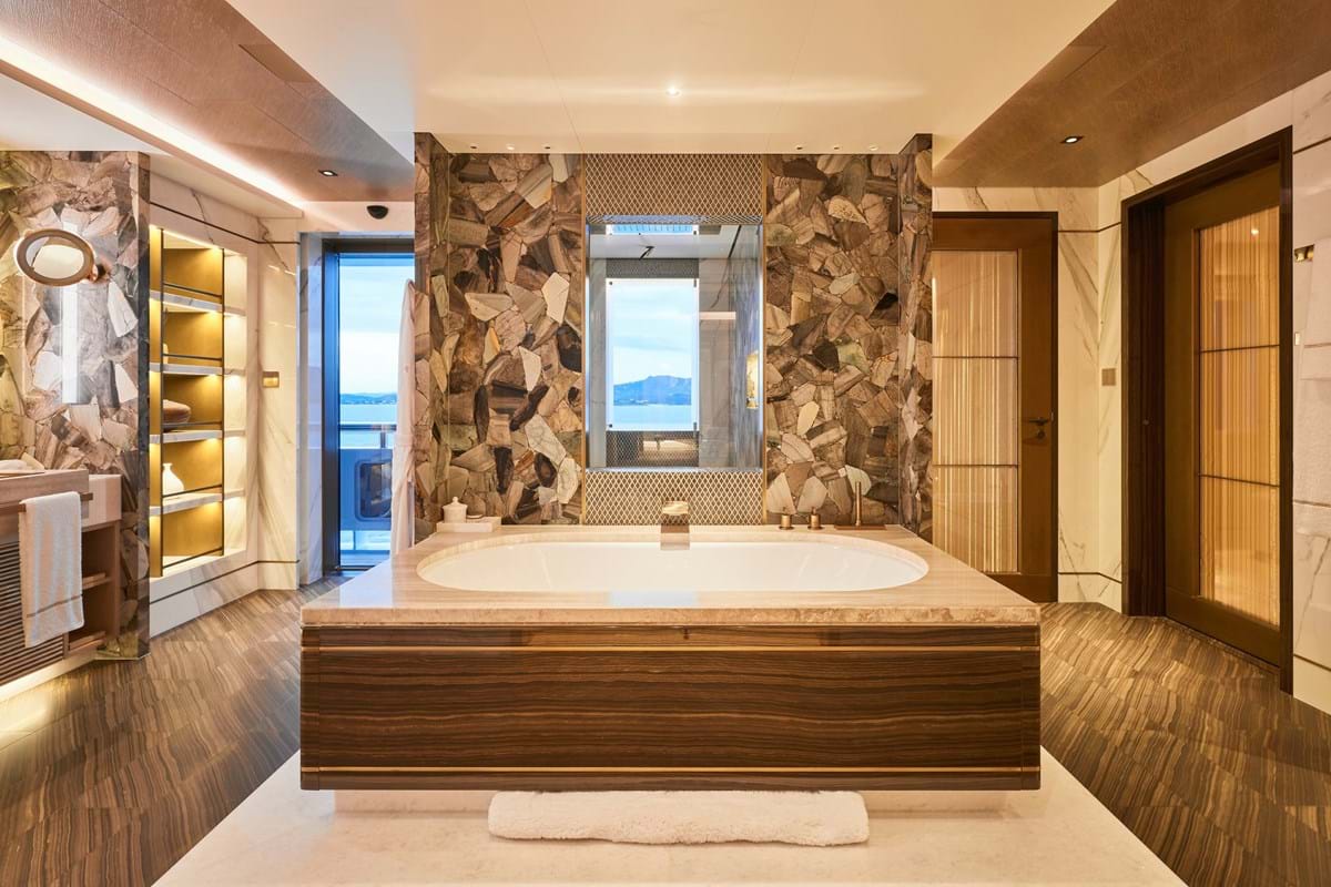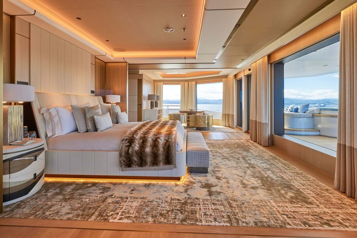 Designed by award-winning British studio Bannenberg and Rowell, the yacht’s interior is a sophisticated collage of neutral colours and rich textures across well-considered deck layouts ideal for a multi-generational charter or work conference – a dedicate business centre can support delegates with office facilities. The main deck dining salon can seat up to 19 guests with outstanding sea views, perfect for dinners or meetings. The adjacent salon is configured with intimate lounge settings and a double height ceiling. Another salon on the upper deck is light and airy with amazing views and a collection of elegant seating areas.