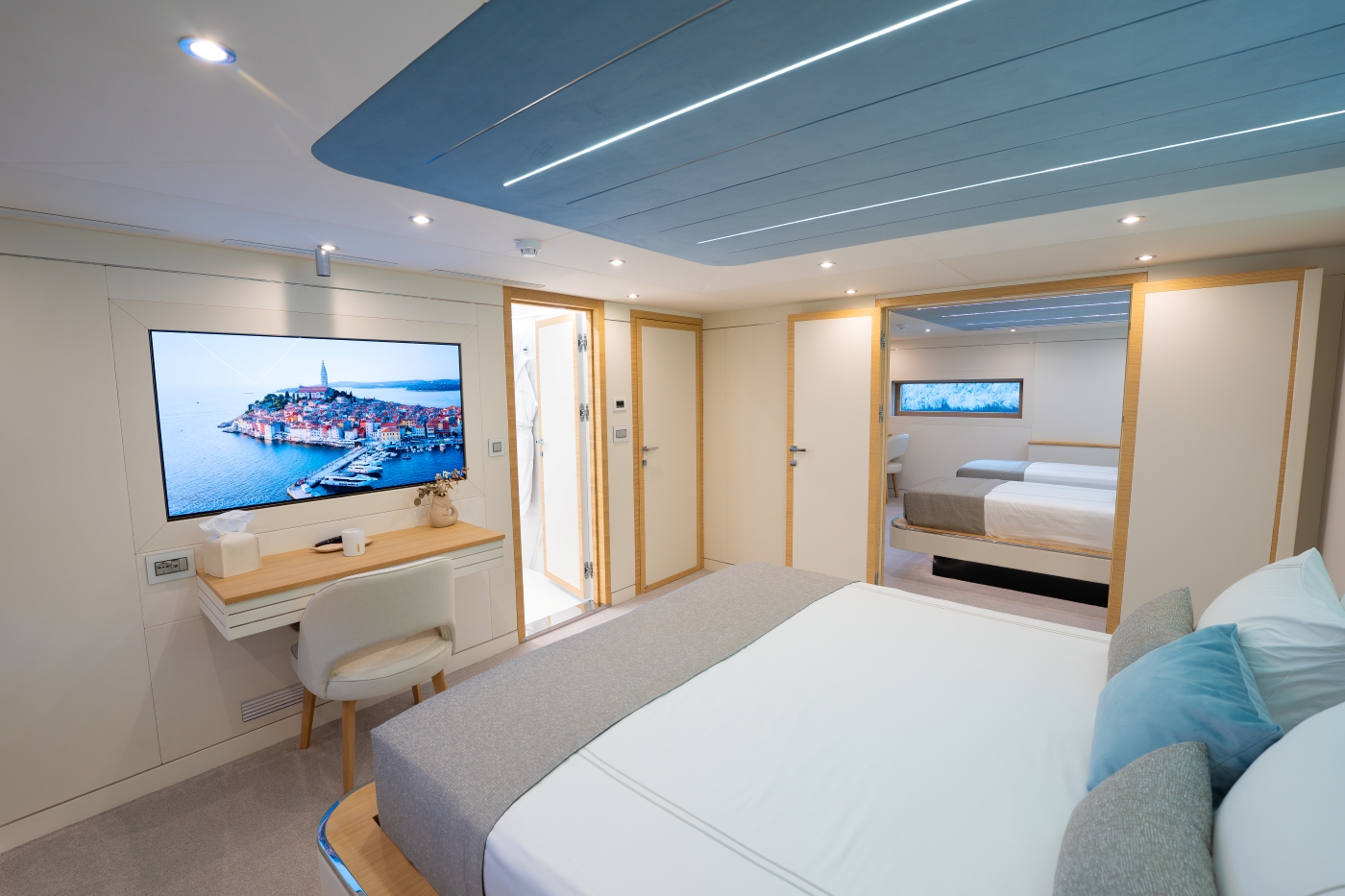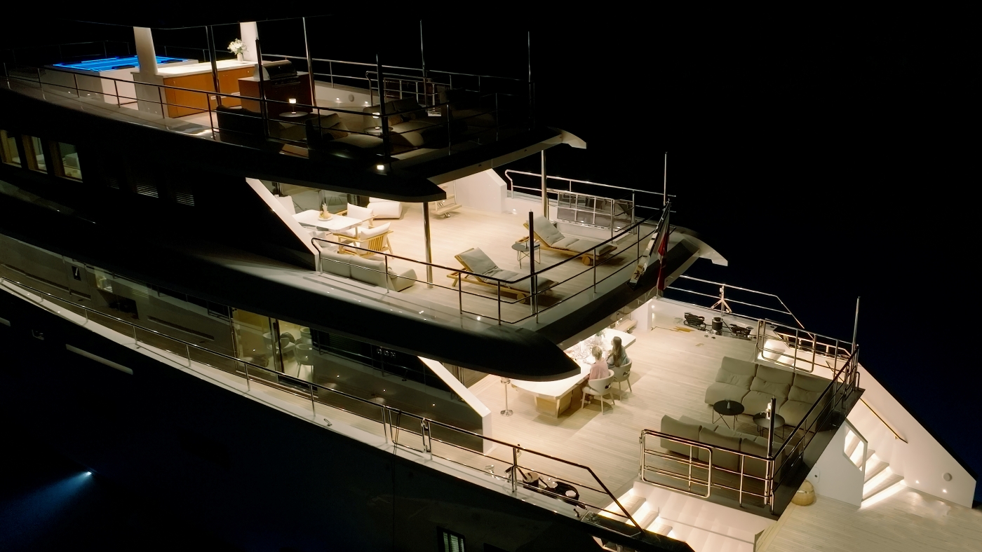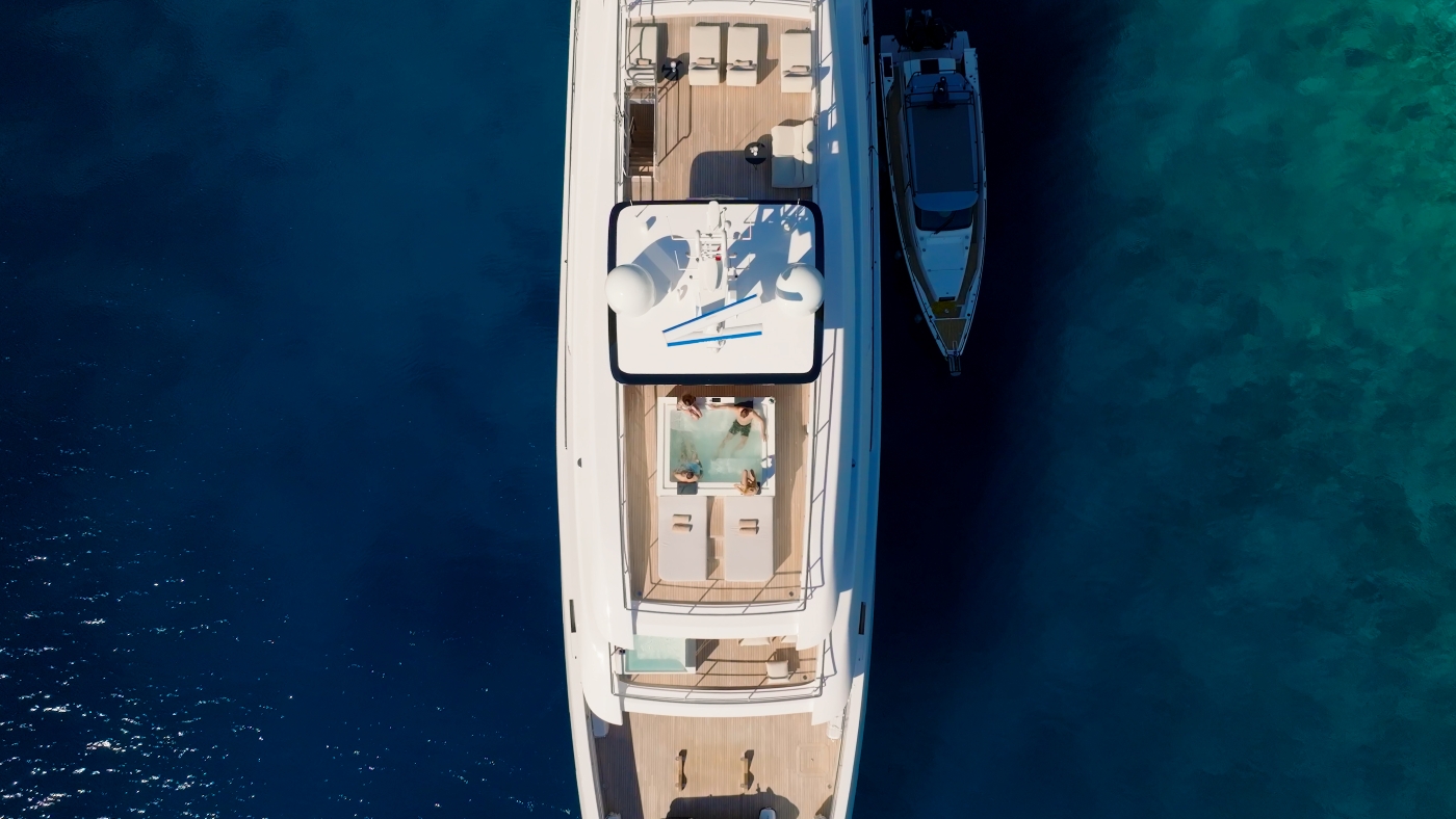 The upper deck is dedicated to the owners with the aft offering a private terrace with curved, built-in seating. Forward is a small terrace with a private jacuzzi and views over the bow.