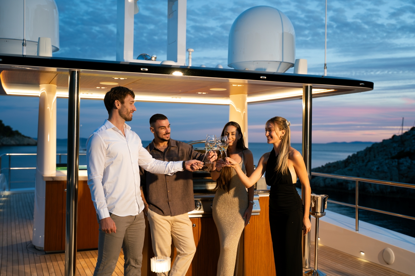 Across the four exterior deck levels RENATA is a luxury al fresco haven for relaxation and entertainment. The sun deck makes the most of the views with a zone for sunbathing, a jacuzzi a built-in seating area aft.