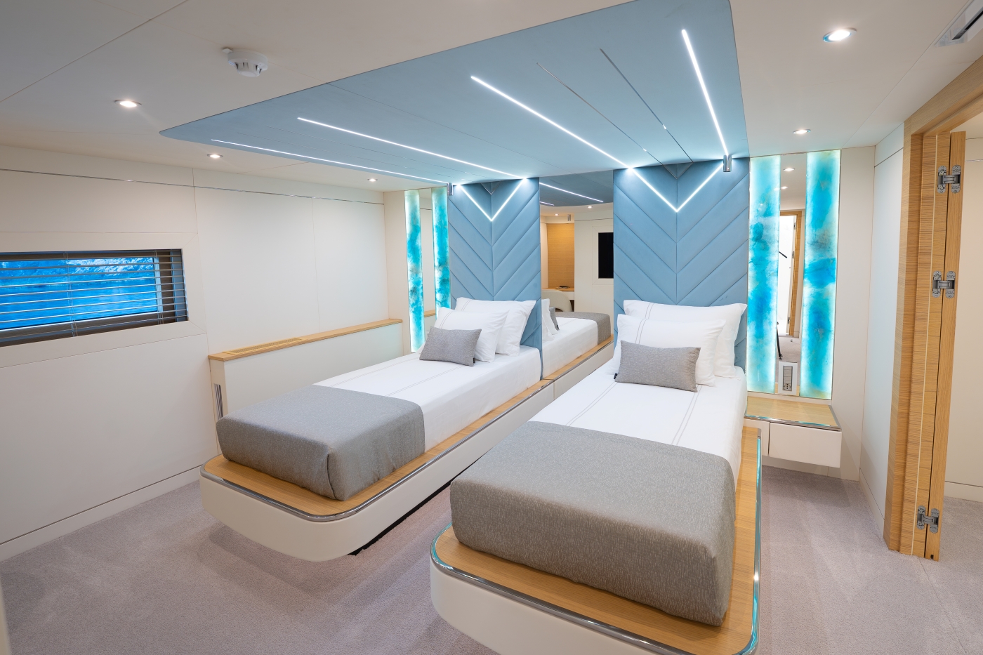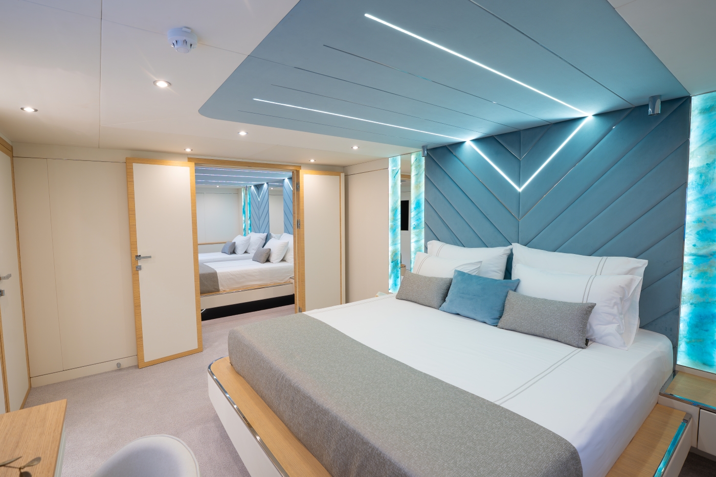 She offers spacious and private accommodation for up to twelve guests in six suites. The master suite is located on its own private deck and features a balcony with a jacuzzi on one side and a cozy coffee area on the other. Meanwhile, on the lower deck, you'll find four double cabins and one twin cabin, each with an en-suite bathroom, ensuring every guest has a personal retreat.