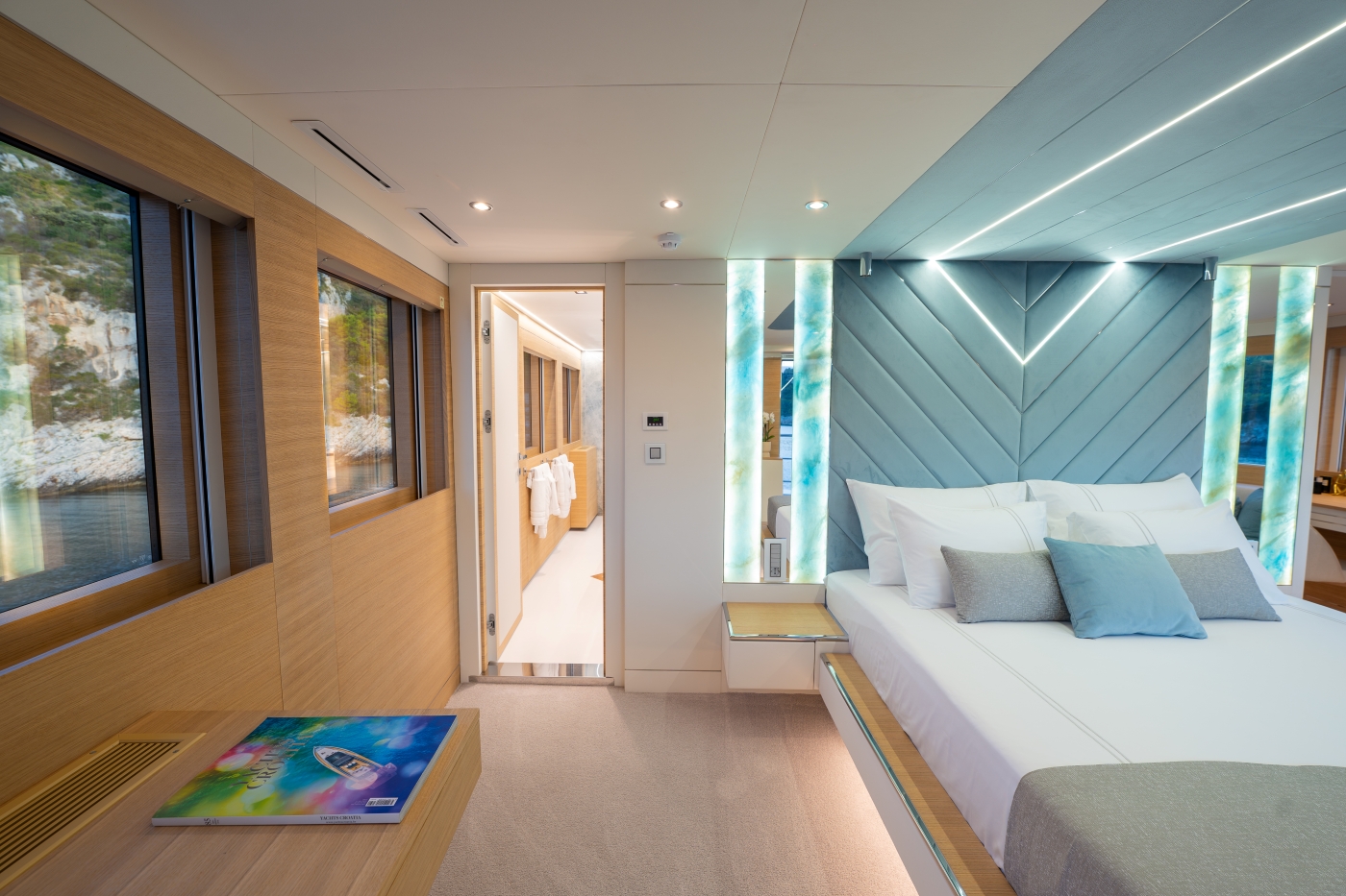 On the main deck, there’s an elegant salon, perfect for relaxing, socialising and enjoying formal dining experiences. The galley, captain’s cabin and the bridge are located forward on the main deck.
