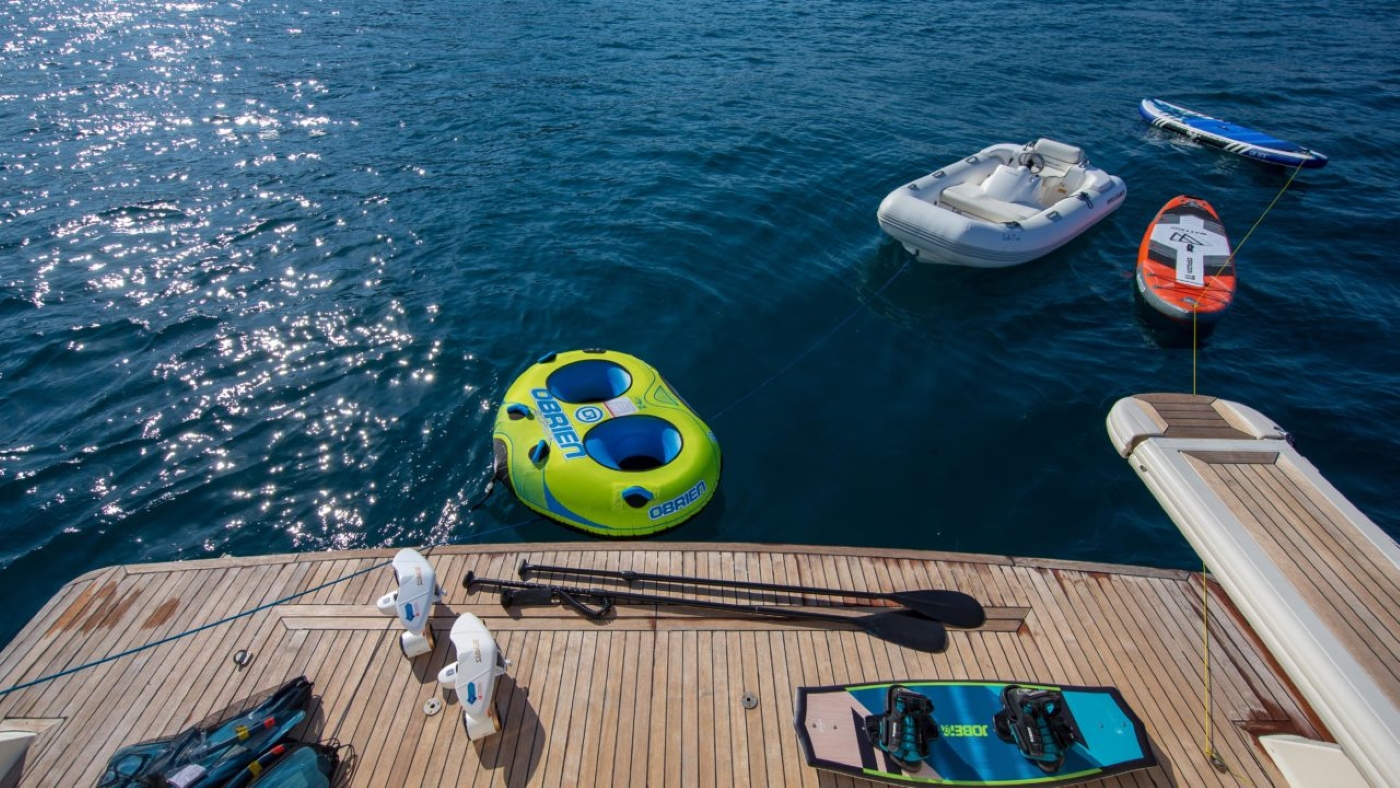 A staircase to port leads down to the main deck aft offering an alternative al fresco dining space and access around to the sunpads on the foredeck. The swim platform is also reached from here and can be used by guests when at anchor or as tender storage when travelling between anchorages.
