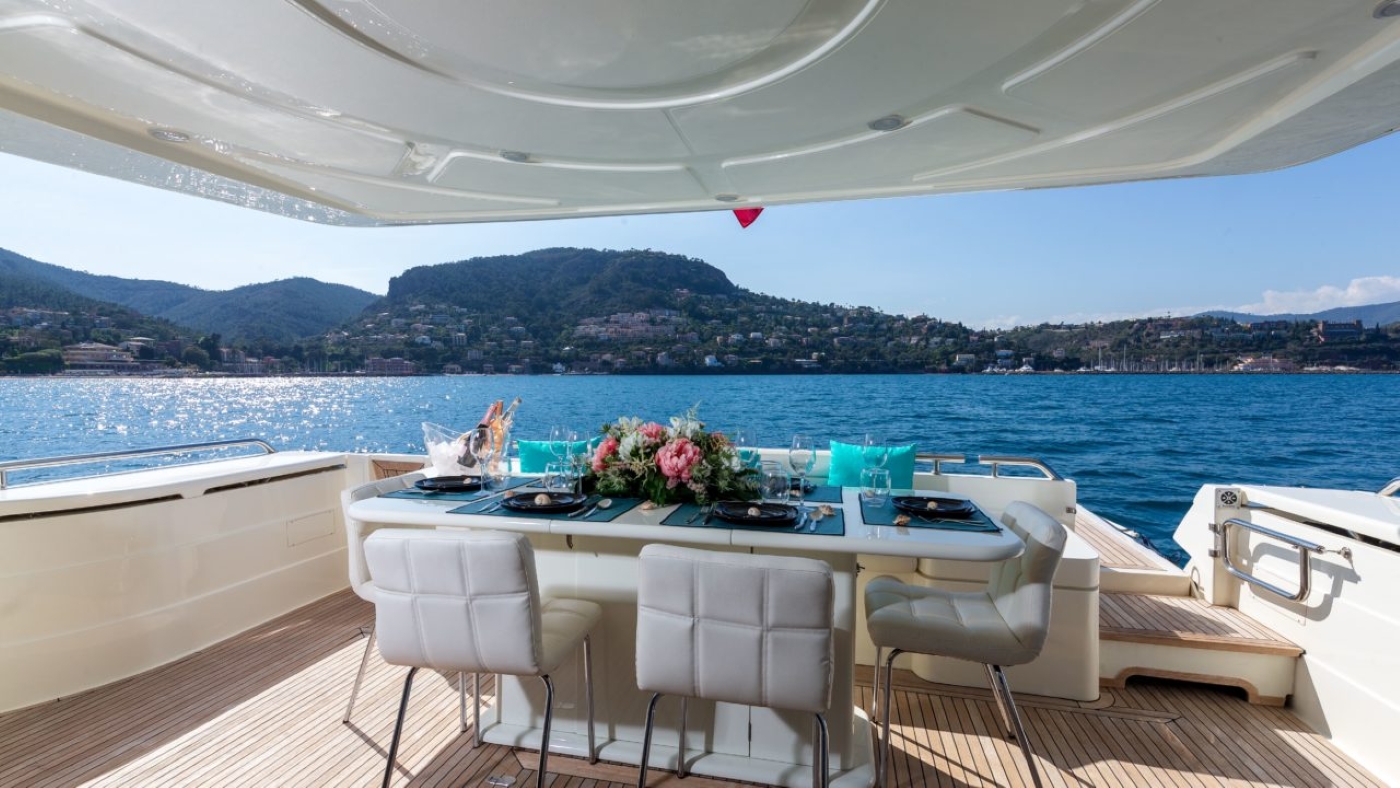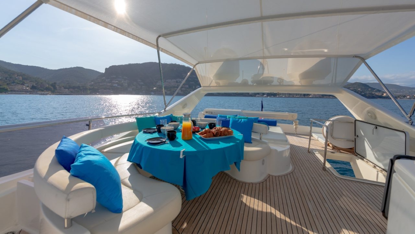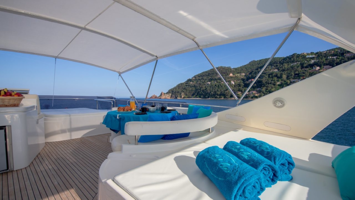 The spacious flybridge provides guests with an ideal location to gather and enjoy the far-reaching views, sunbathing opportunities, and al fresco dining. The soft bimini can be left open or closed to protect against sun or less favourable weather. A helm station on this deck ensures guests can easily interact with the captain.