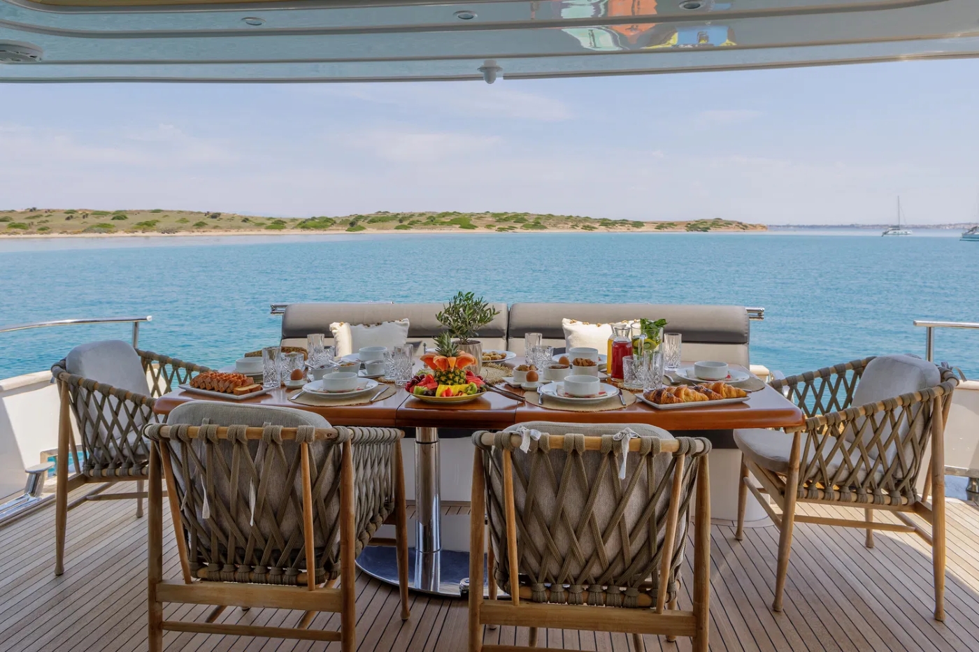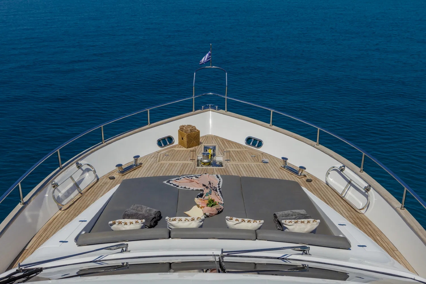 The broad swim platform has enough space to store a tender and has plenty of room for sunbathing beside the water. Two stairs lead up to the main deck aft, where a raised table, stern sofa and additional chairs create a relaxing alfresco dining area. Below the helm station on the bow, guests have a large sunpad to stretch out on and take in the sweeping forward views.