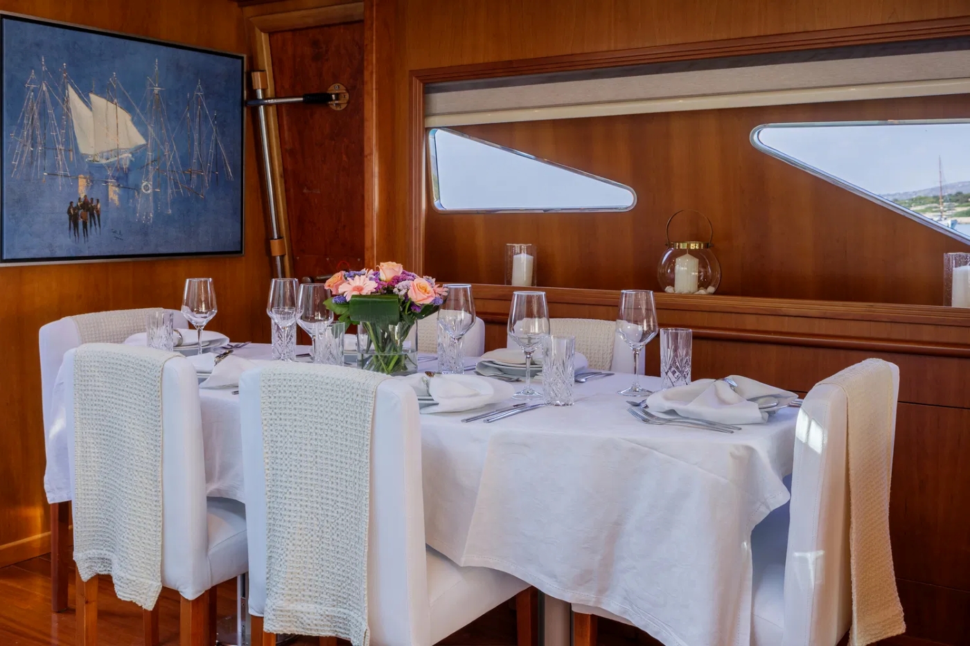 The accommodation sleeps a maximum of 10 guests over 4 en-suite cabins: 1 Master suite, 1 double cabin and 2 twin cabins. The crew of 4 will ensure that all guests receive a stellar service throughout the cruise.