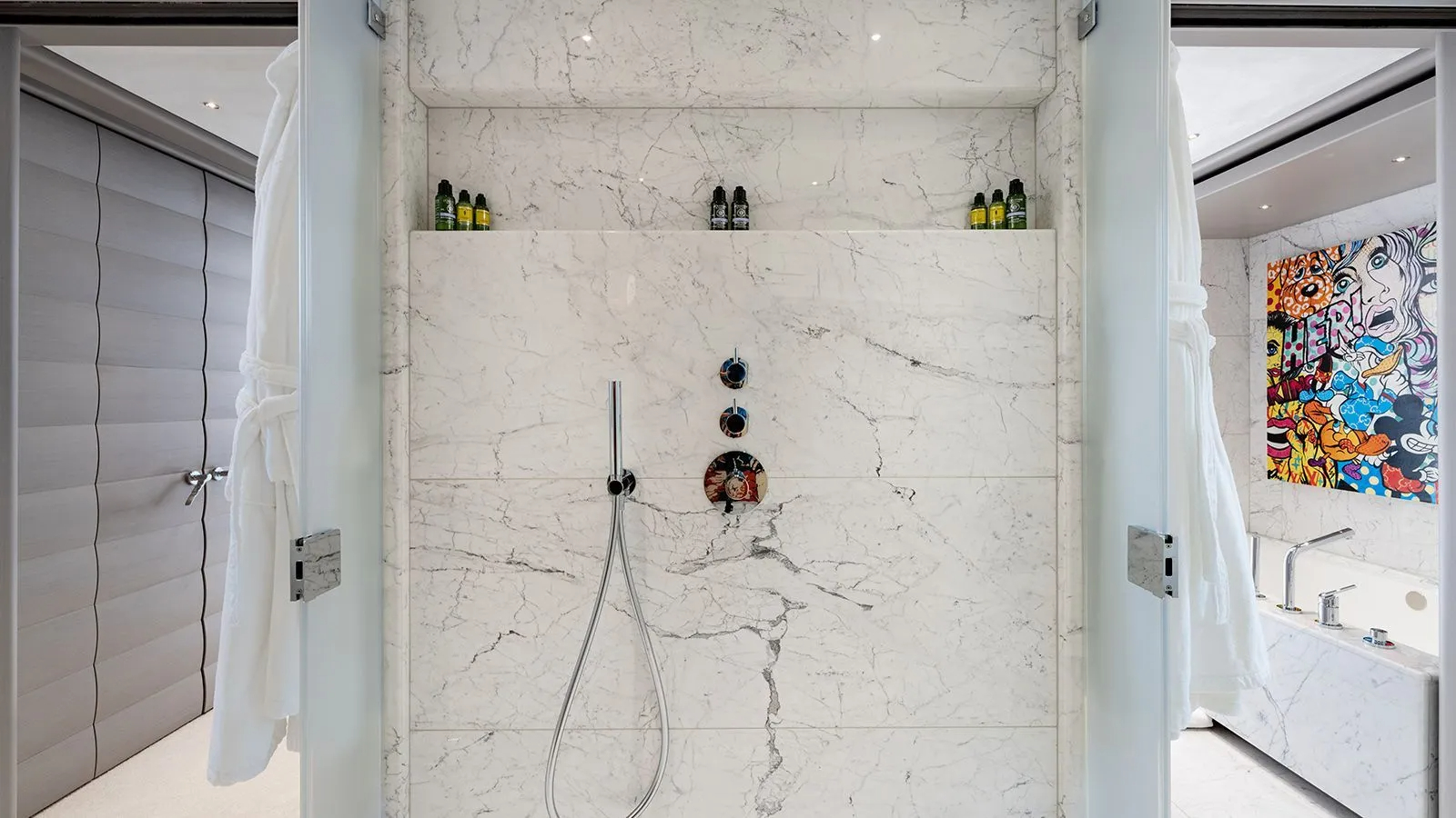 The glorious master suite is forward on the main deck with a king-sized bedroom, lounge area and office space. A private fold out balcony to port creates a lovely quiet space for primary guests to have a coffee or sun downer. The huge forward ensuite has everything guests could wish for, his-and-hers areas, a central shower, stand along bathtub and dressing area. The upper deck offers a very private VIP cabin amidships on the upper deck on the starboard side with great views, private ensuite and open light feeling. On the lower deck are two further VIP suites and two flexible double/twins, again with luxurious and private ensuite bathroom facilities. The generous crew area is forward on the lower deck with a spacious crew mess and ensuite cabins.