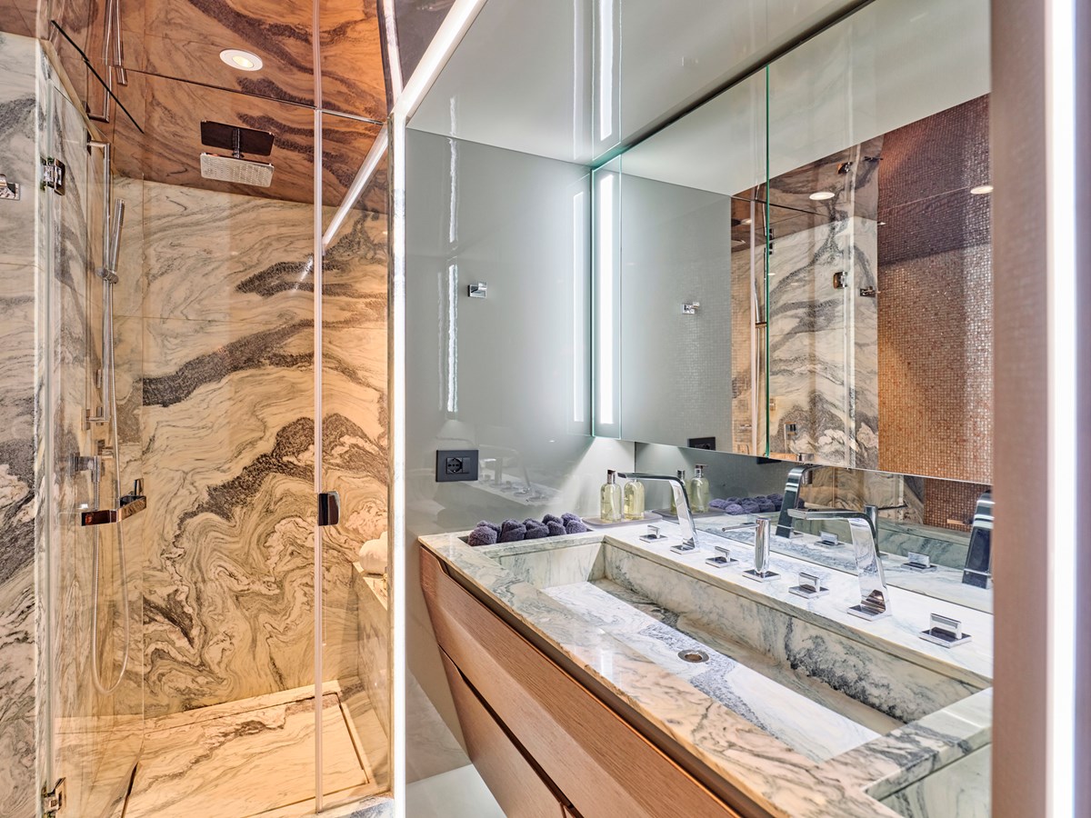 Five guest suites offer accommodation for up to ten and are configured as a main deck master, two lower deck doubles and two lower deck twins. The master suite features a forward-facing bed which makes the most of the views and access onto the outside deck on the starboard side. A deluxe ensuite bathroom completes the suite which is very private for primary charter guests. The two equal sized doubles and twins all benefit from the luxury and privacy of ensuite bathroom facilities.
