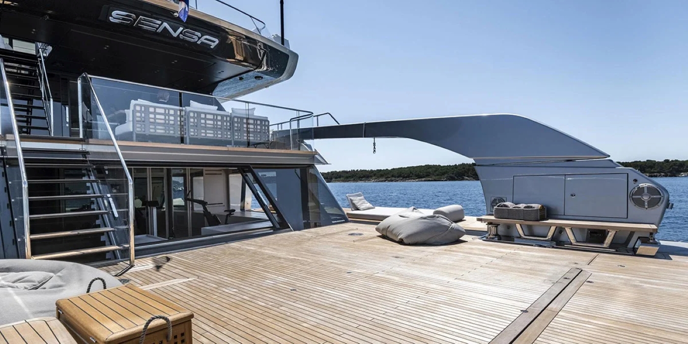 NOTABLE FEATURES OF SENSA: ~90sqm beach club with gym ~Fold-out side wings ~Separate dining room and salon ~Superior tender and toys ~At anchor and underway stabilisers ~Air conditioning ~WiFi