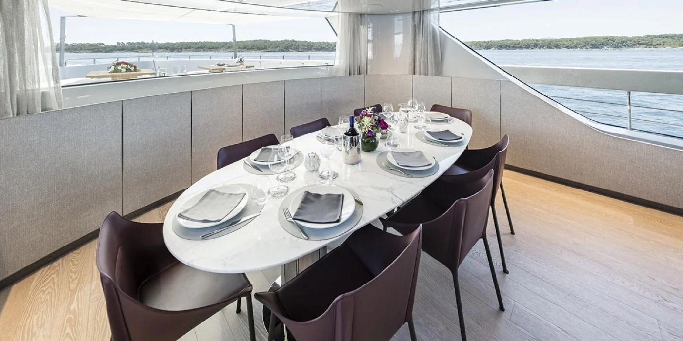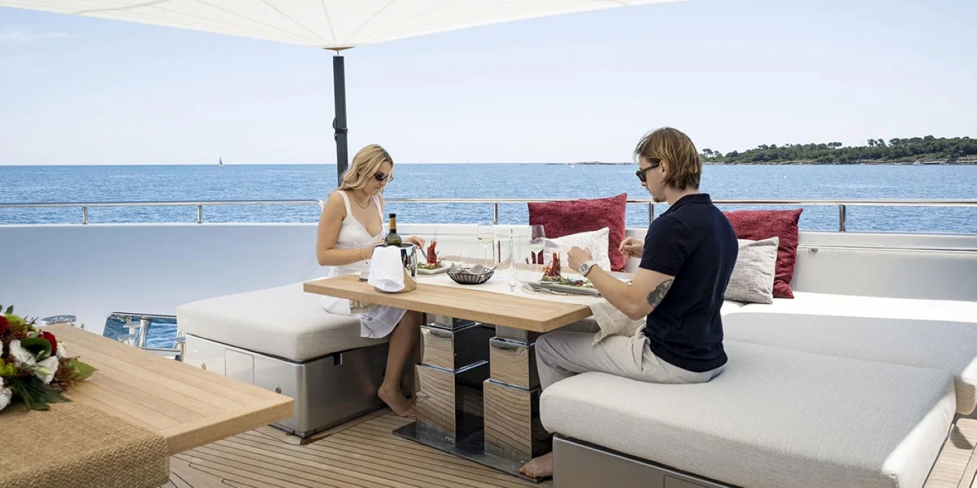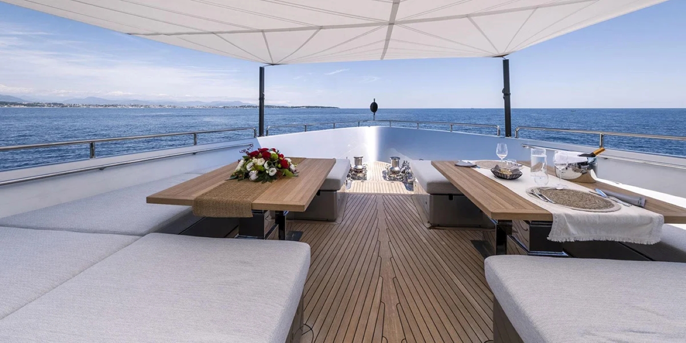 On the foredeck there is an additional dining area perfect for relaxing dinners on deck.