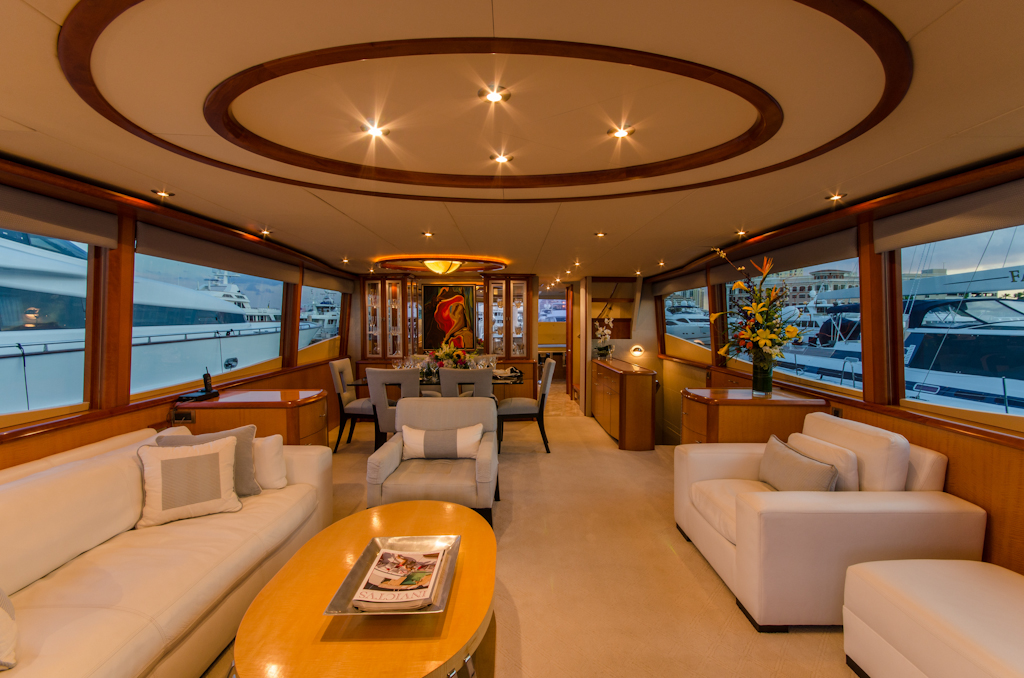 Crewed charter yacht SERENITY features a warm contemporary interior decor, with a timeless elegant ambiance. The salon offers a large plush sofa, ottomans and occasional chairs, set within modern warm wood panels, neutral carpets and ambient lighting. Forward of the salon is the formal dining, featuring a glass table flanked in high back dining chairs for maximum comfort. The salon boasts elongated side windows with neutral toned roman shades, for optimum privacy.