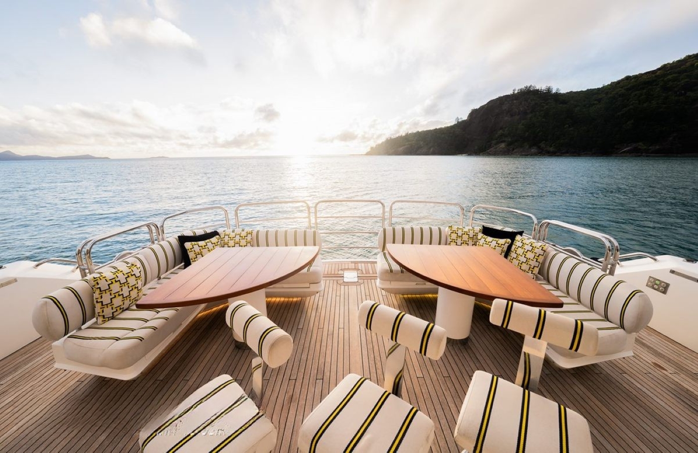 On the foredeck, a C-shaped sofa and raised alfresco dining table in the panoramic forward views, and after a meal guests can rest on the sunbed covering the bow.