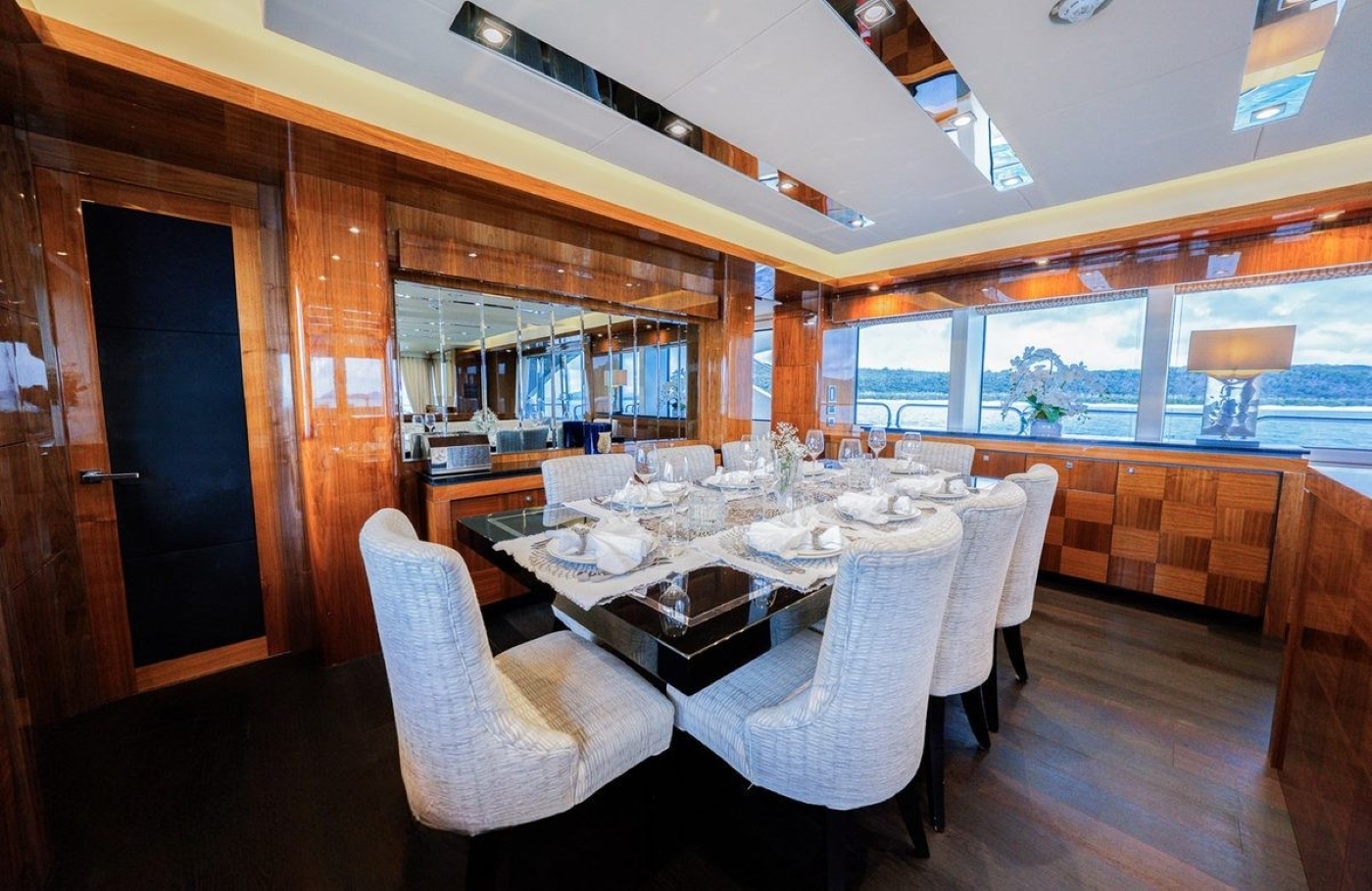 The main deck places the full-beam Master suite forward with an en-suite bathroom in front and a walk-in wardrobe behind. The galley is positioned amidships and a crew corridor allows for quick and efficient service in the formal dining area, where an elegant table seats up to 10 guests who have excellent views out of the port and starboard windows. The aft lounge has glass sliding doors out onto fold-down terraces to both sides, and a pair of sofas and four armchairs face in around a centrepiece coffee table.